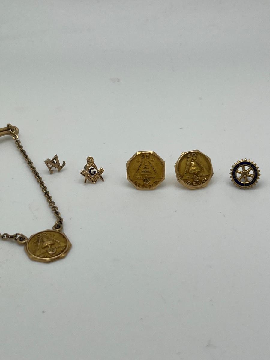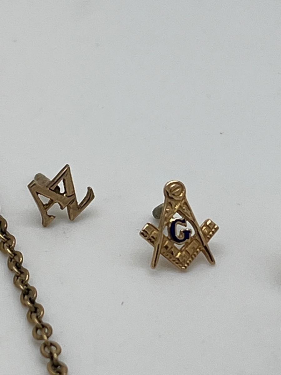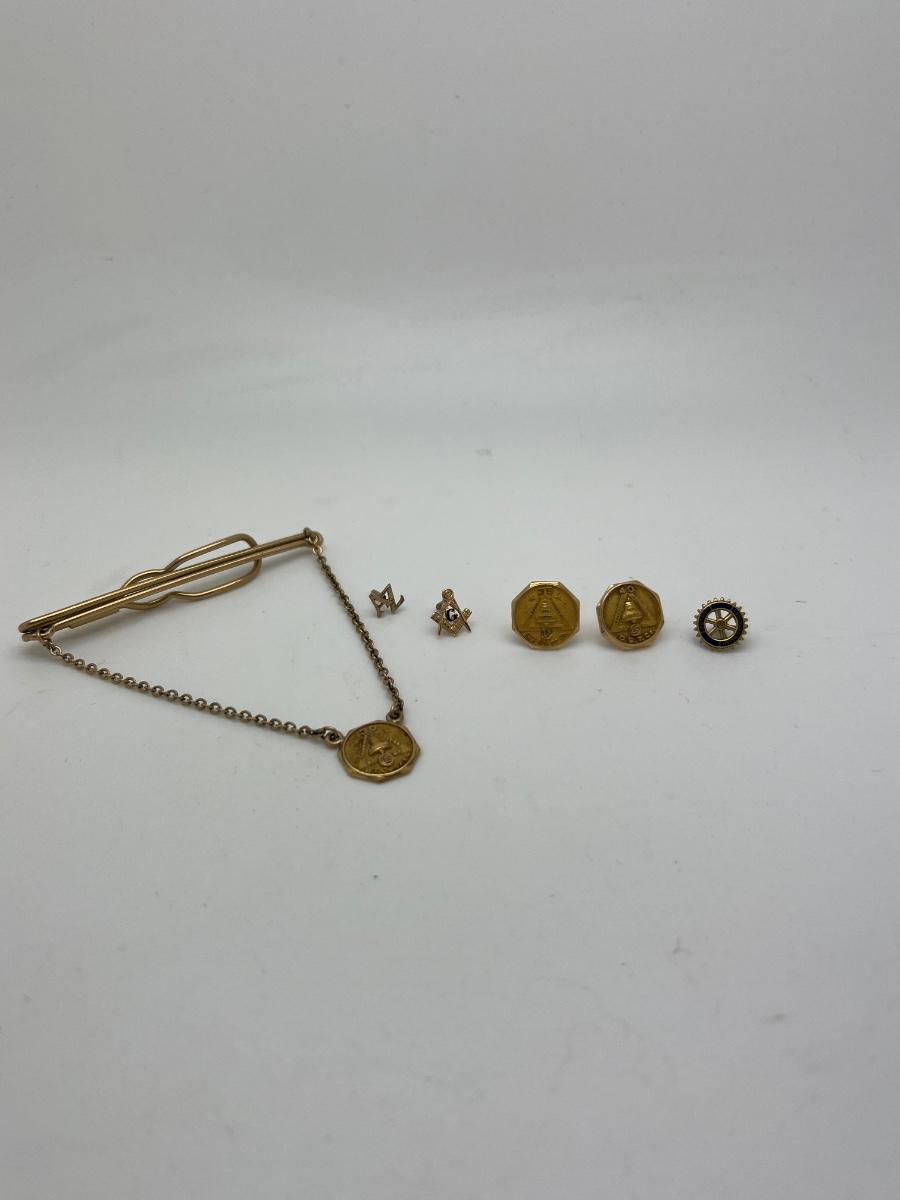 All tie tacks are marked 14k. There are 3 Telephone Pioneers tie tacks for 30,35,40 years of service and one rotary enamel tie tack one Masonic tie tack and one sorority “AZ” tack. The tie bar is not gold but the medallion is marked 14k