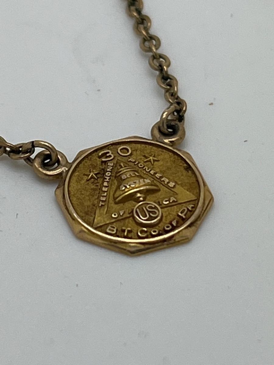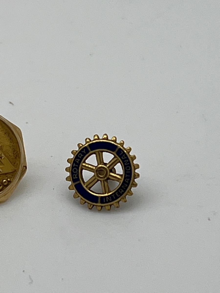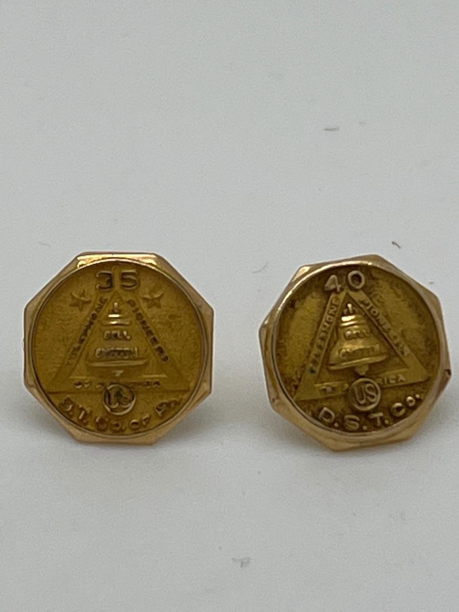 All tie tacks are marked 14k. There are 3 Telephone Pioneers tie tacks for 30,35,40 years of service and one rotary enamel tie tack one Masonic tie tack and one sorority “AZ” tack. The tie bar is not gold but the medallion is marked 14k