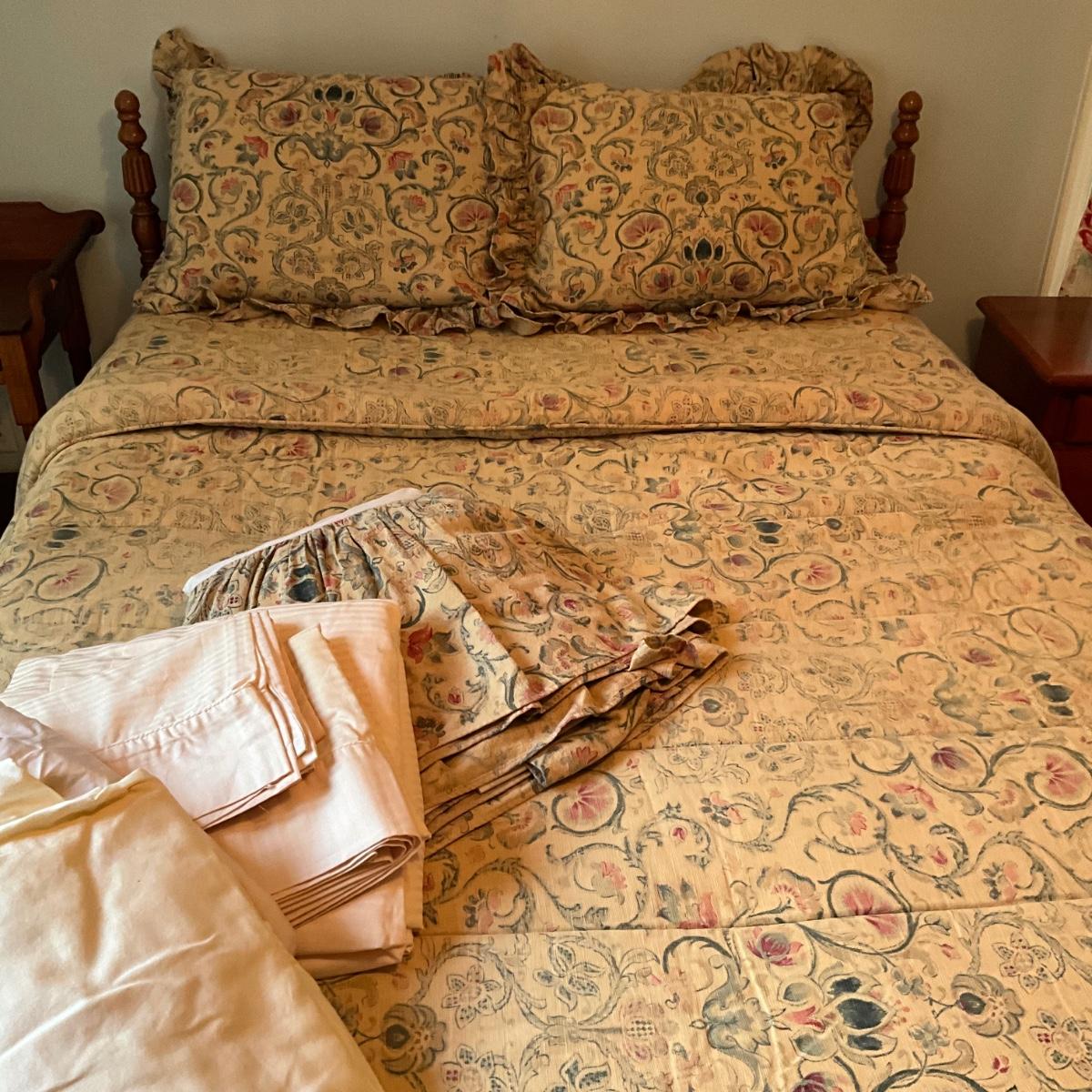 Comforter, 2 shams, bedskirt, two sets of off white king sheets