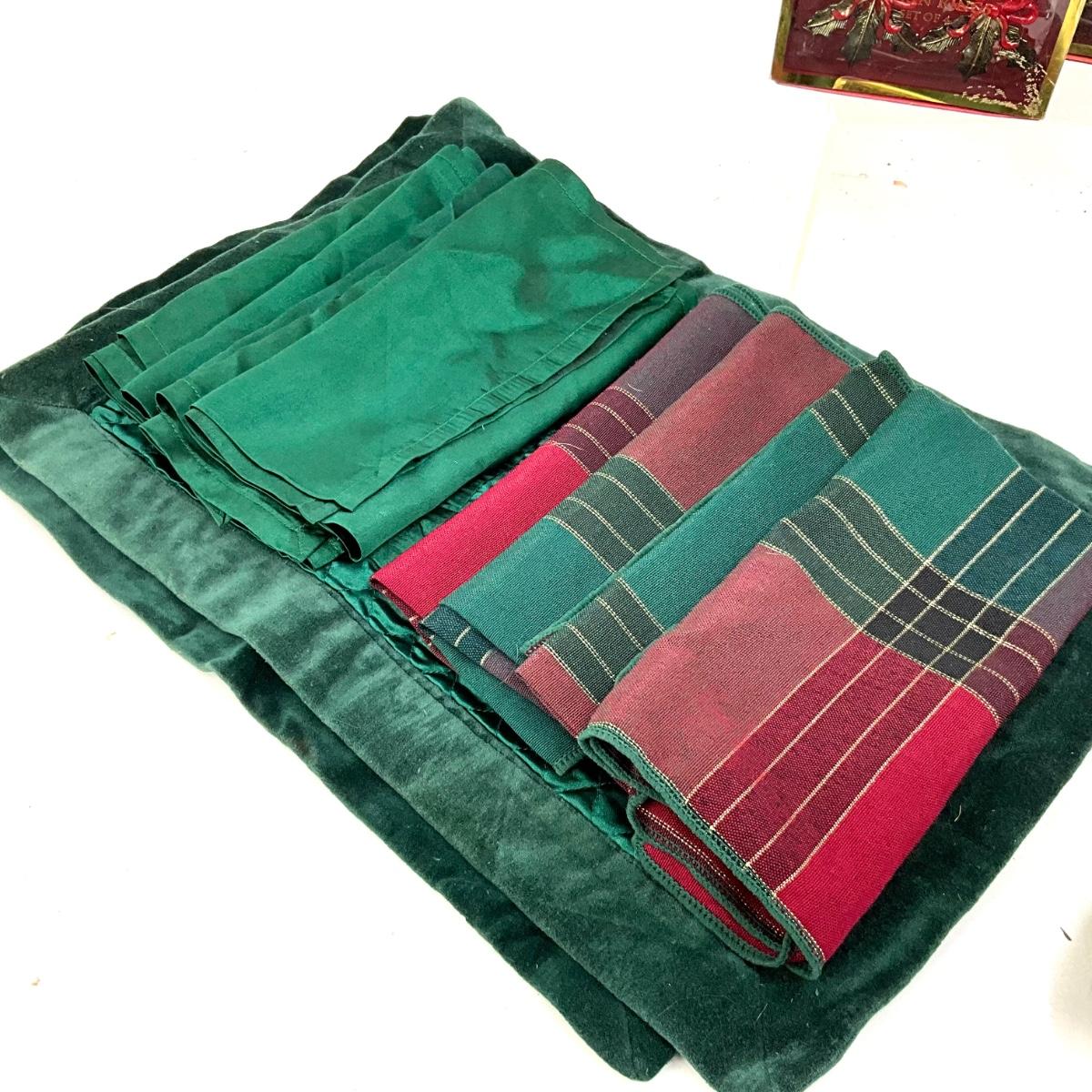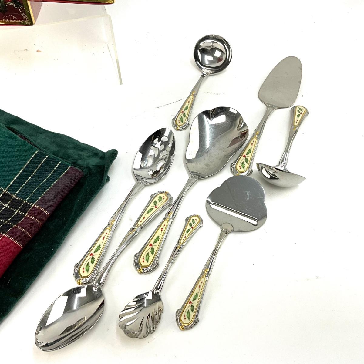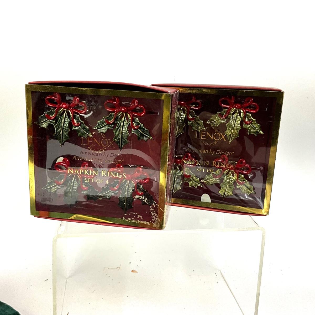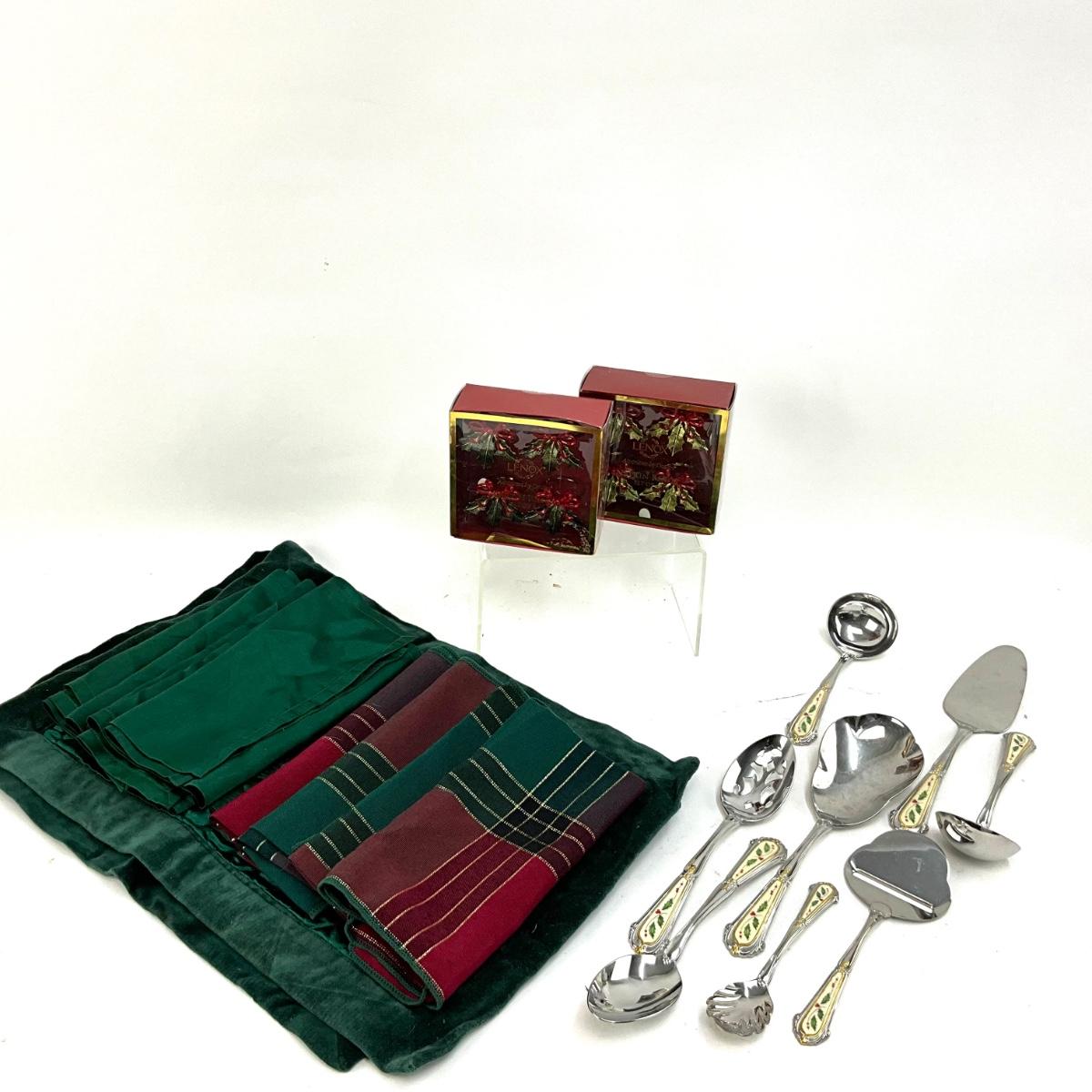 Two sets of 4 napkin rings with 8 serving utensils in the lenox holiday pattern, with green placemats and satin napkins (some have spots)