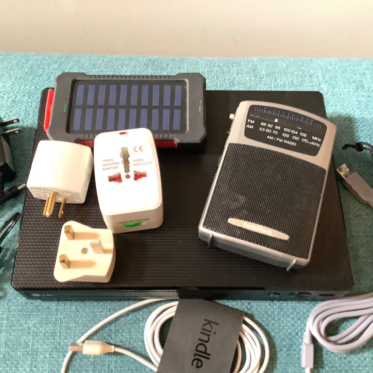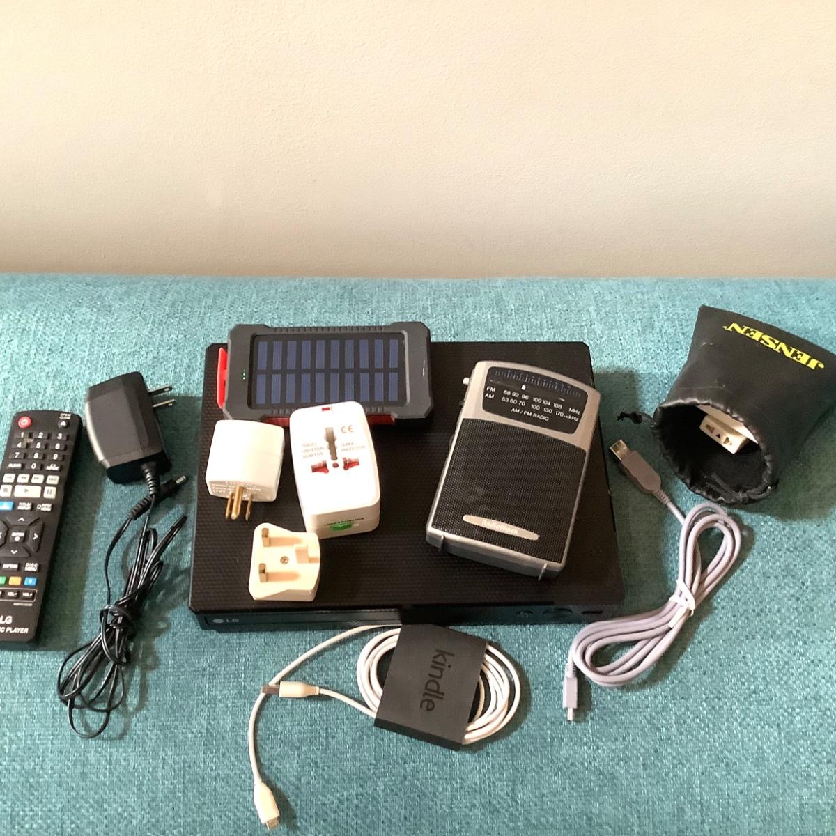 The lot contains an assortment of electronic items, the LG Blue Ray DVD player with remote, travel adapters, kindle charging cord, handheld radio and more.....