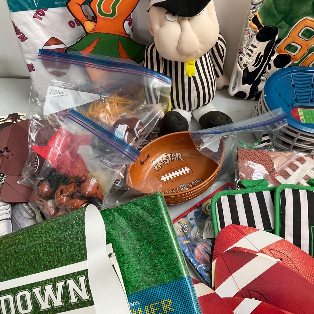 paper products , plastic bowls, tablecloths, banner paper football players