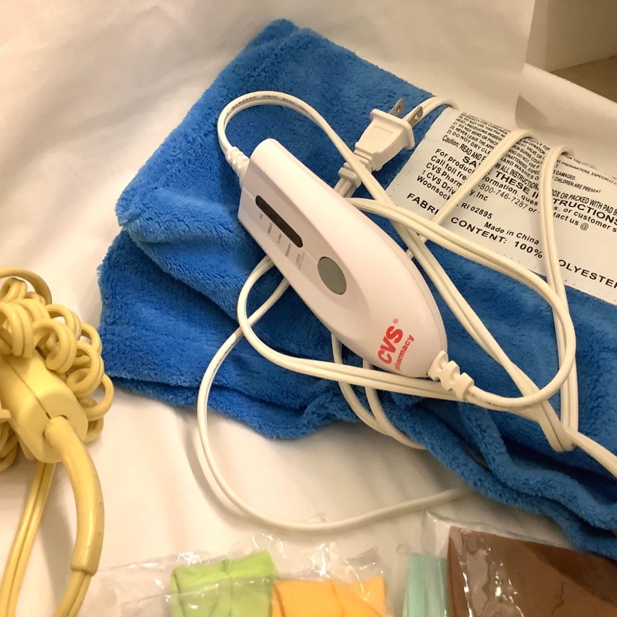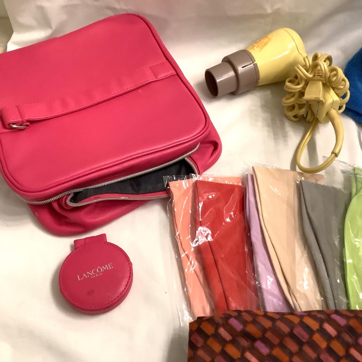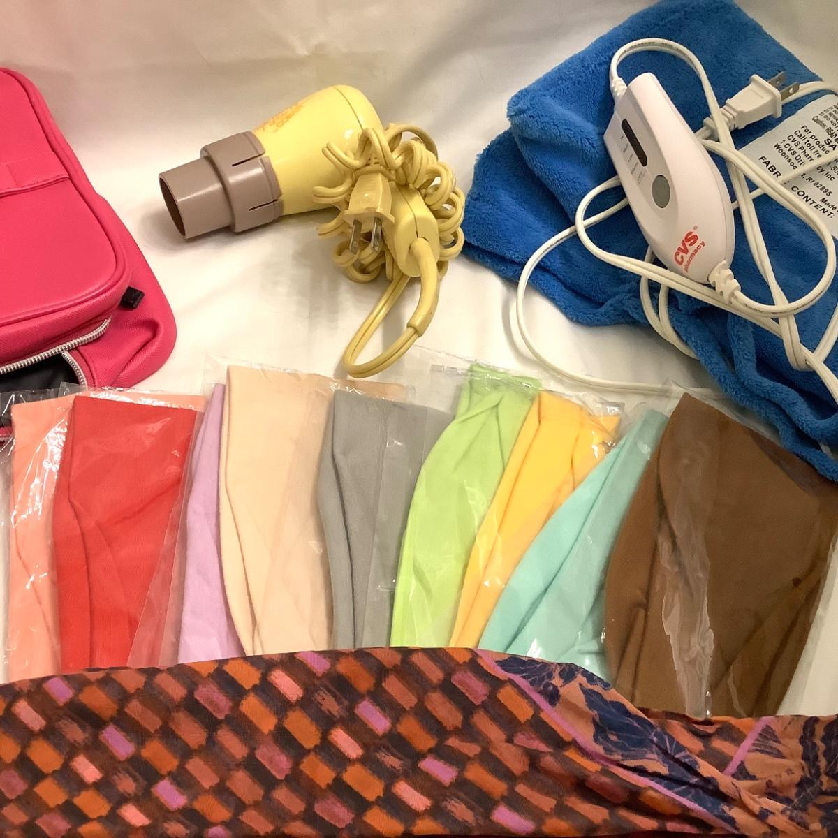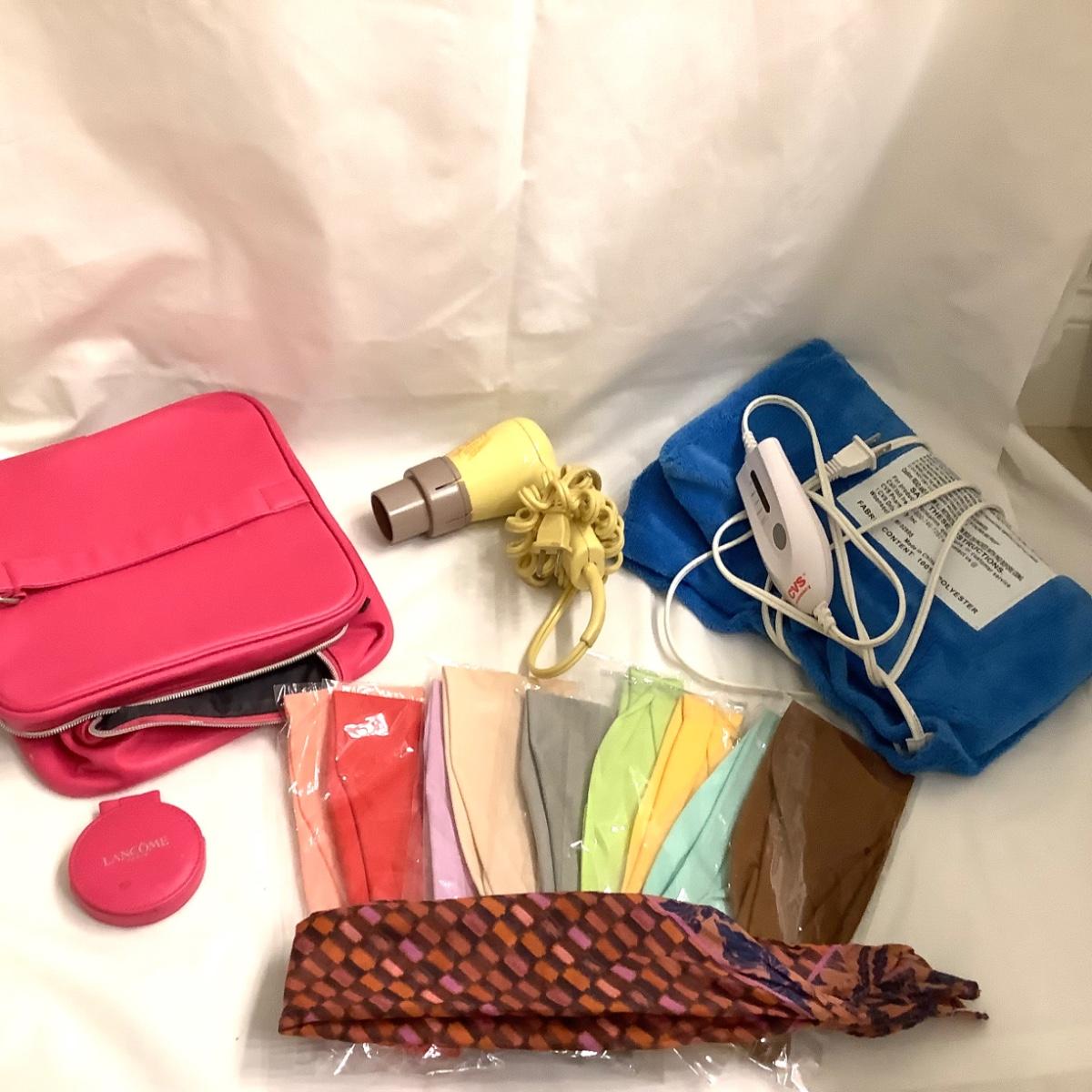 Lot contains, CVS heating pad, pink lancome make-up case, small yellow conair hair dryer, 10 new head wrap/hair bands.