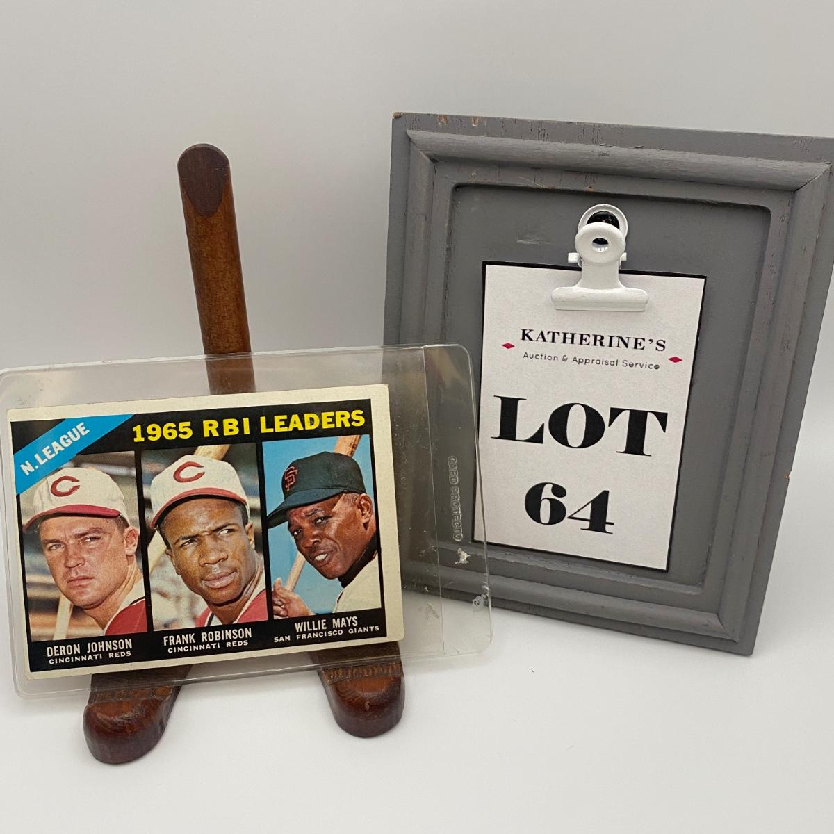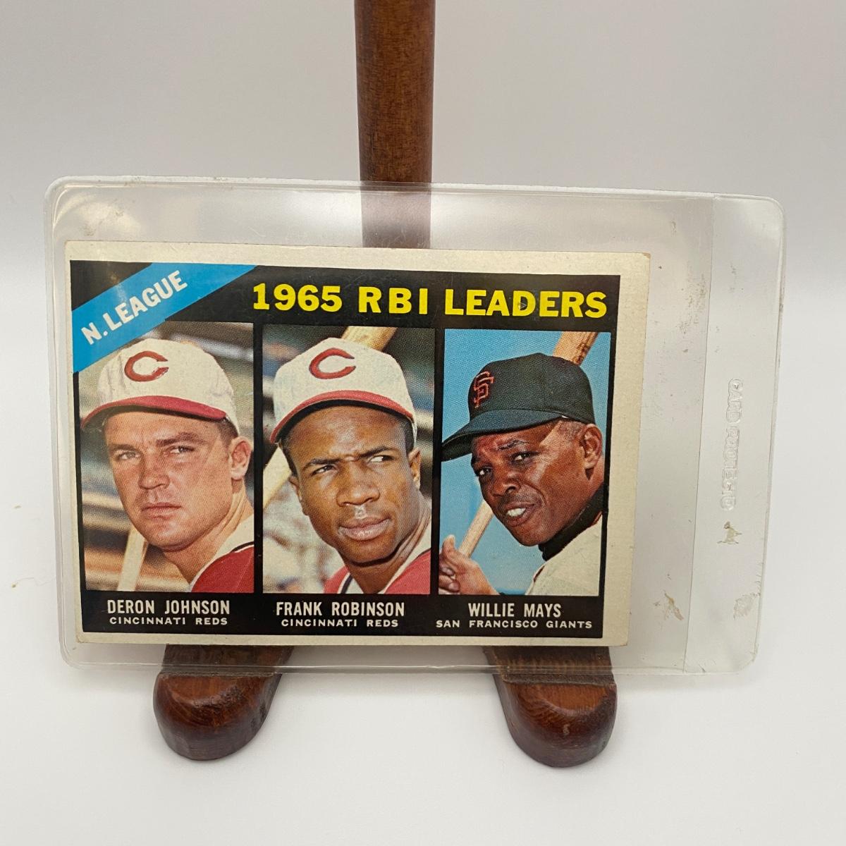 One 1965 RBI leaders card with Cincinnati Reds Deron Johnson, Cincinnati Reds Frank Robinson, and San Fran Giants Willie Mays. Please see photos for details and condition. ::: Shipping is available on this lot. If you require shipping you must let us know at the close of the auction. We will coordinate with you after the item has been won. Shipping fees will include insurance up to or exceeding the value of all items being mailed. If you have any questions regarding this lot please contact the auctioneer either via this website, by direct email or by phone. PICK UP TIMES and other important information can be found in the TERMS and DESCRIPTION of the auction. Please take a look for pertinent information. Thanks!