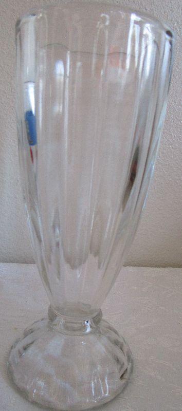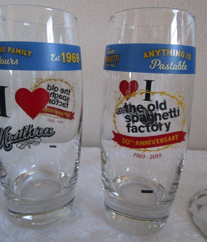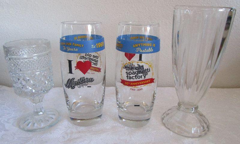 Libbey 12 oz Footed Ice Cream Soda Glass, Clear, 7.5"; 5.5" footed glass, clear; 2- The Old Spaghetti Factory 50th anniversary glasses 6.5" tall