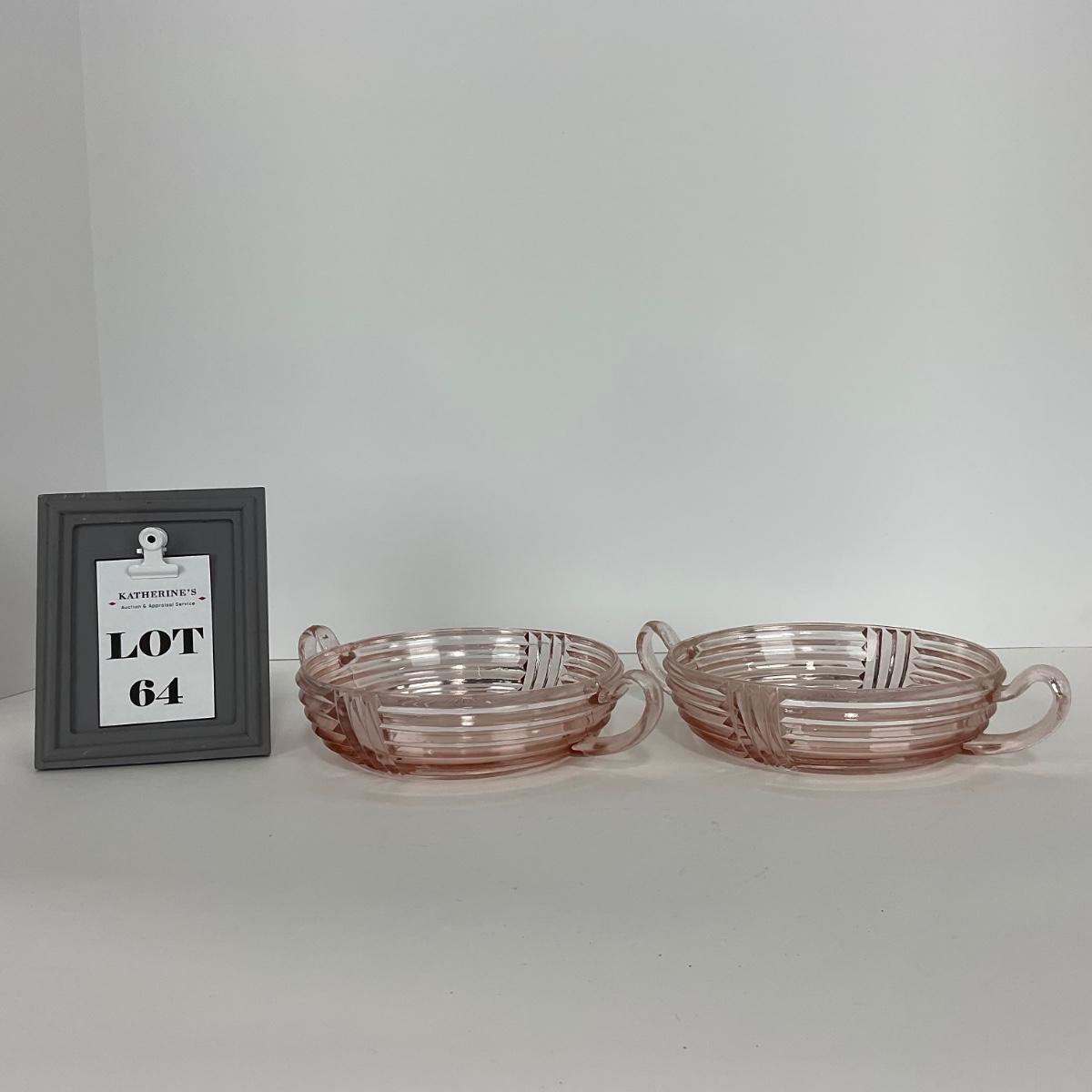 Two Anchor Hocking pink two handled relish bowls in great shape. Please see photos for details and condition. ::: Shipping is available on this lot. If you require shipping you must let us know at the close of the auction. We will coordinate with you after the item has been won. Shipping fees will include insurance up to or exceeding the value of all items being mailed. If you have any questions regarding this lot please contact the auctioneer either via this website, by direct email or by phone. PICK UP TIMES and other important information can be found in the TERMS and DESCRIPTION of the auction. Please take a look for pertinent information. Thanks!