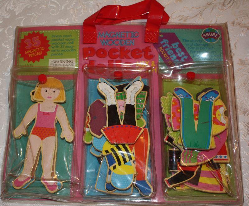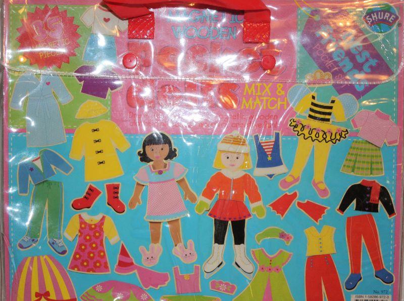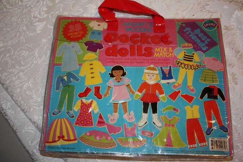 Shure brand 35 piece magnetic wooden pocket Doll; lots of outfits