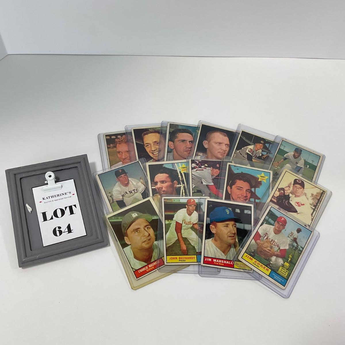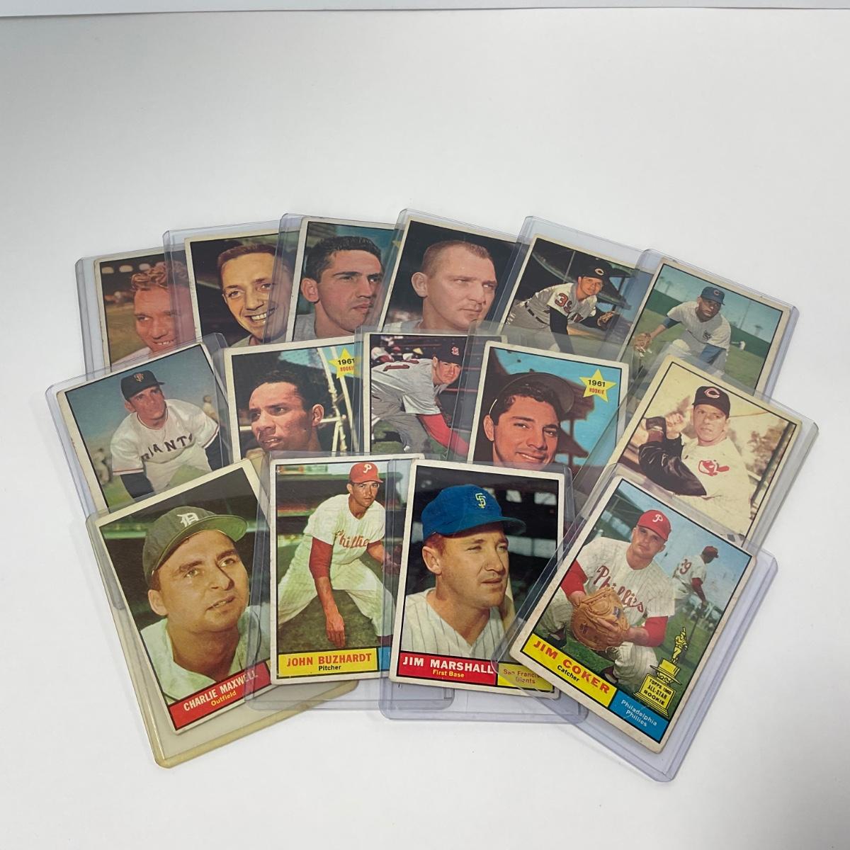 15 vintage 1961 Topps baseball cards in plastic sleeves. Please see photos for details and condition. ::: Shipping is available on this lot. If you require shipping you must let us know at the close of the auction. We will coordinate with you after the item has been won. Shipping fees will include insurance up to or exceeding the value of all items being mailed. If you have any questions regarding this lot please contact the auctioneer either via this website, by direct email or by phone. PICK UP TIMES and other important information can be found in the TERMS and DESCRIPTION of the auction. Please take a look for pertinent information. Thanks!