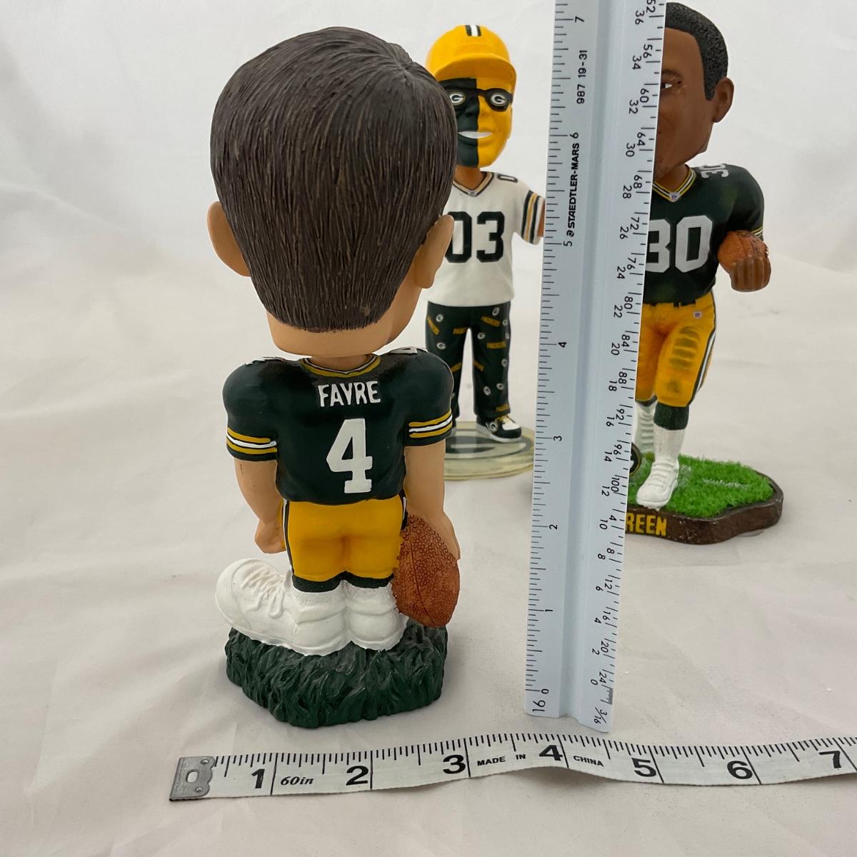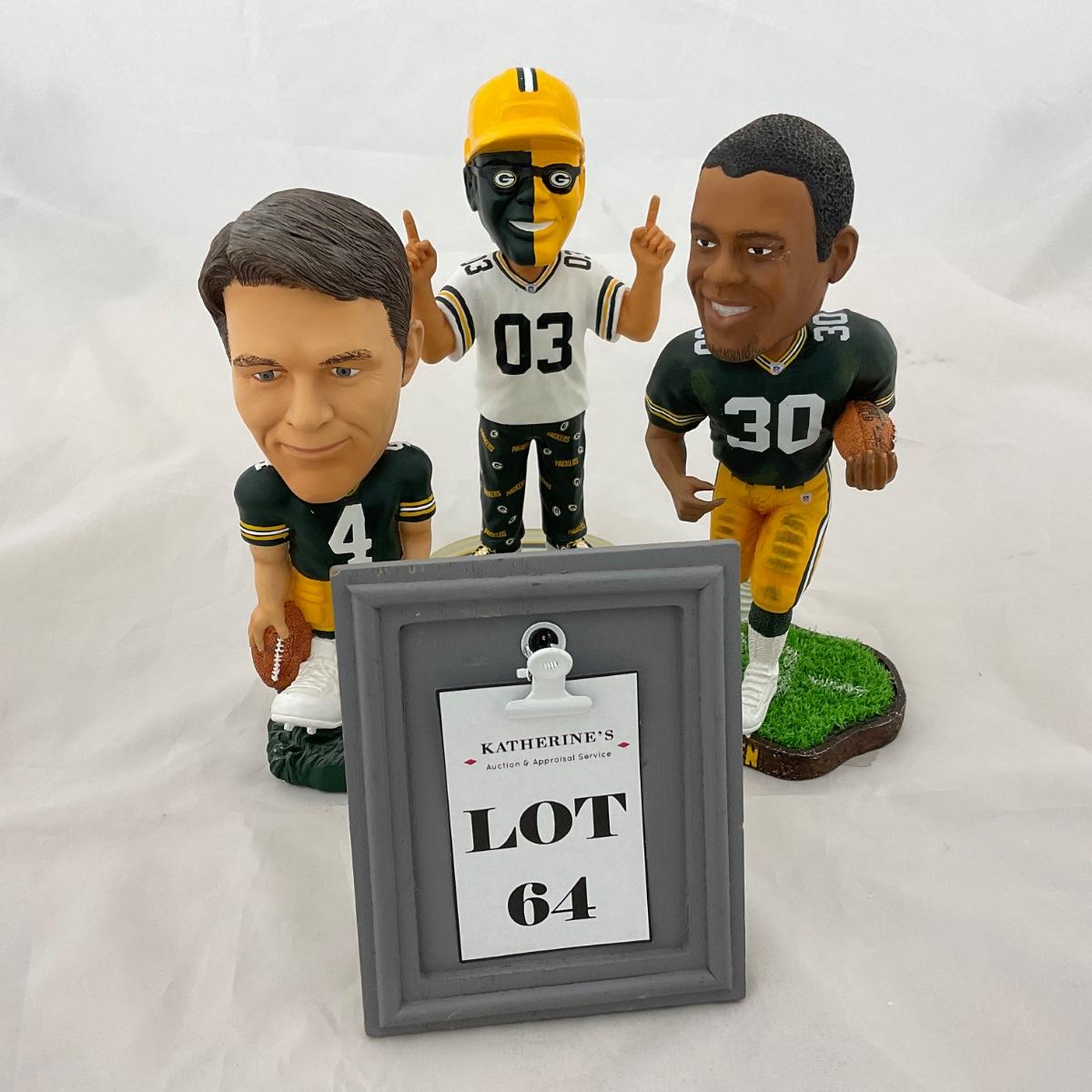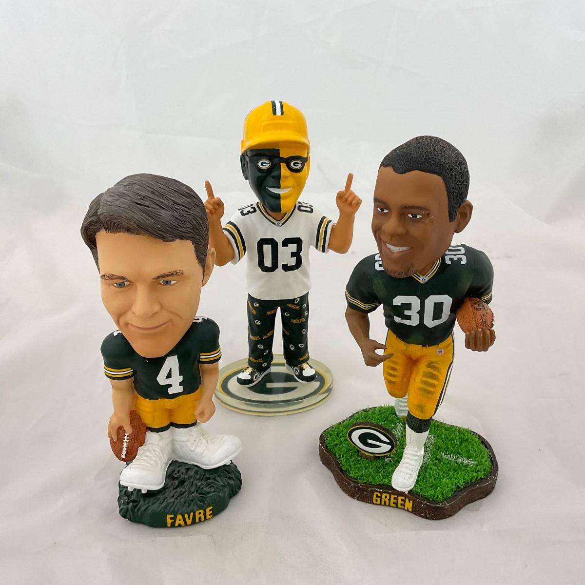 Three Green Bay Packers bobbleheads. Please see photos for details and condition. ::: Shipping is available on this lot. If you require shipping you must let us know at the close of the auction. We will coordinate with you after the item has been won. Shipping fees will include insurance up to or exceeding the value of all items being mailed. If you have any questions regarding this lot please contact the auctioneer either via this website, by direct email or by phone. PICK UP TIMES and other important information can be found in the TERMS and DESCRIPTION of the auction. Please take a look for pertinent information. Thanks!