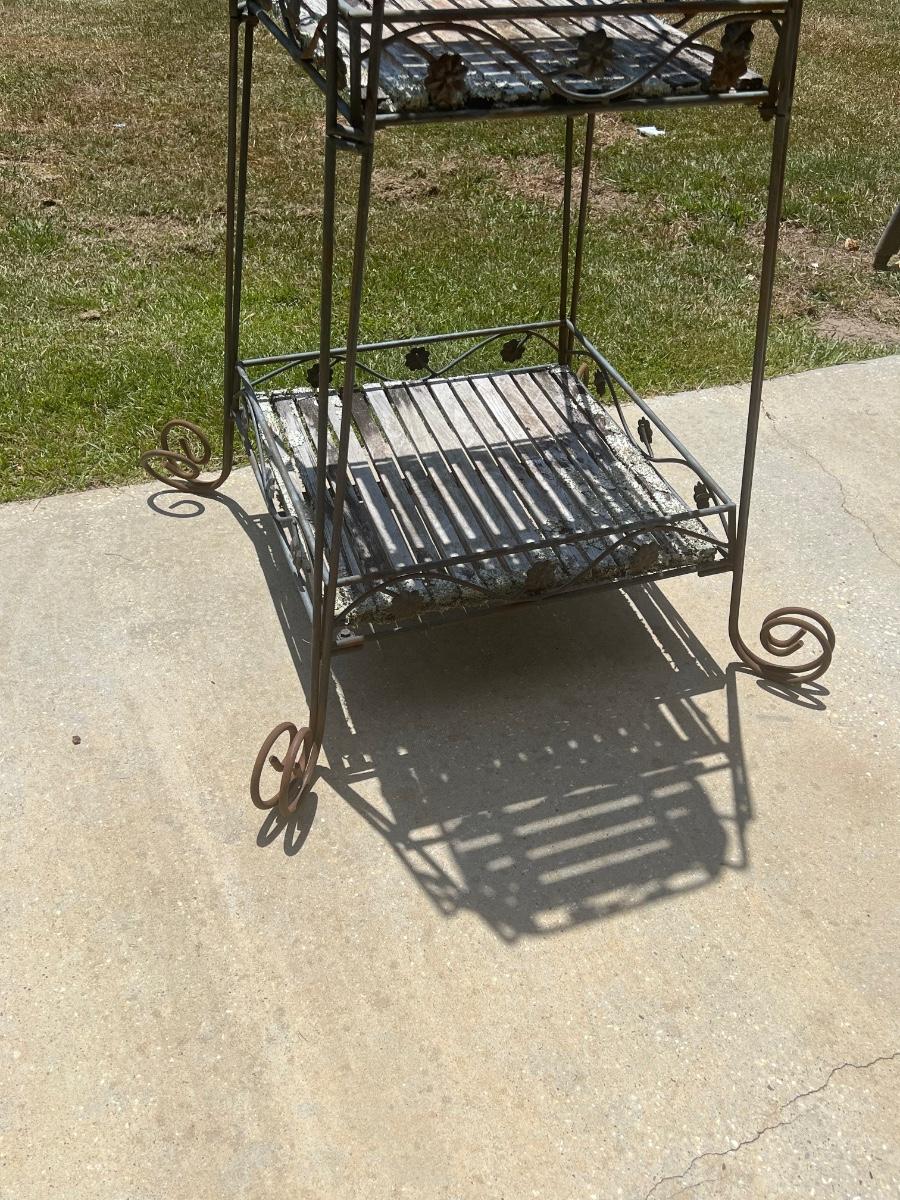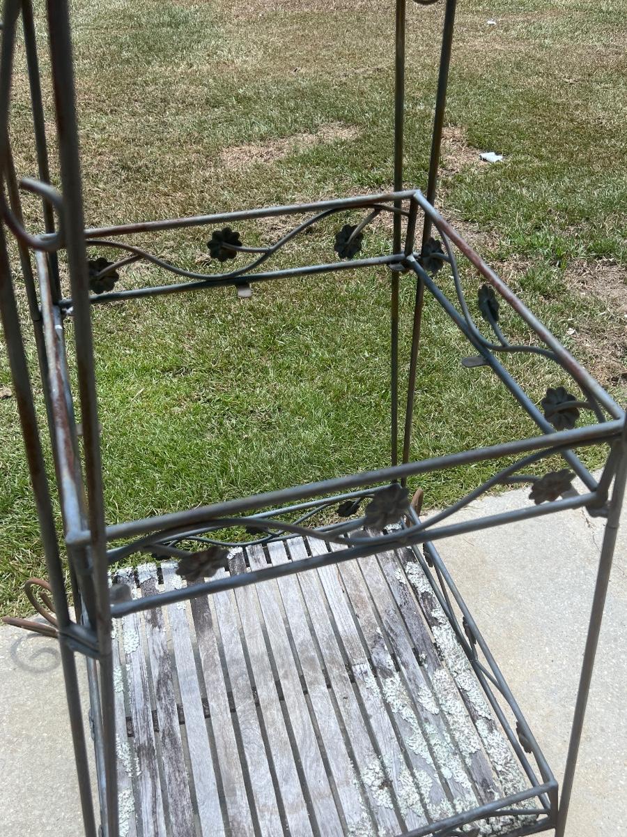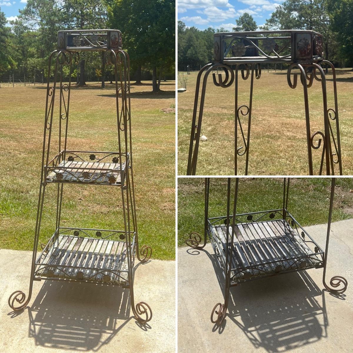 Has minor surface rust ~ Boards for shelving needs to be replaced ~ 64” H x 33” Square ~ Top shelf = 13” Square, Middle shelf = 17.75” Square ~ Bottom shelf = 22” Square