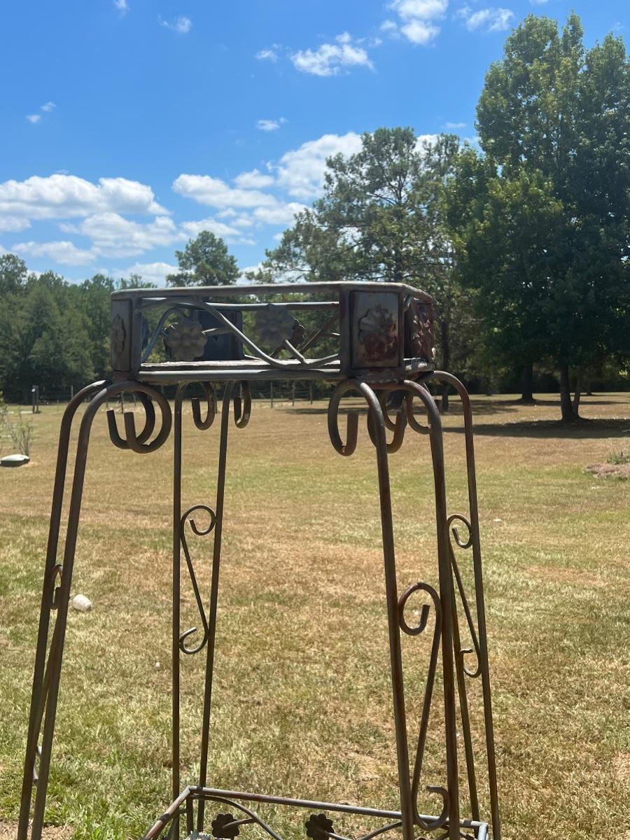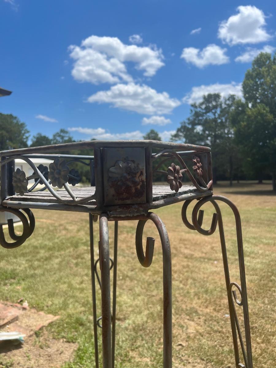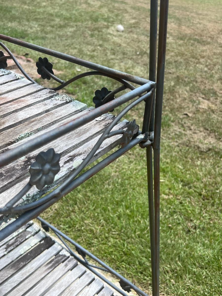Has minor surface rust ~ Boards for shelving needs to be replaced ~ 64” H x 33” Square ~ Top shelf = 13” Square, Middle shelf = 17.75” Square ~ Bottom shelf = 22” Square