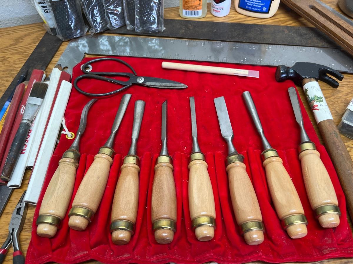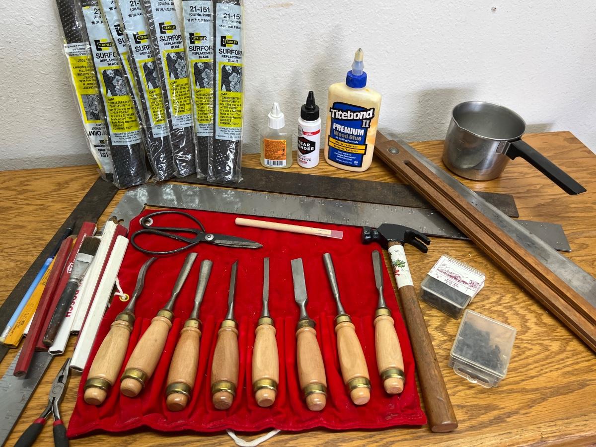 64- Woodcarving tools, squares, Surform replacement blades, glue