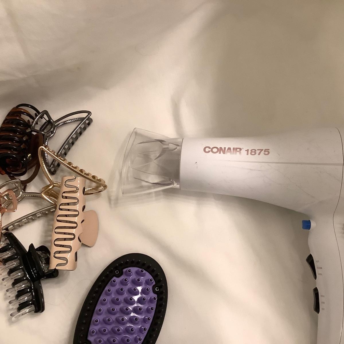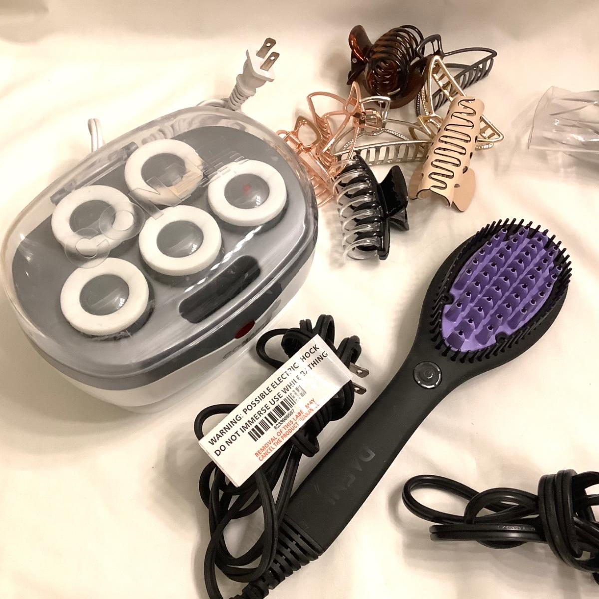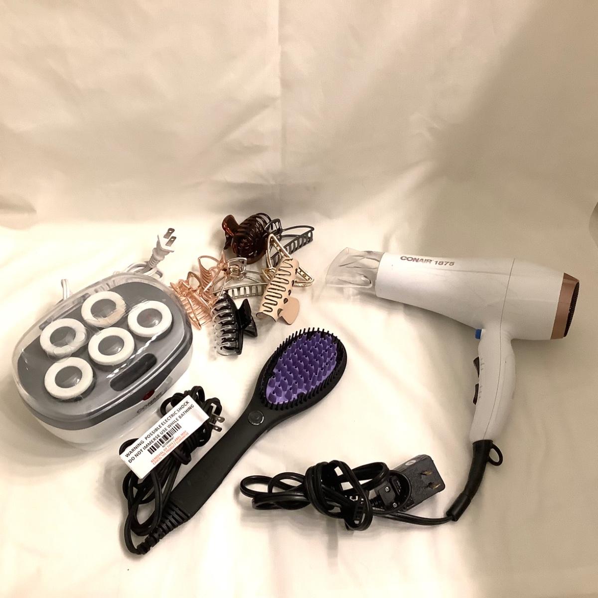 The lot contains Dafni heated hair brush, conair hair dryer model 1875, assorted new hair claw clips, small conair curler set.