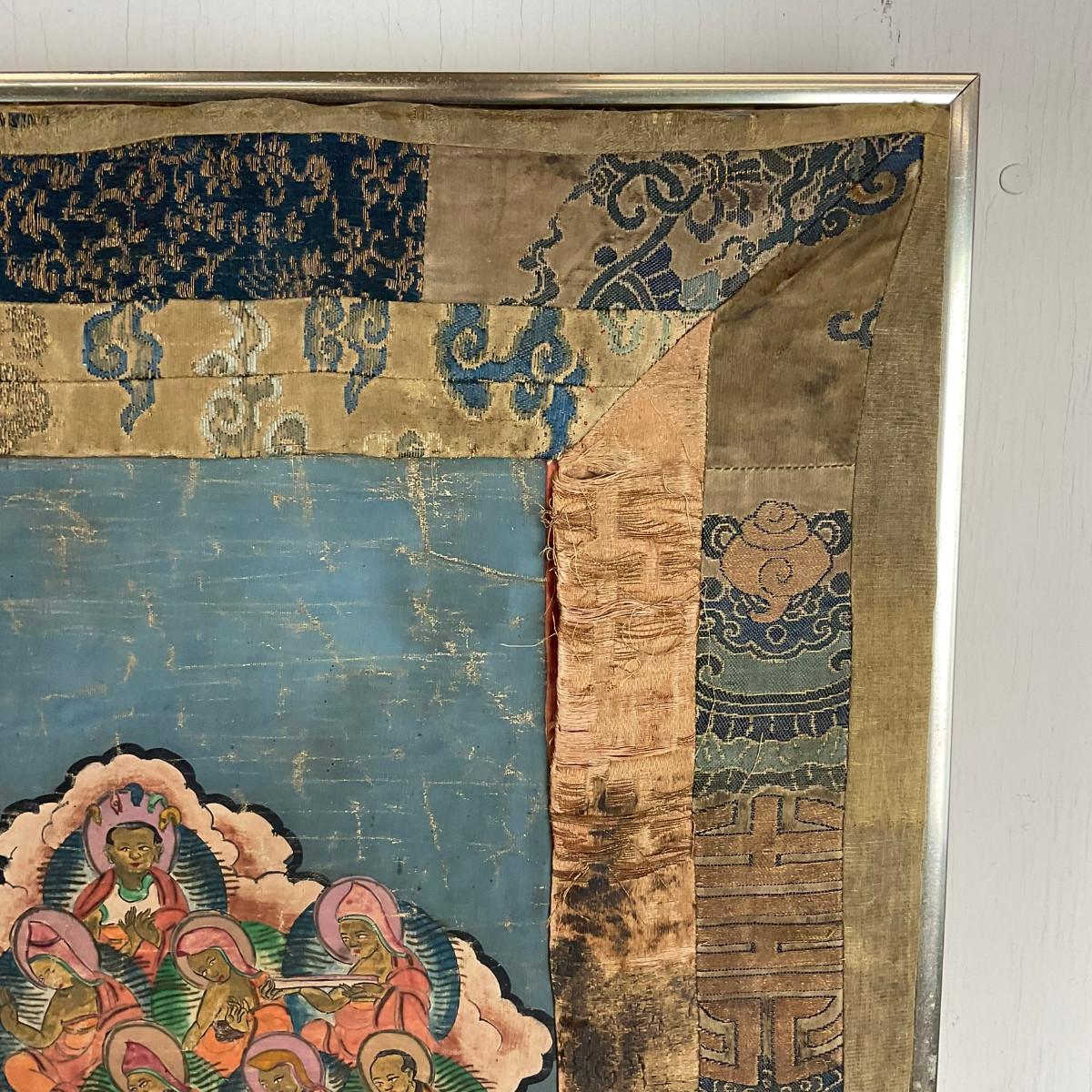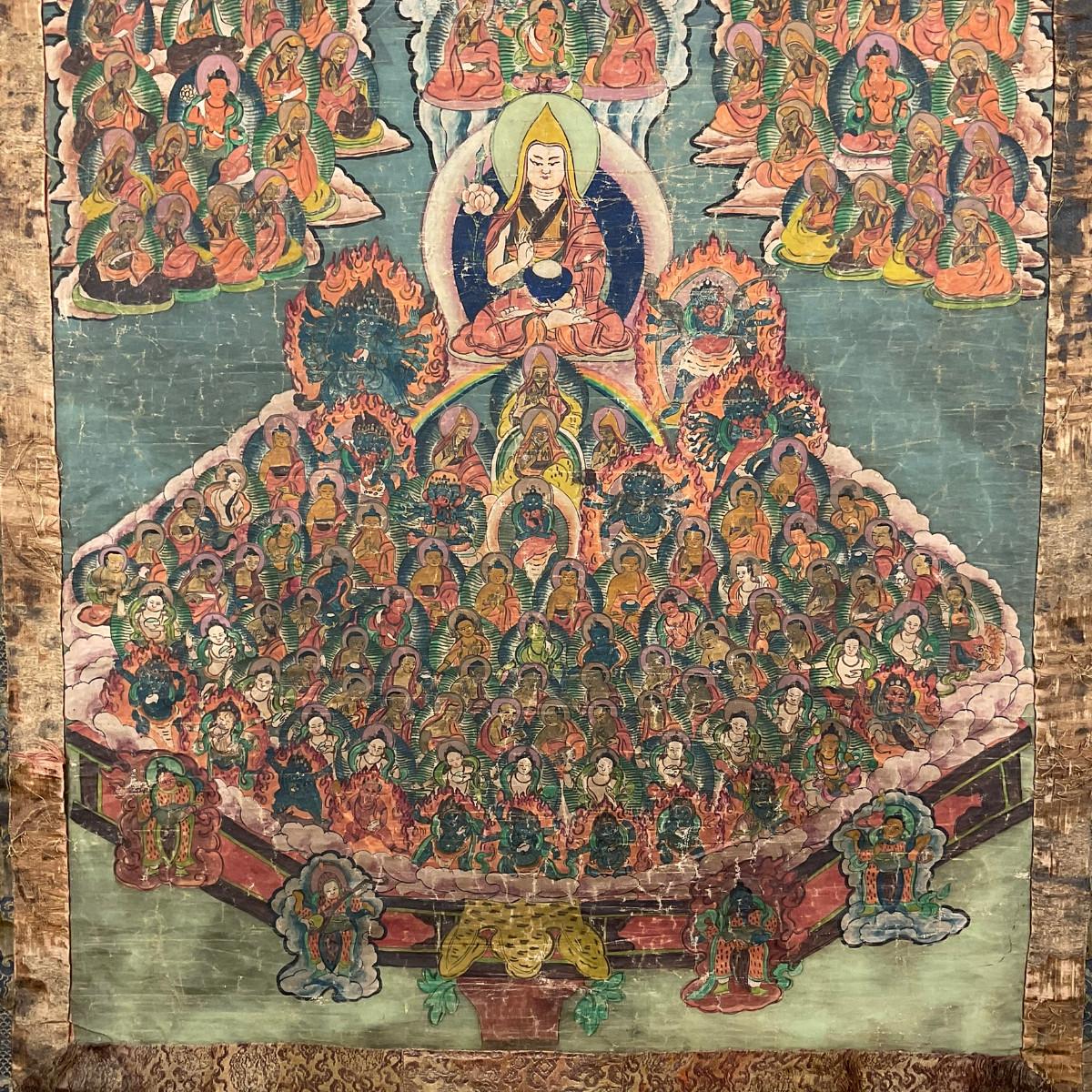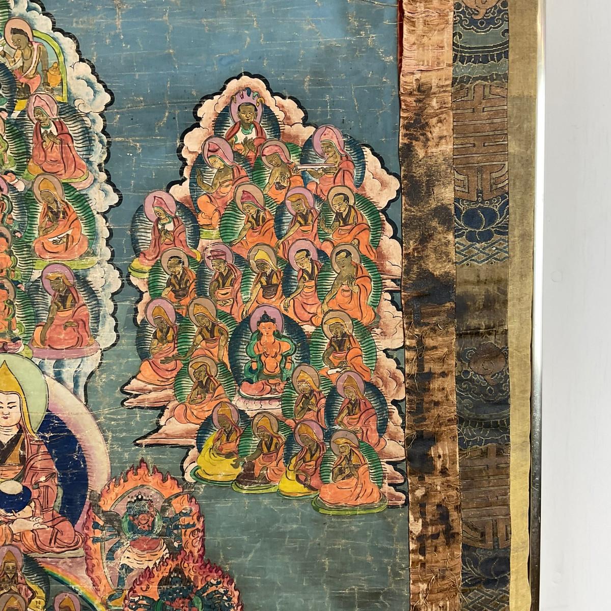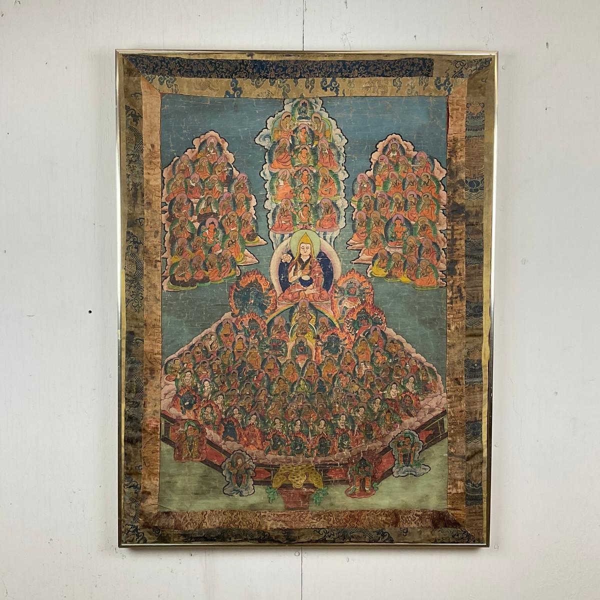 Hand-painted Tibetan Buddhist thangka depicting a central lama figure surrounded by an extensive assembly of Buddhas, bodhisattvas, and deities arranged in a mandala-like composition. Painted with mineral pigments on cloth and bordered with silk brocade. Likely late 19th to early 20th century. Showing age-related wear consistent with devotional use. Framed. A finely detailed example of traditional Tibetan religious art.