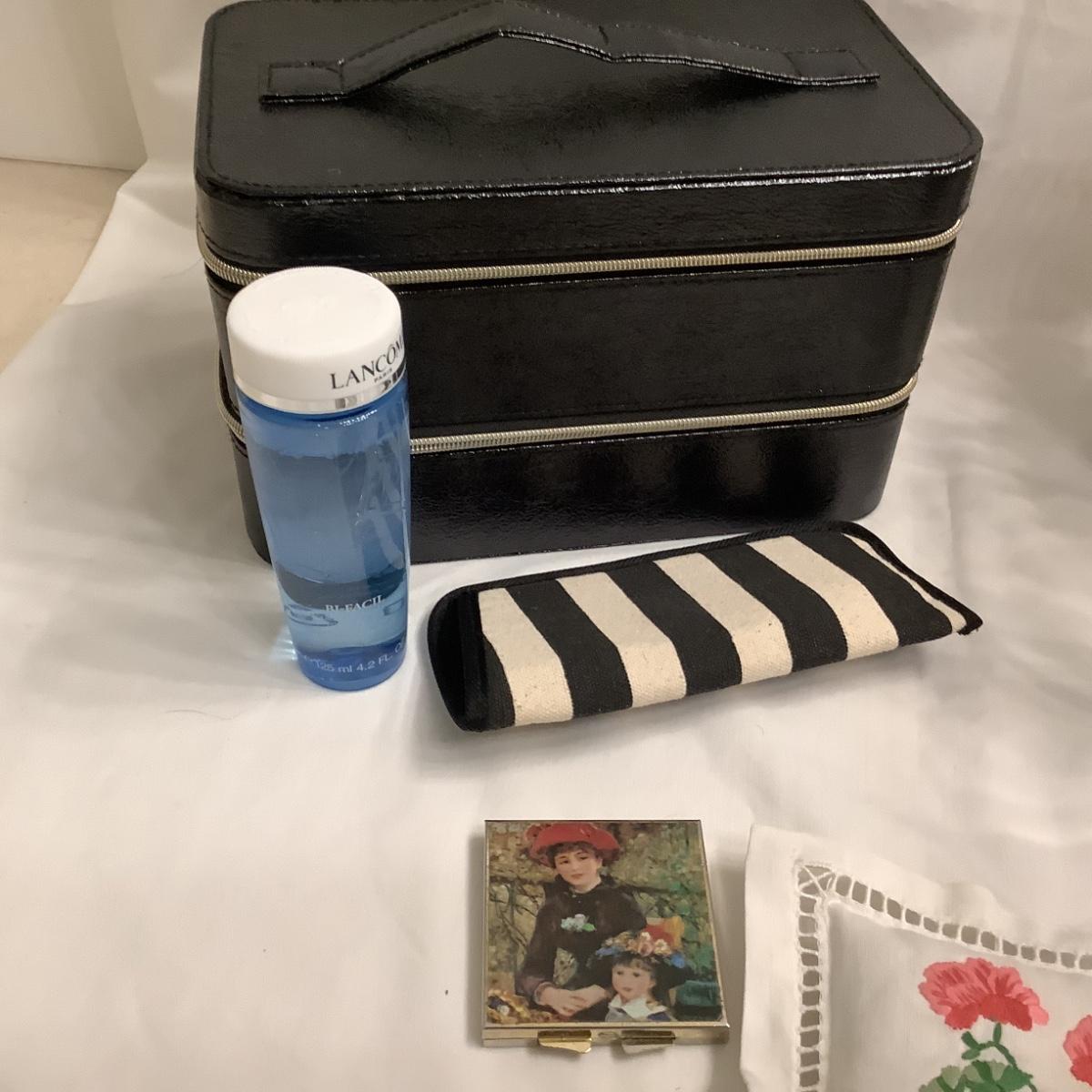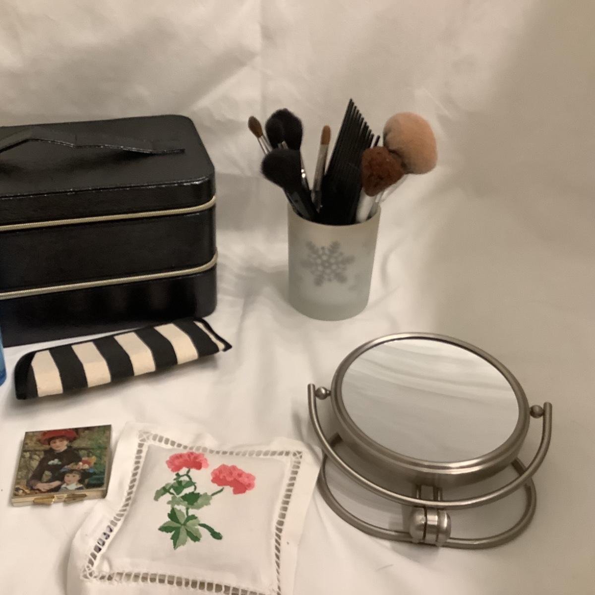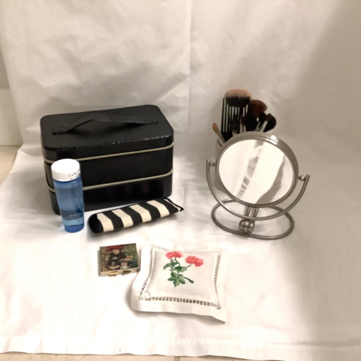 Lot contains a new 2 section black Lancome makeup bag, mirror, assorted makeup brushes and more.