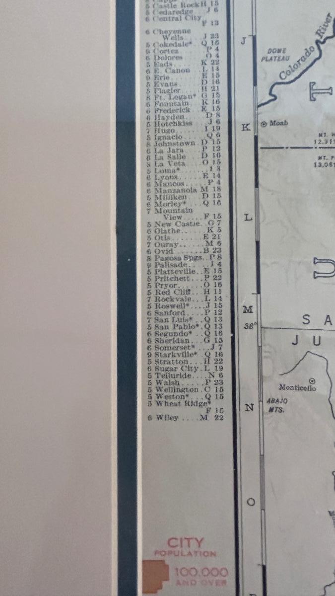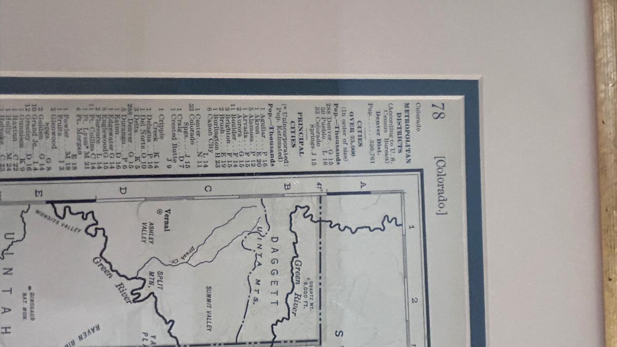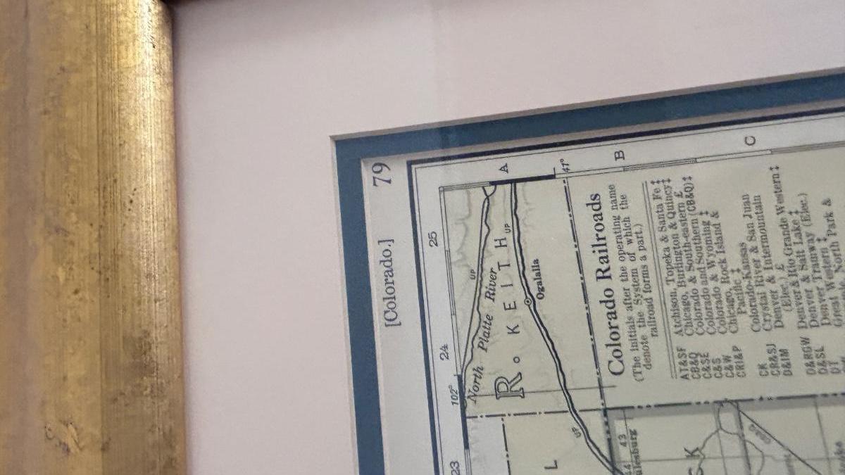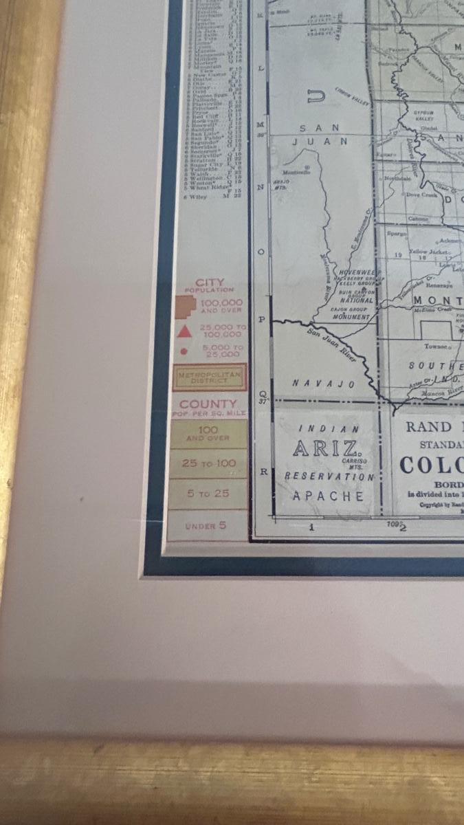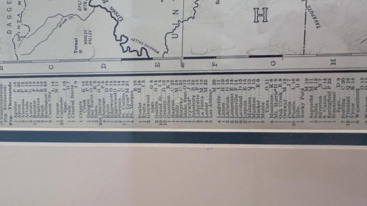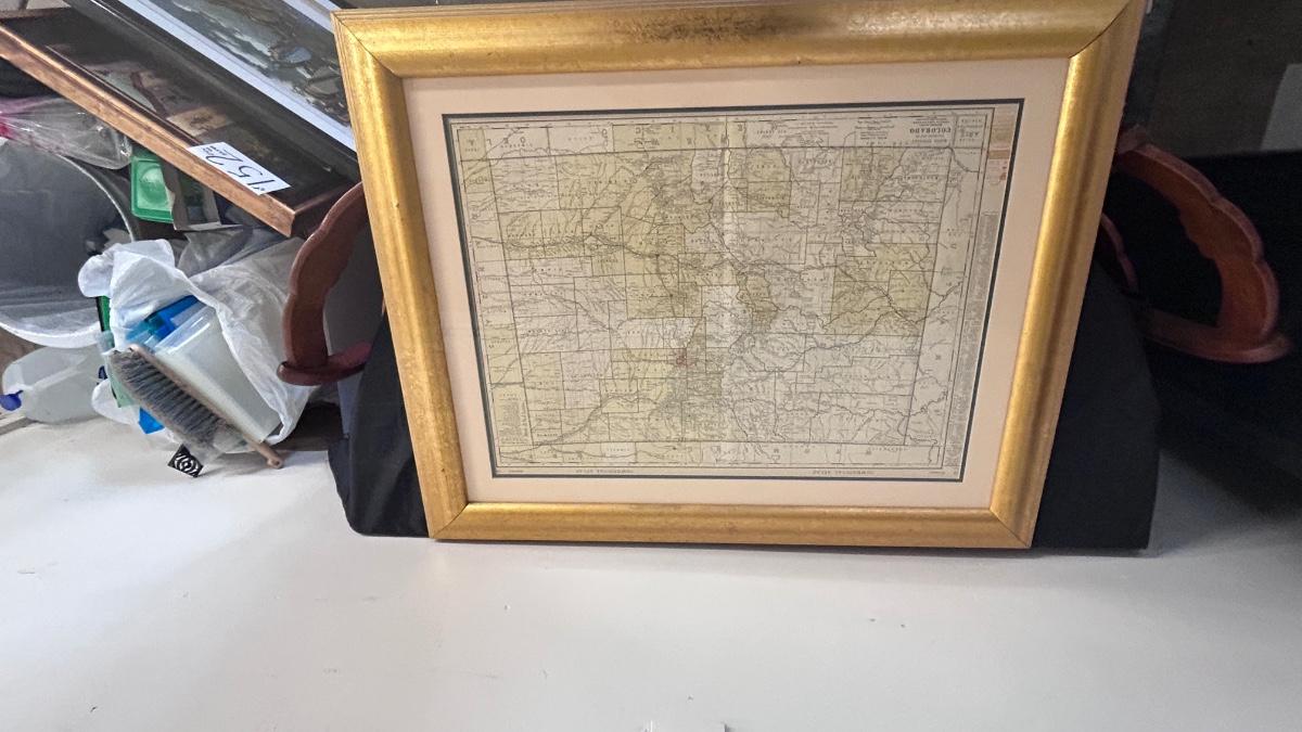 64/100 BARBARA MOORE FRAMED ARTWORK AND 1979 FRAMED COMMERCIAL ATLAS MAP OF COLORFUL COLORADO