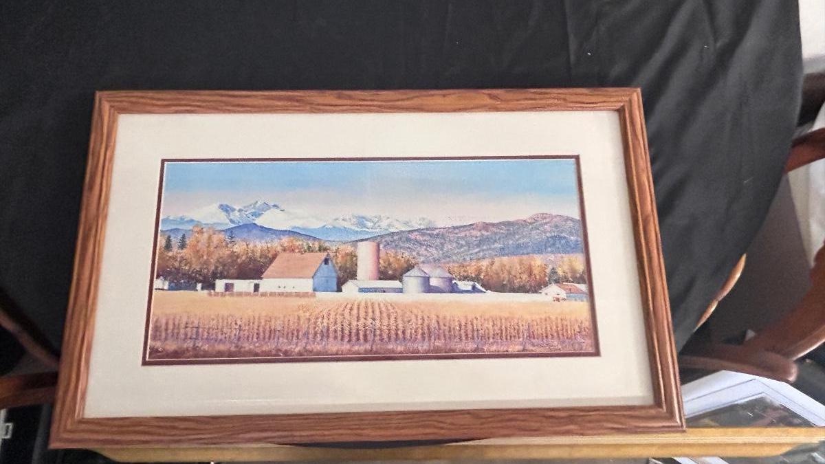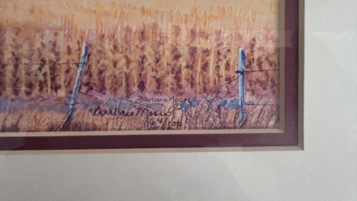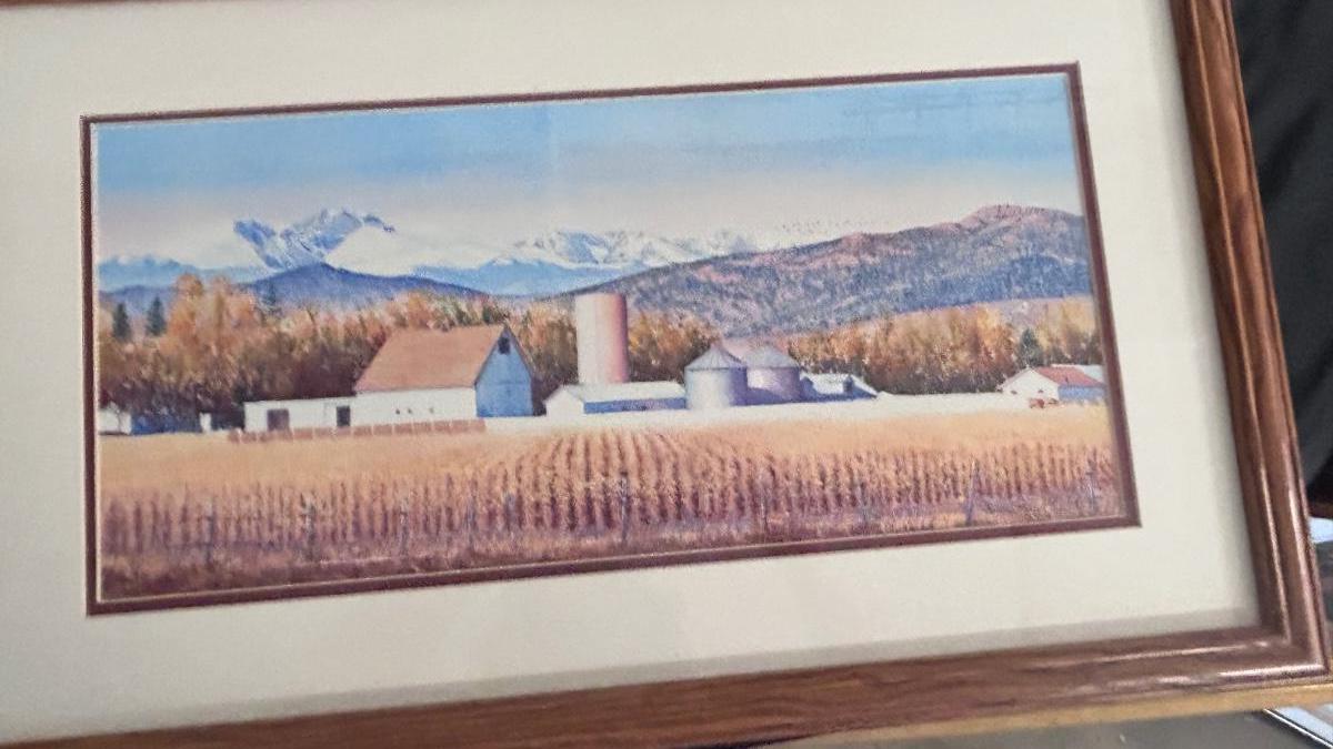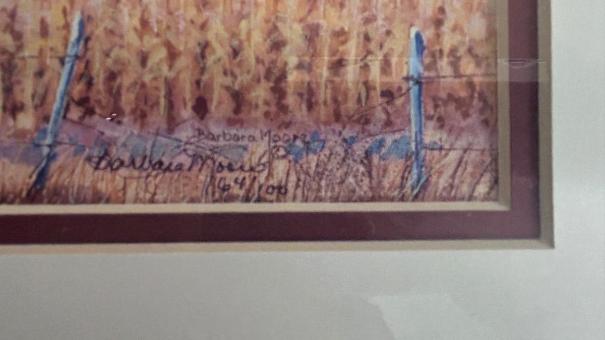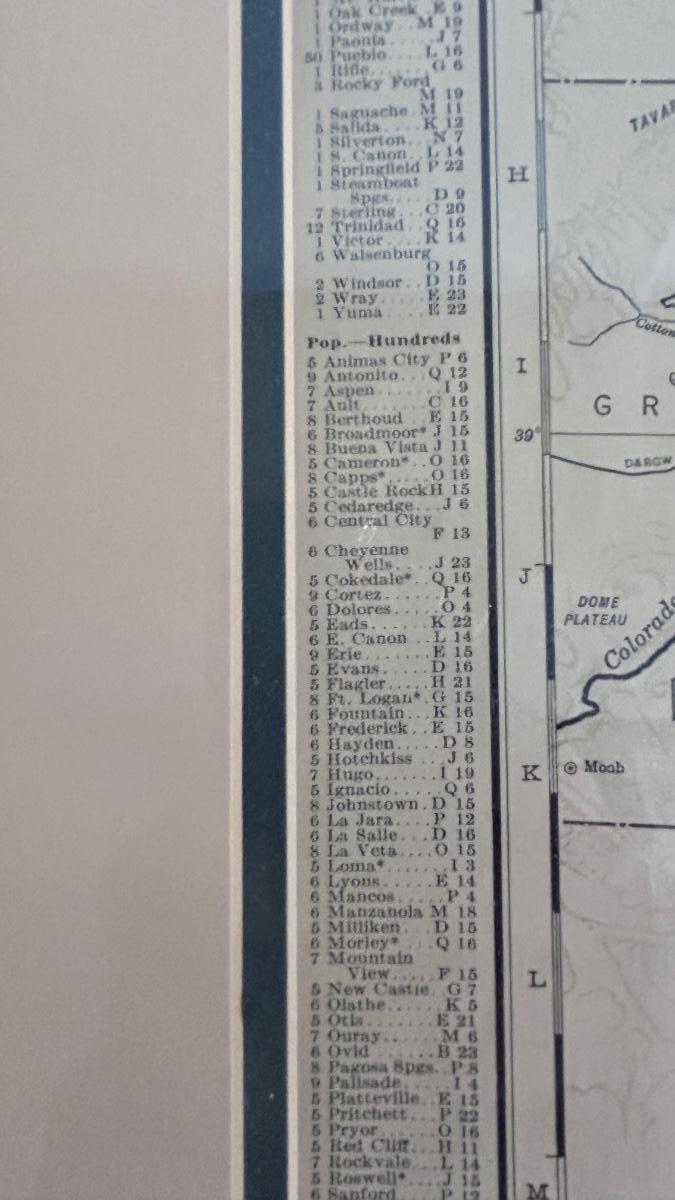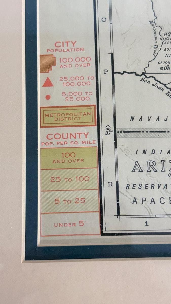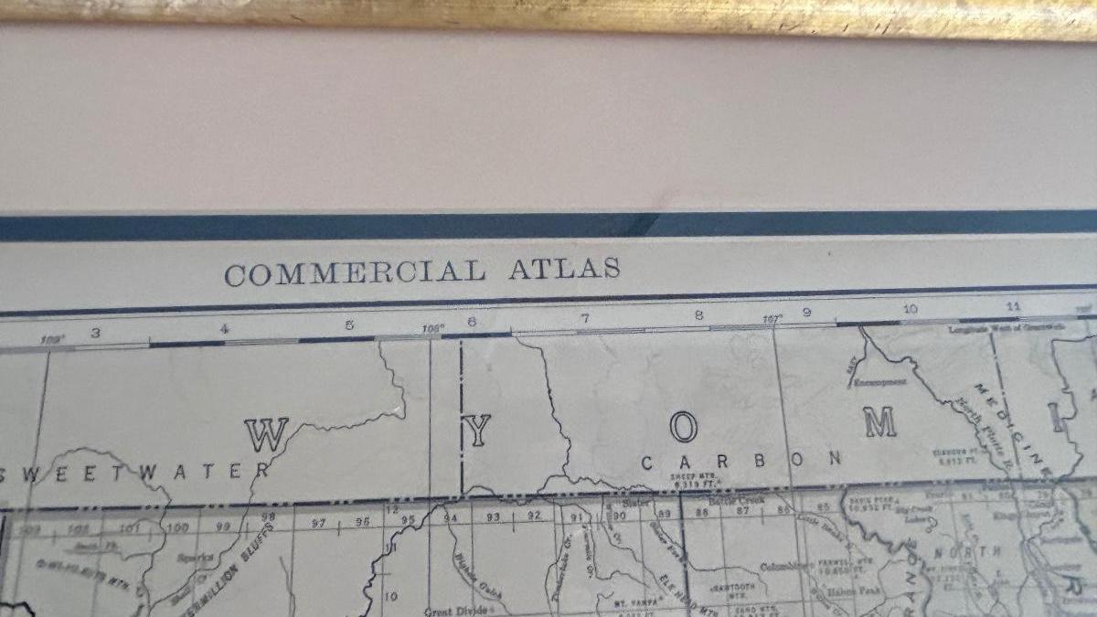 64/100 BARBARA MOORE FRAMED ARTWORK AND 1979 FRAMED COMMERCIAL ATLAS MAP OF COLORFUL COLORADO
