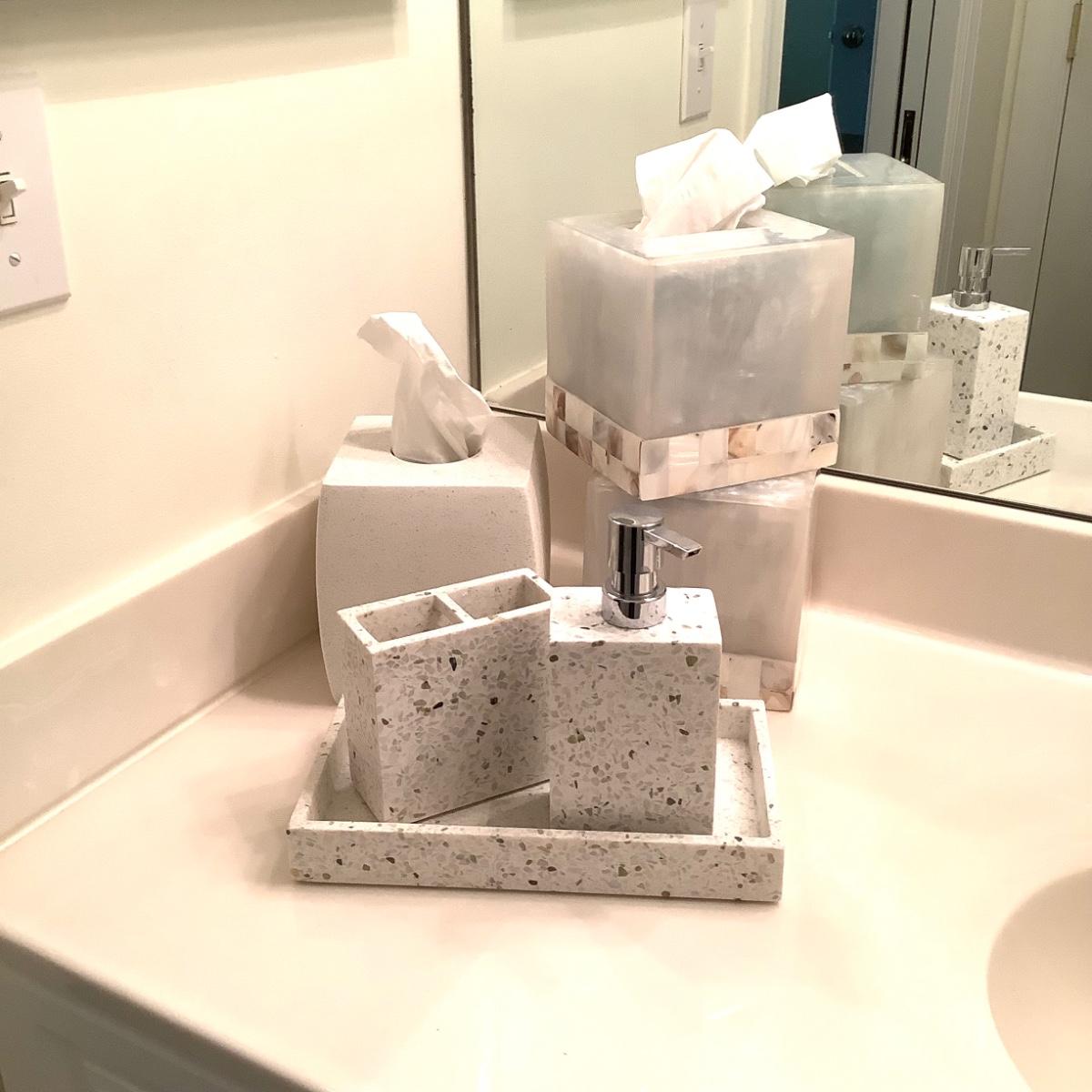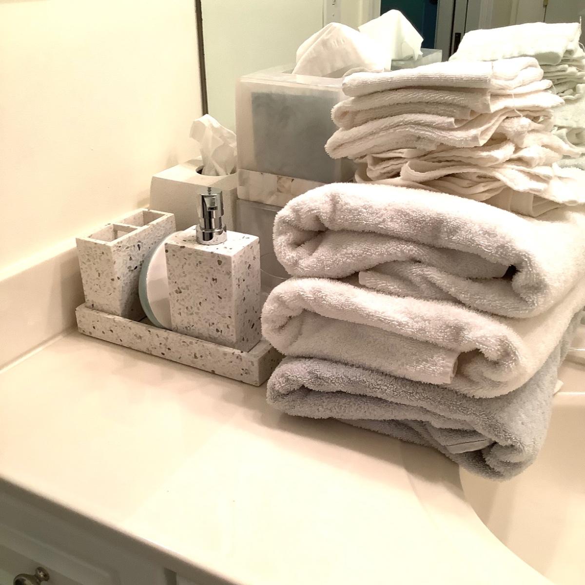 Assorted white and grey towels (bath, wash cloth) assorted soap dispensers, tissue holders, soap dish and more.