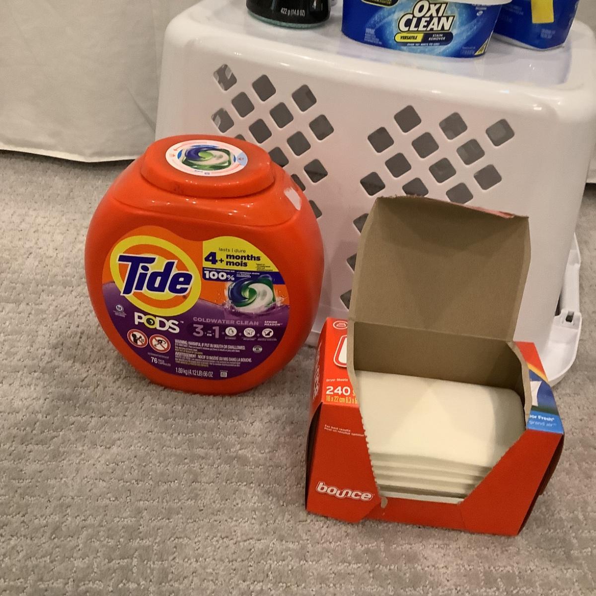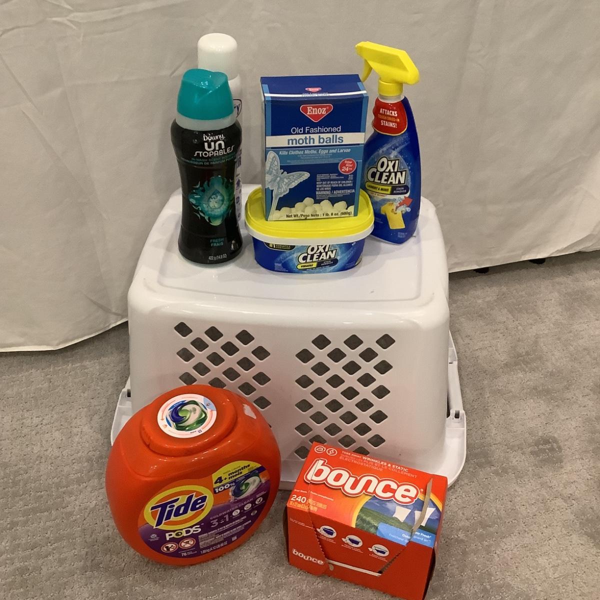 Large laundry basket with assorted laundry detergents, spot cleaners and dryer sheets-all is at least half full, most full.