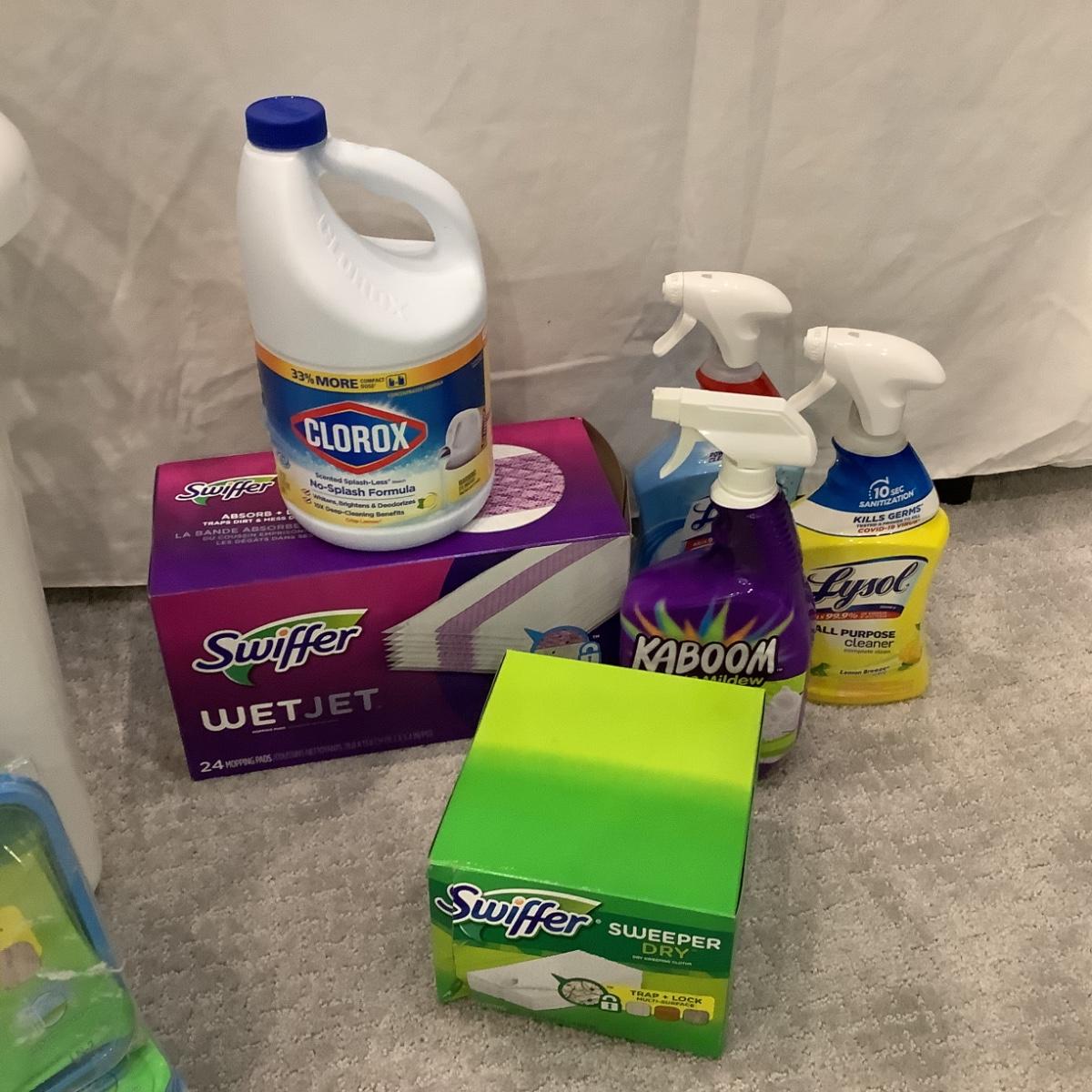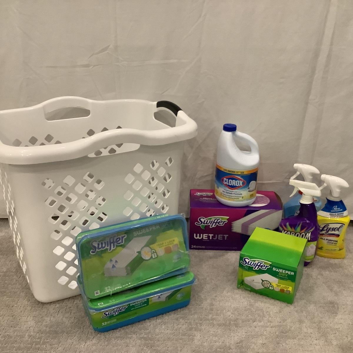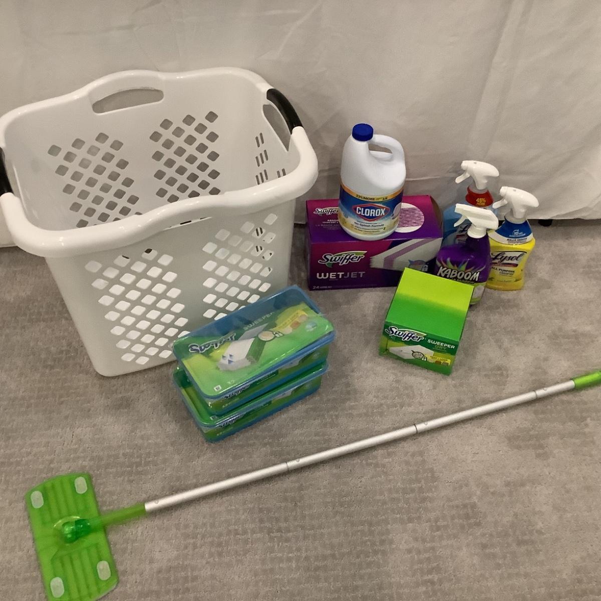Swiffer cleaner with refill mop sheets, dusters and wet jet pads, assorted other cleaners as well with the large heavy duty laundry basket.