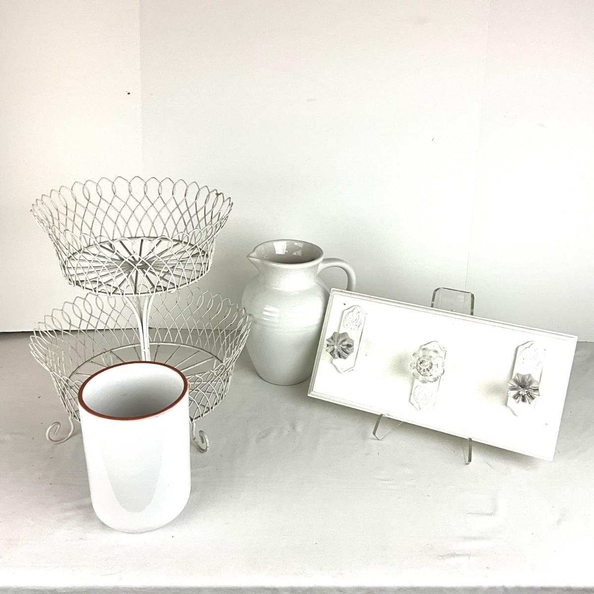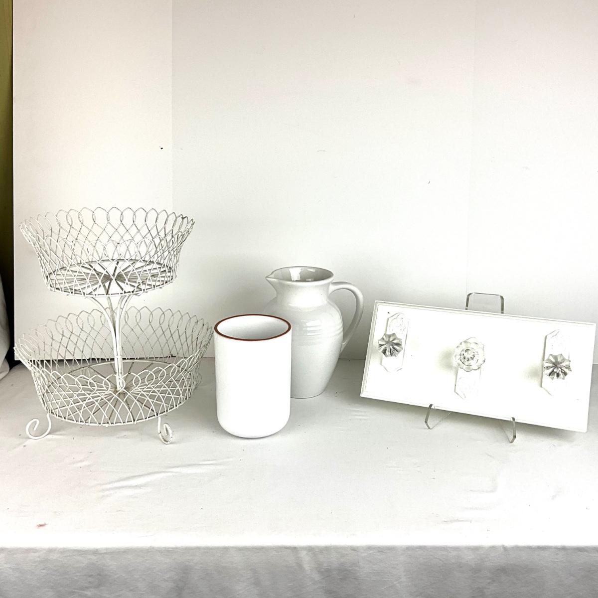 Two tier white wire basket, and white three door know wall hanging