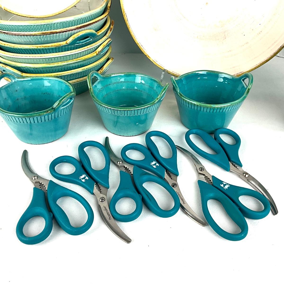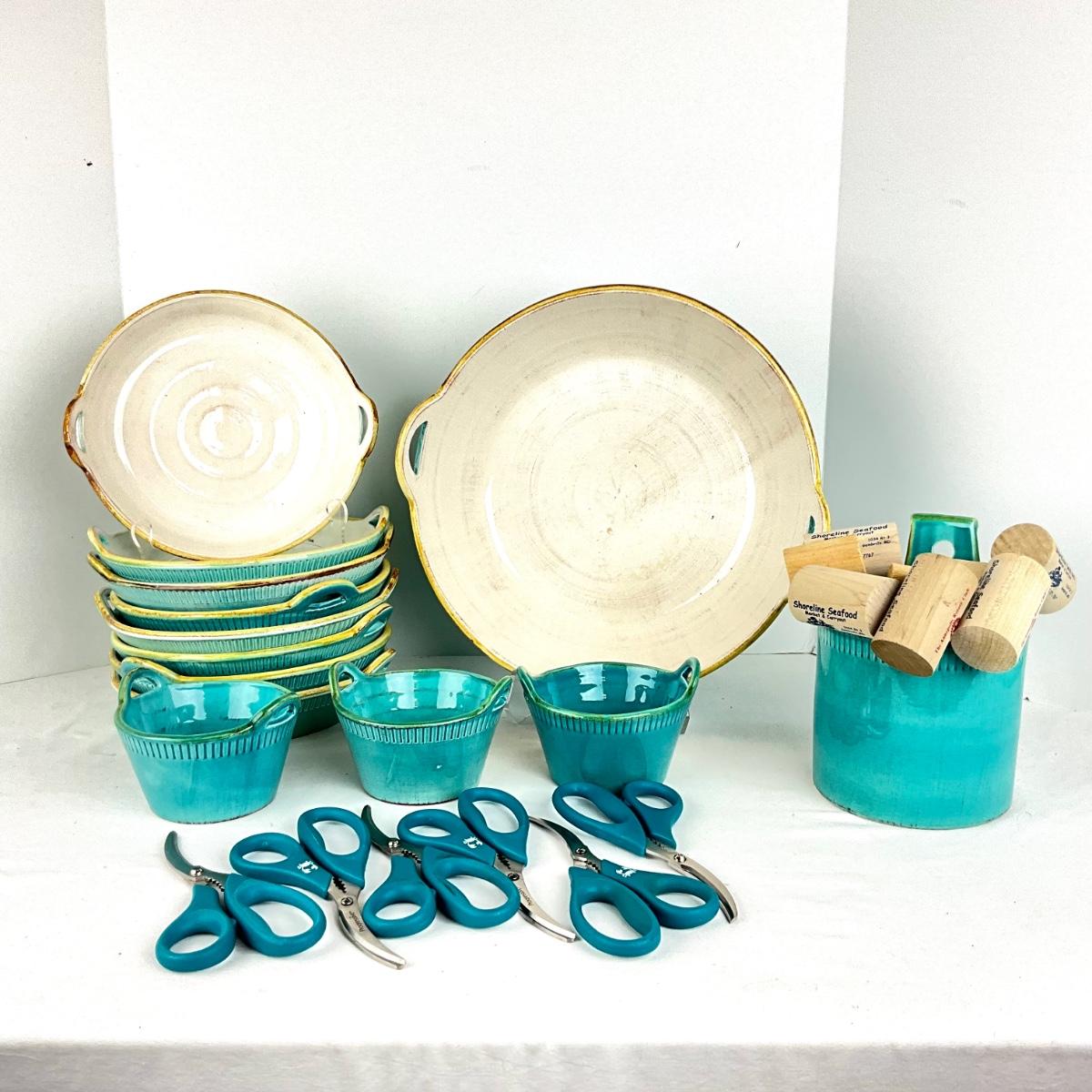 Set of 6 crab scissors, 8 mallets , 8- 9" handled bowls, one large 13" bowl, three small handled bowls measuring 5" x 3"