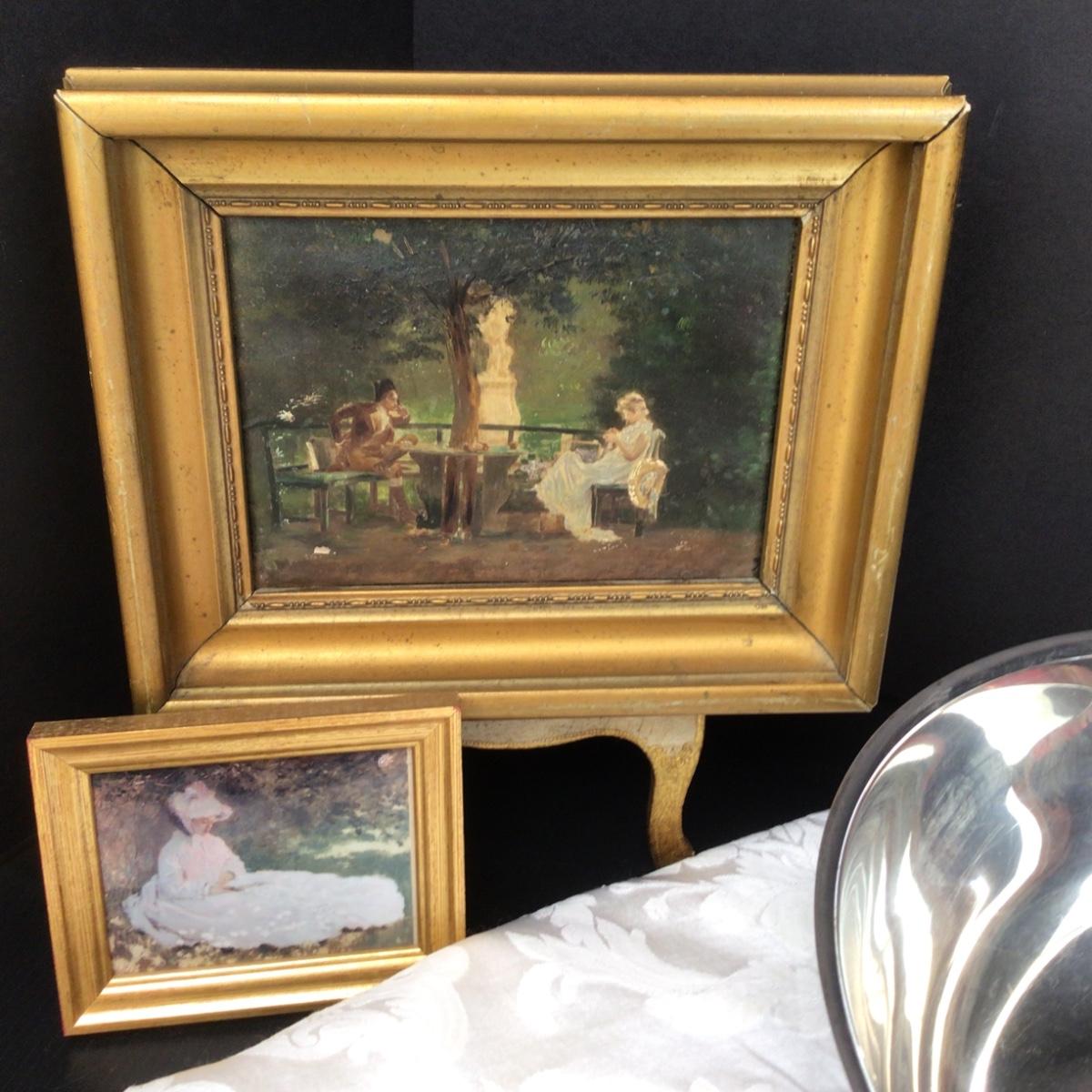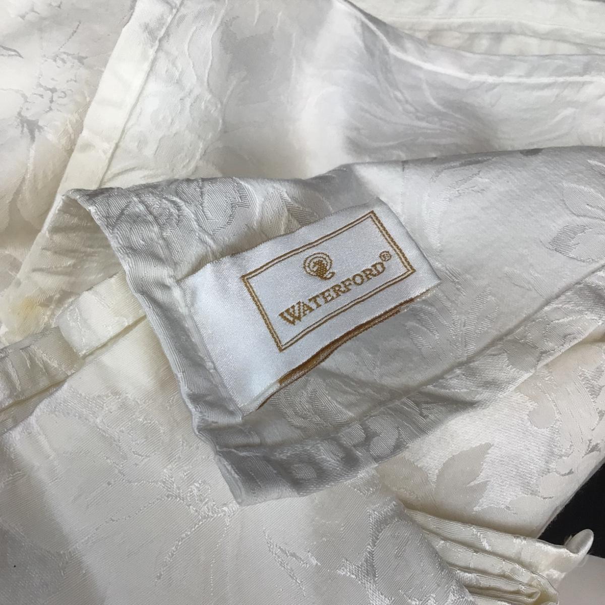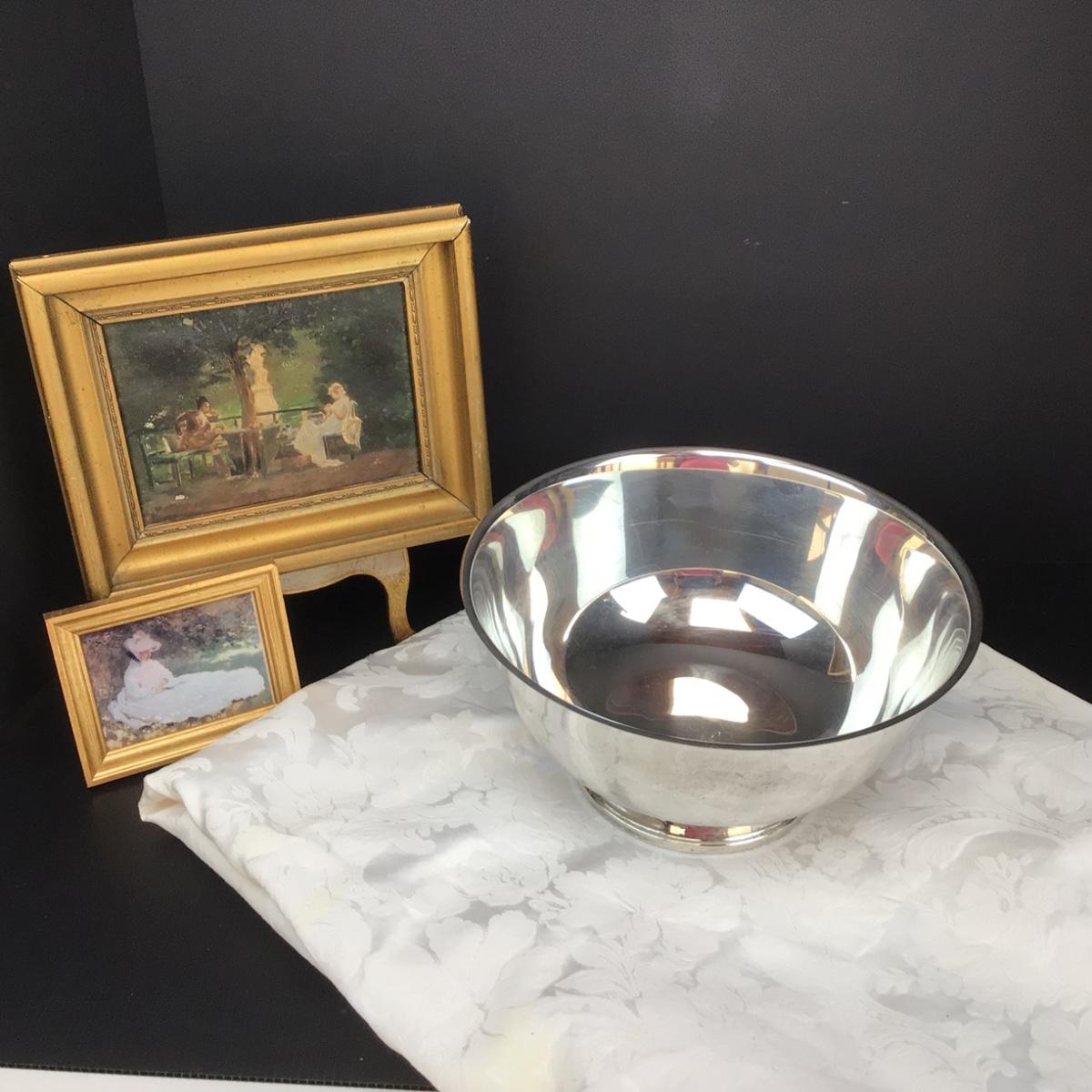 The lot contains oil on canvas that measures 9” x 7.5” Silverplate serving bowl and Waterford Damask tablecloth that is 122” x 66”.