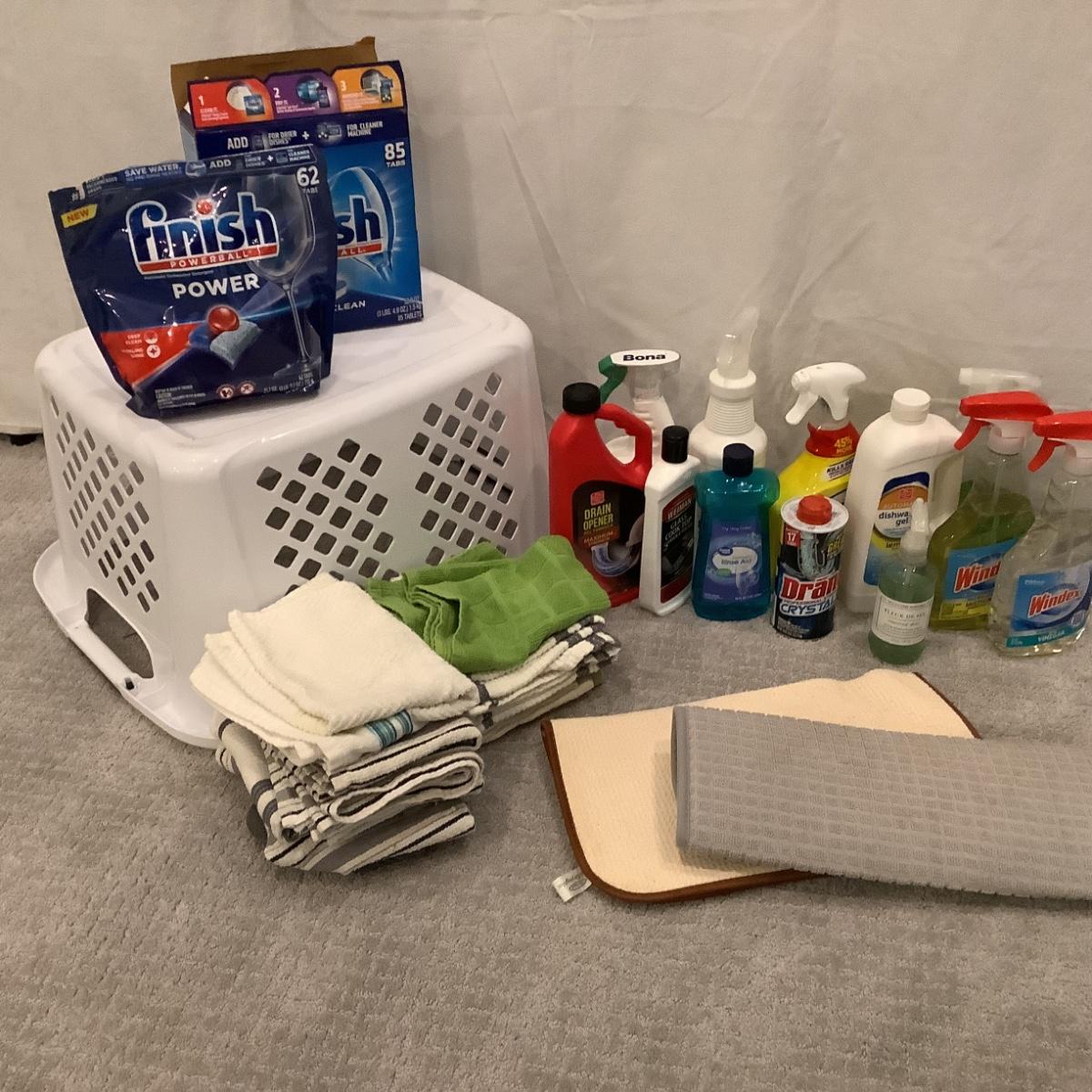 The basket contains assorted everyday cleaners, drano, rags, dish drying mats, finish dishwasher tabs as well as the heavy duty laundry basket.