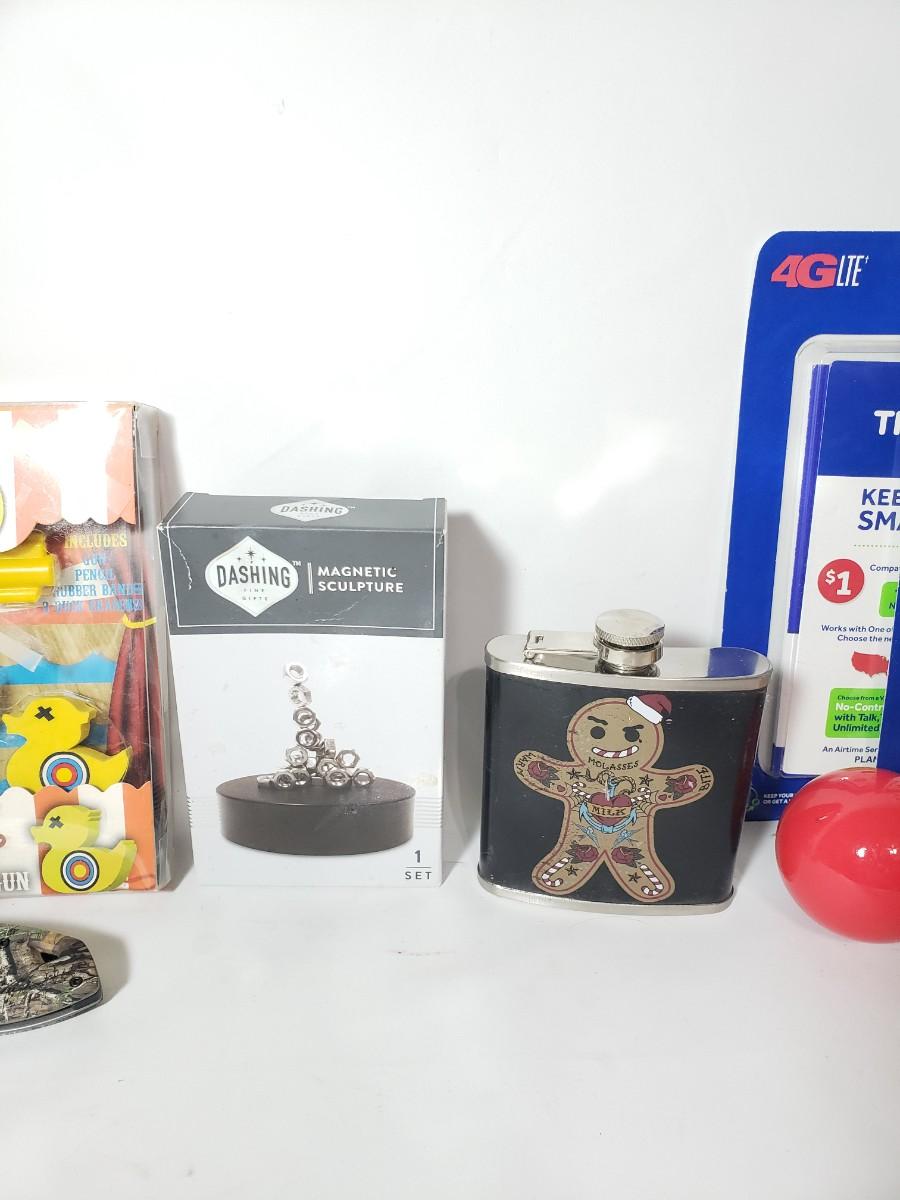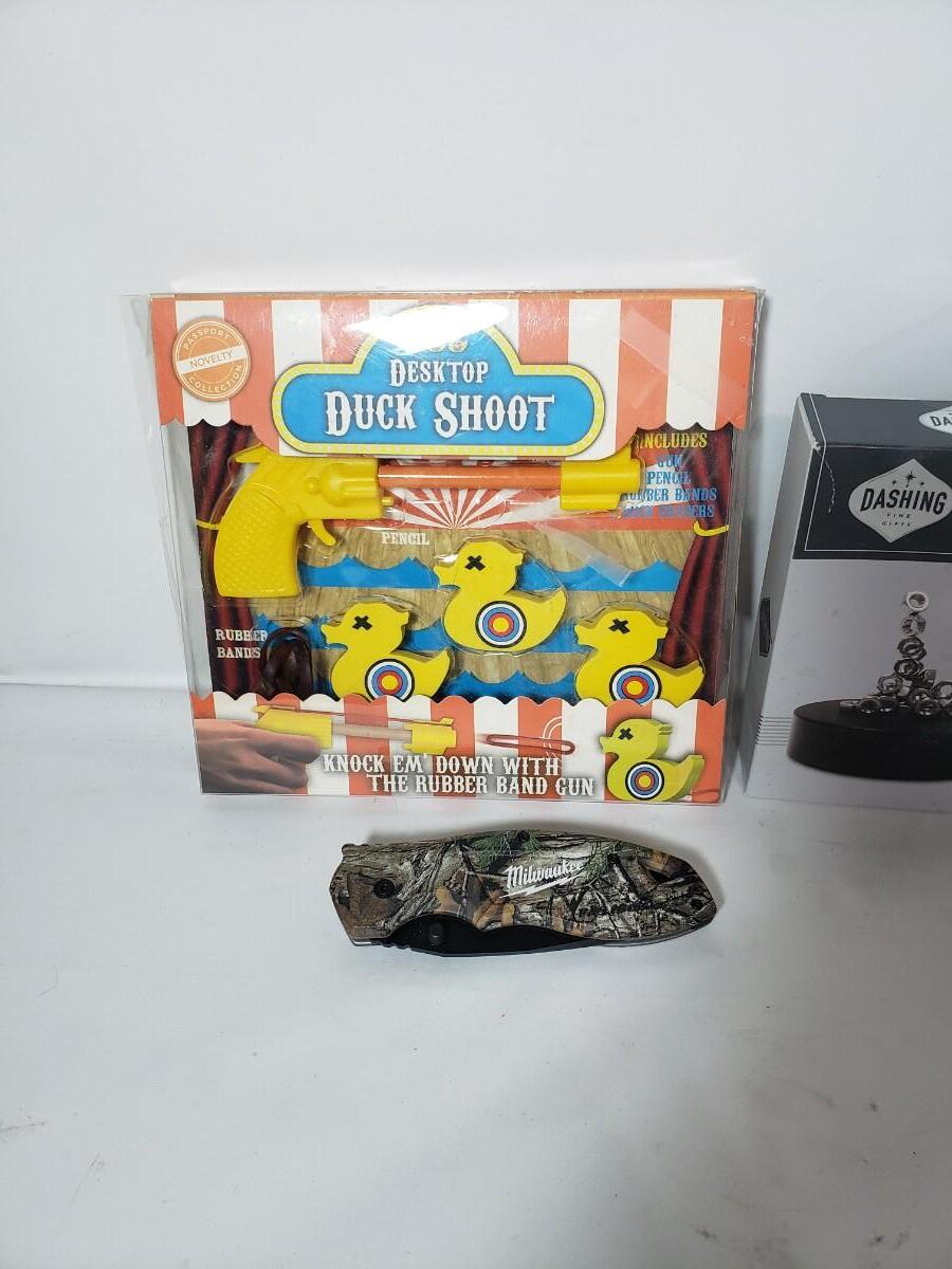 Milwaukee pocket knife, duck shooting game, ball game, magnetic desk sculpture.