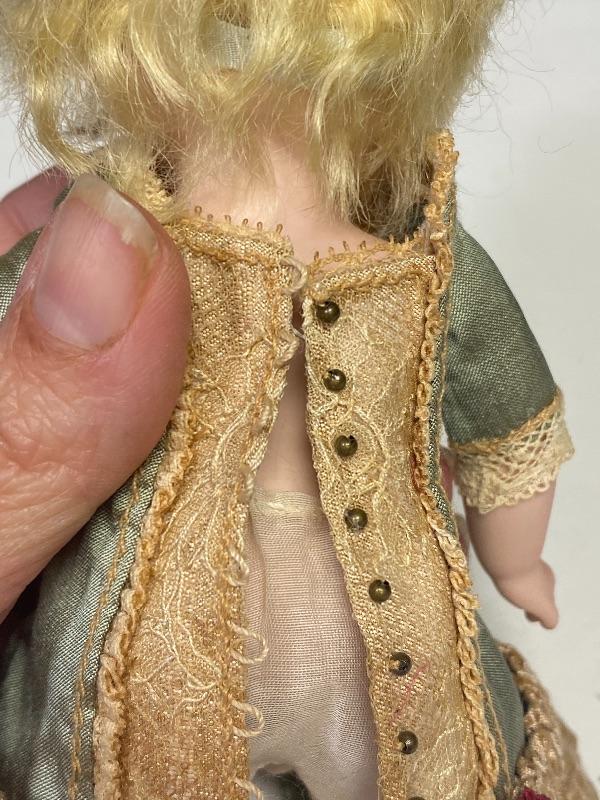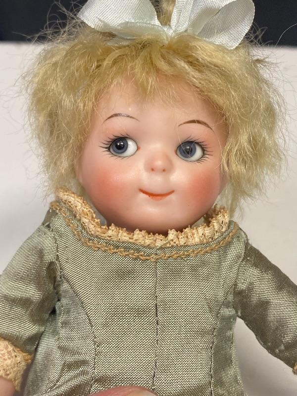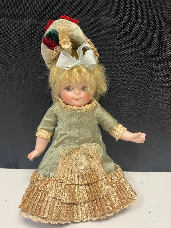 Cute watermelon mouth smile googly eyed bisque doll. Blonde mohair wig with blue eyes. Victorian dress and hat. Stands about 6.5" tall. No markings noticed. In good condition. Her dress was unbuttoned down the back when received, I tried to button but could not get buttons to stay closed.