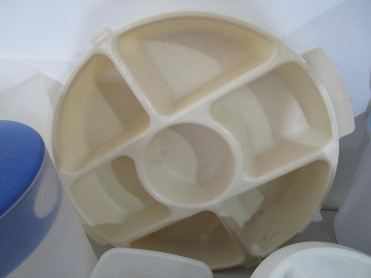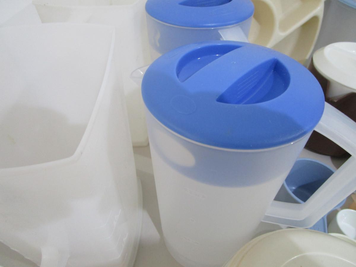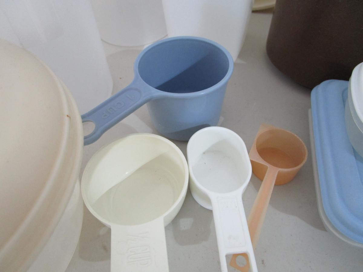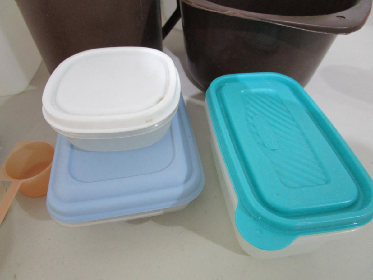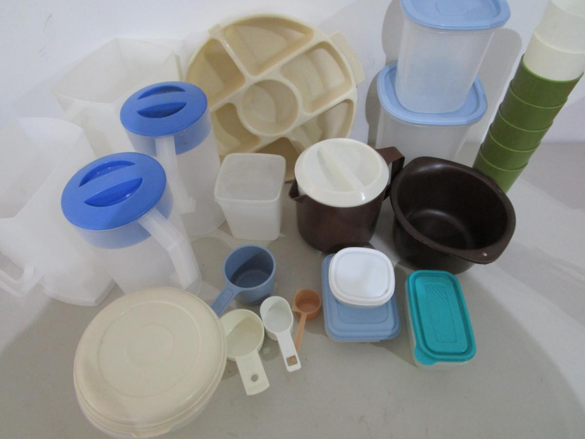 Rubbermaid, Anchor hocking and other. Measuring cups- 1 cup, 1/2 cup, 1/4 cup, 1/8 cup. 7 Drinking cups 10 ounces? 1.5 cup container and lid, 14 oz container and lid, 6 oz container and lid, Hefty container and lid, 6 cup container and lid, 12 cup container and lid, 6 cup measuring bowl, 6 cup bowl with lid, veggie tray, (2) 2 quart pitchers with lids, 1.5 quart pitcher with lid, (2) one gallon pitcher without lids