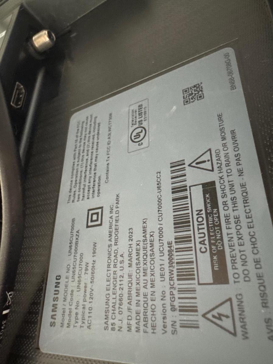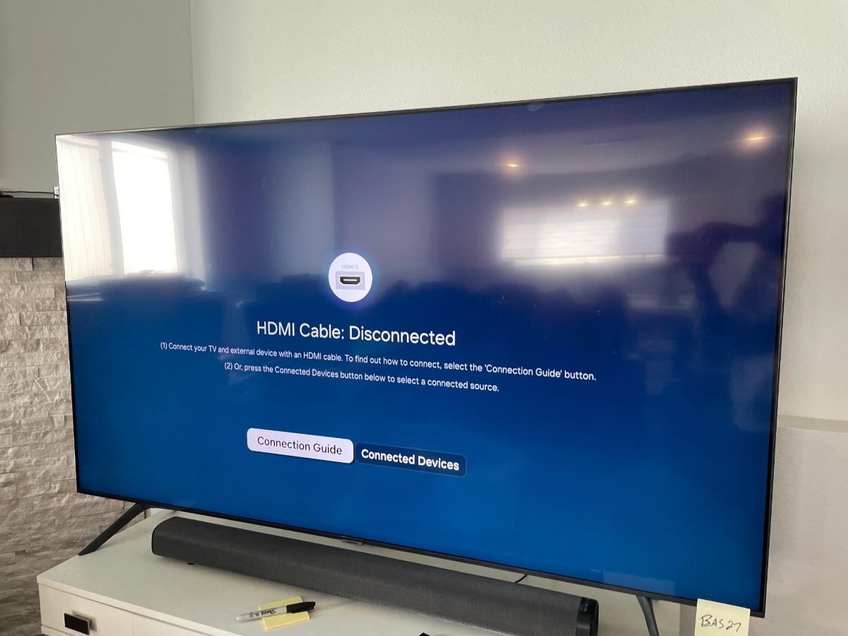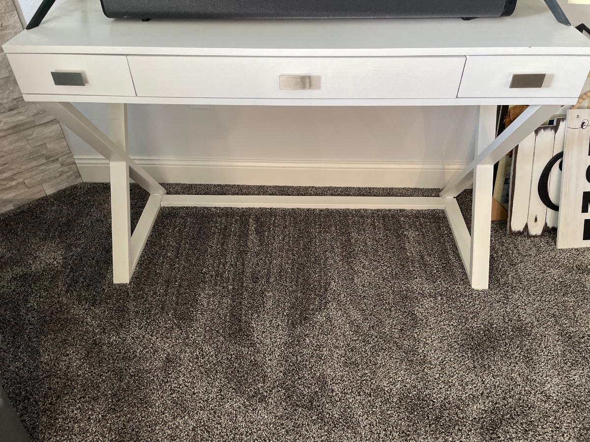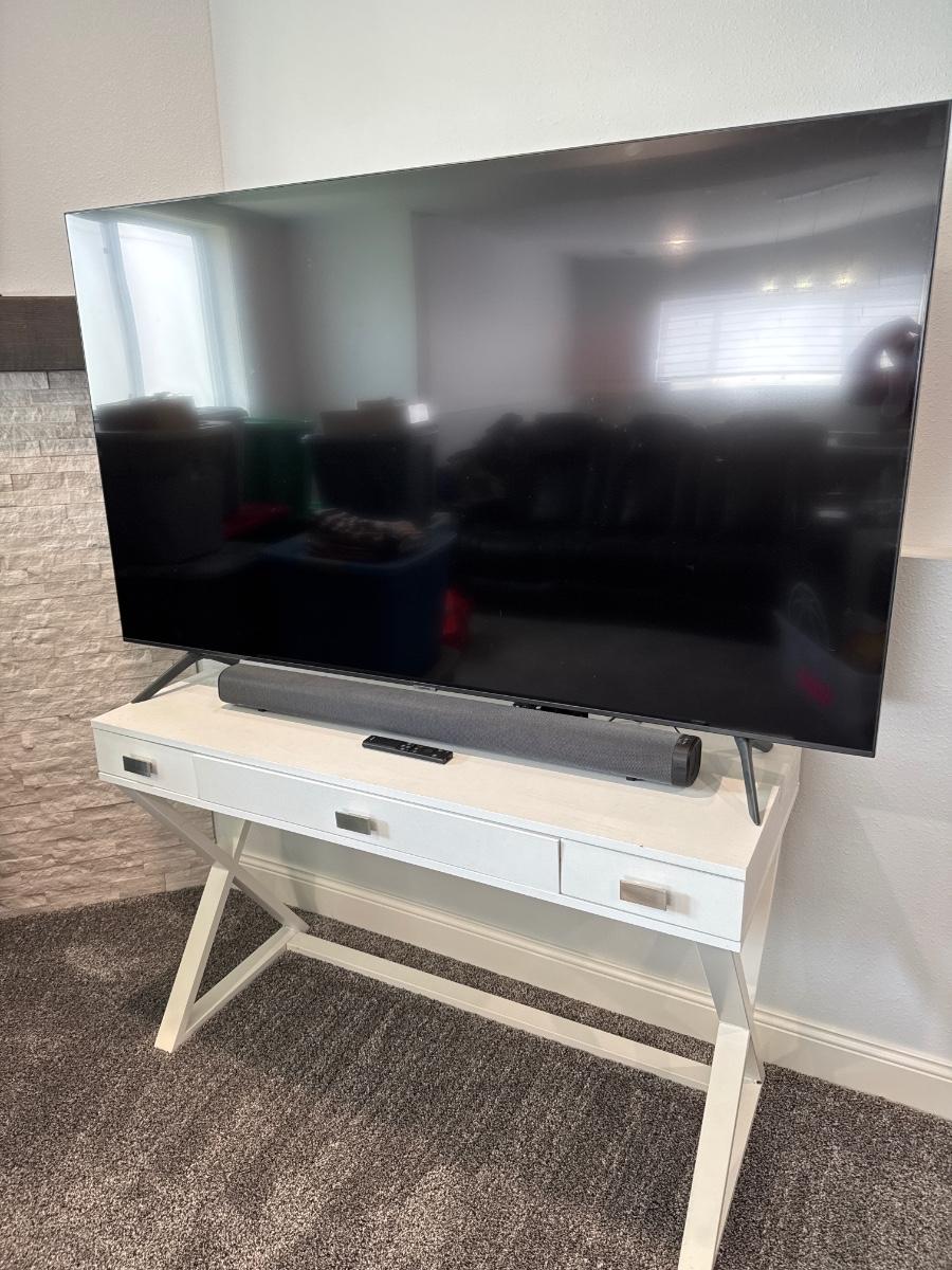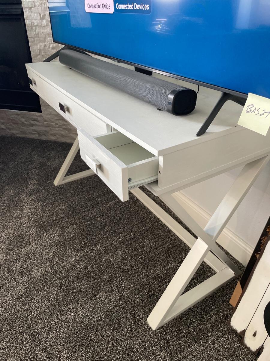 Samsung Smart TV with Topvision sound bar and super cute white desk/stand with 3 drawers 47” w x 20”’d x 30” t