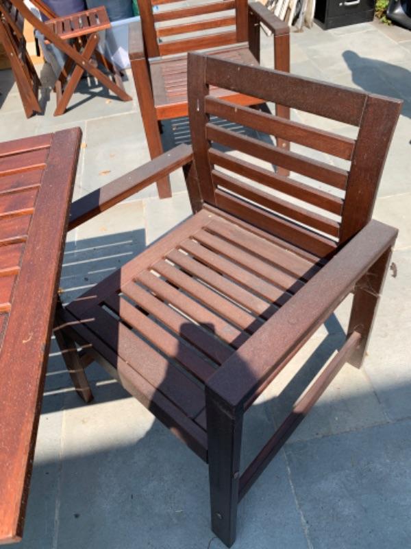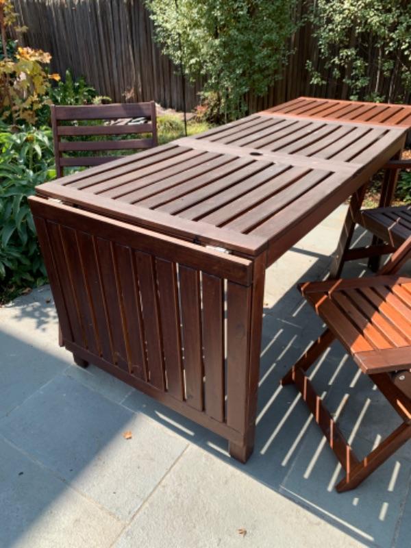 Teak picnic table with four chairs (folded: 55”x30”x28.5”; leaves measure 23.5” each)