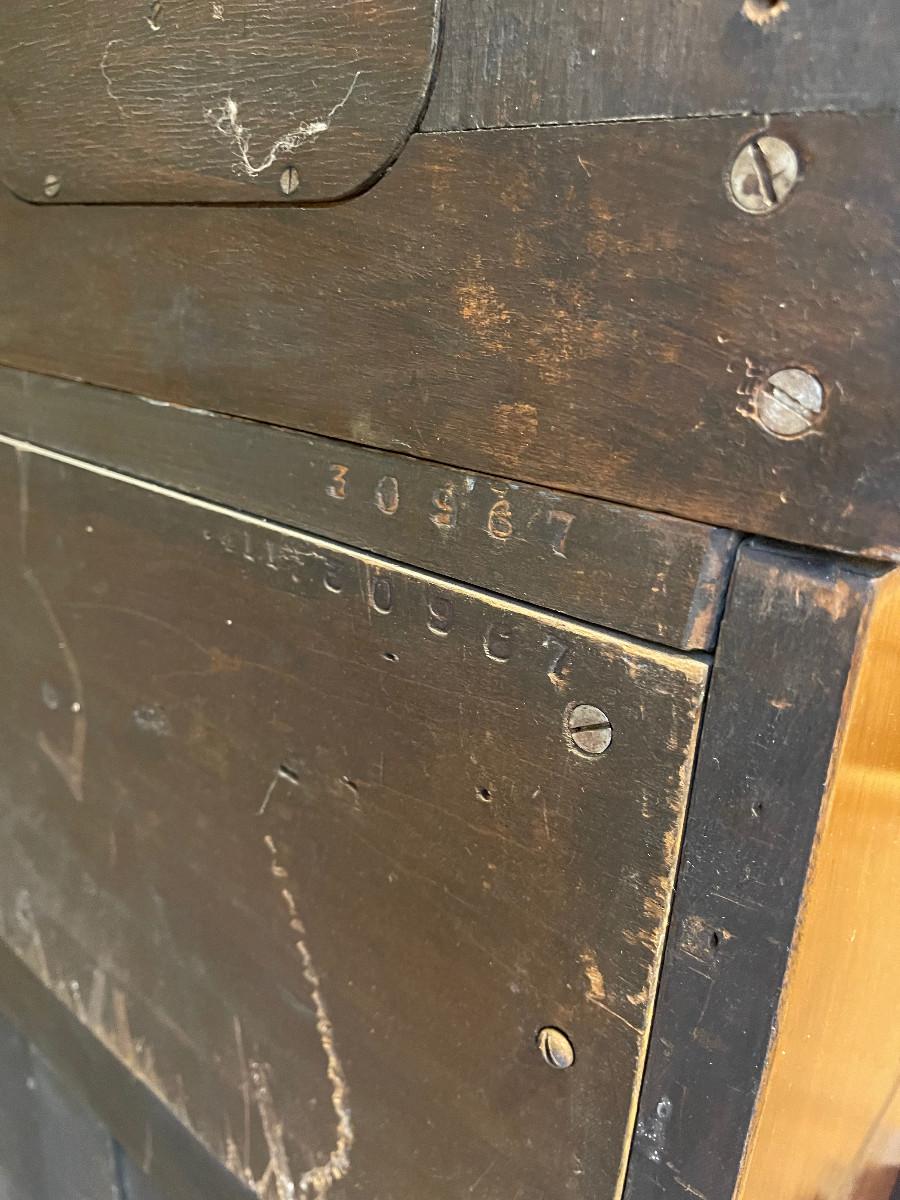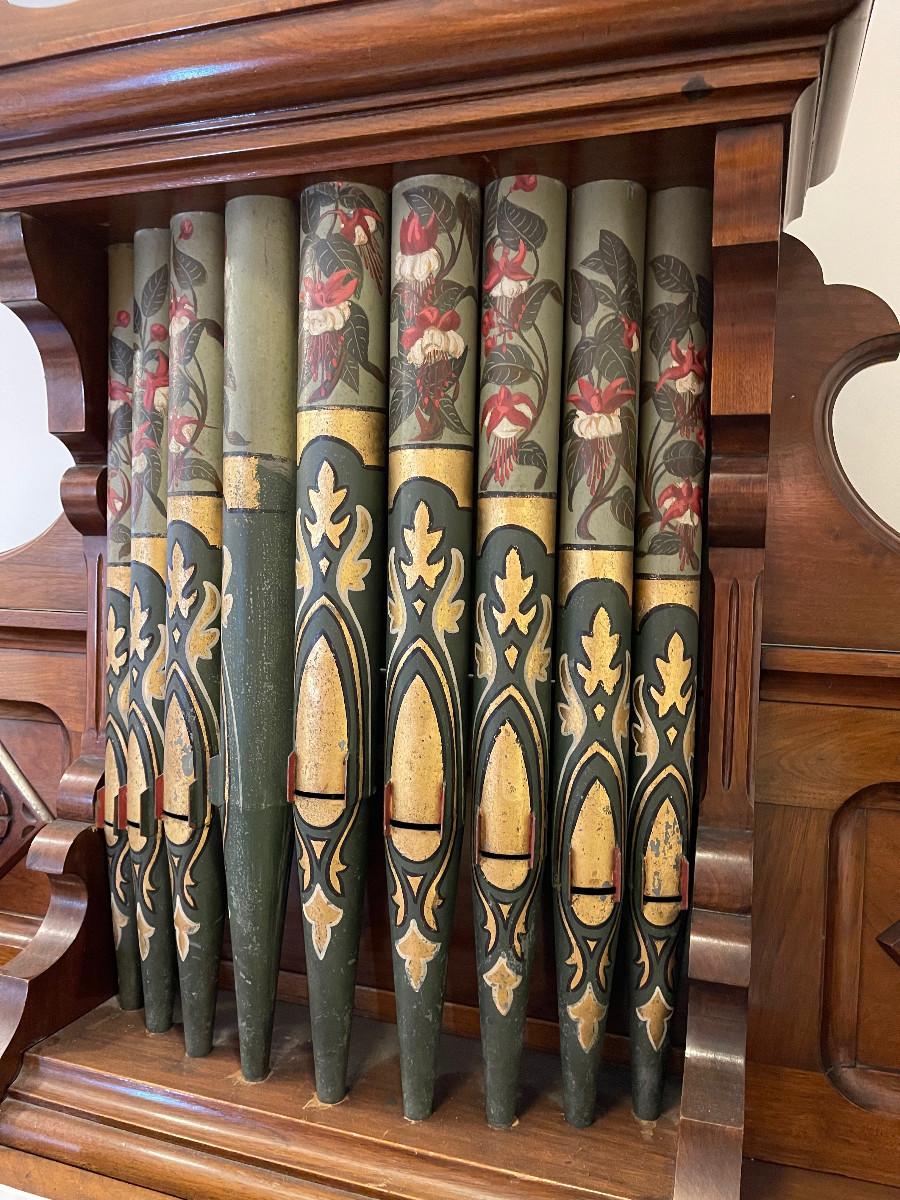 In working order! Circa 1890. Solid Walnut with Hand Painted Pipes.