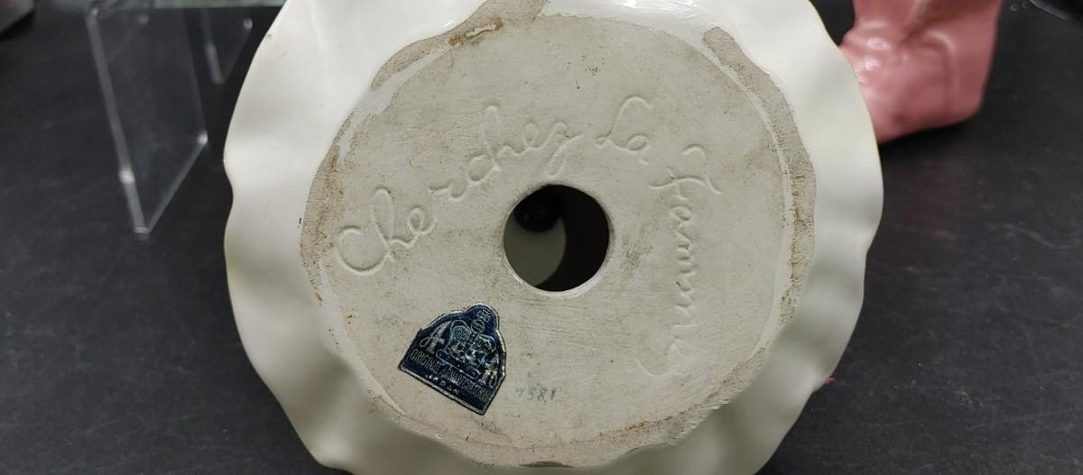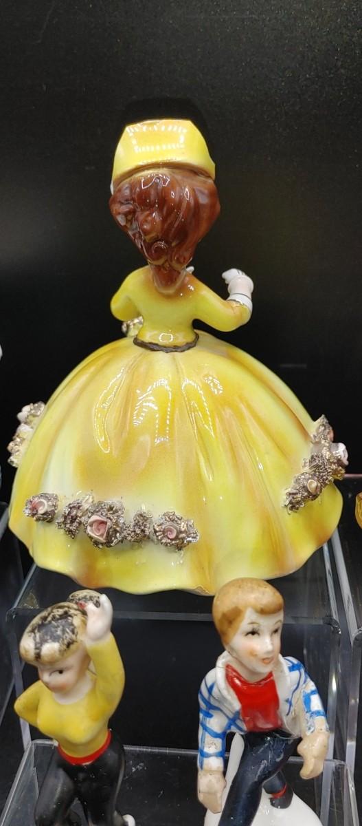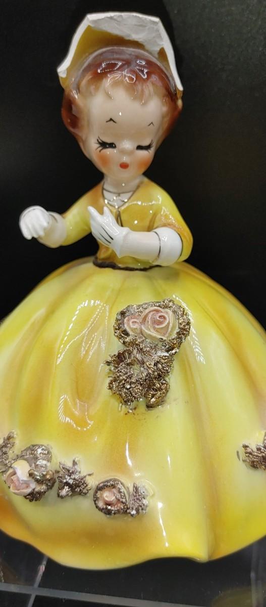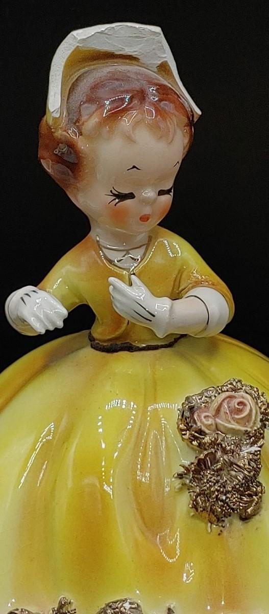 The Cherchez La Femme Southern Belle Figurine 4.5" Arnart Original in yellow dress has a broken bonnet.