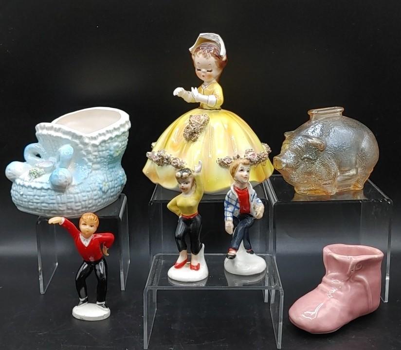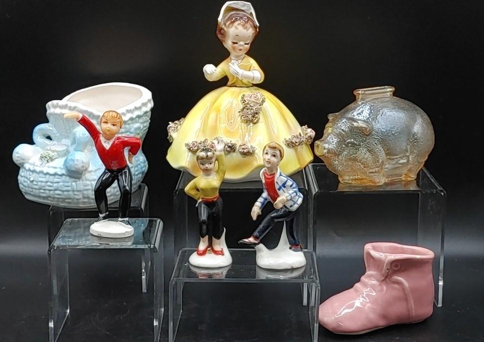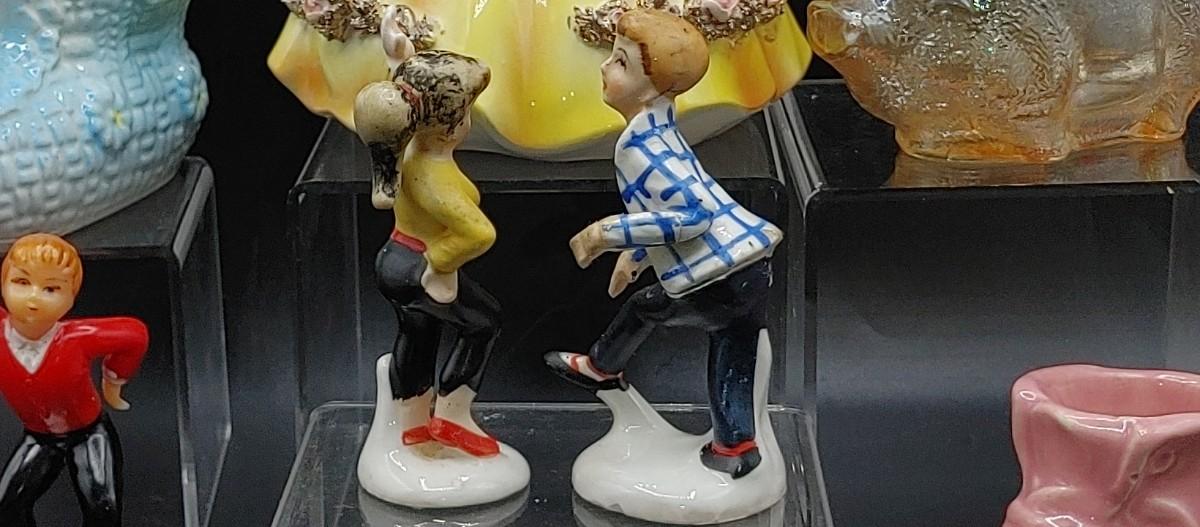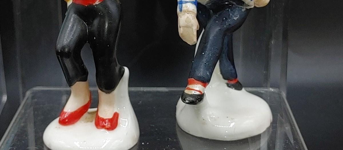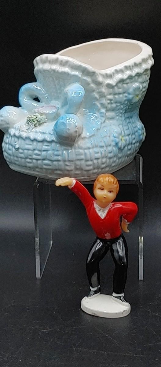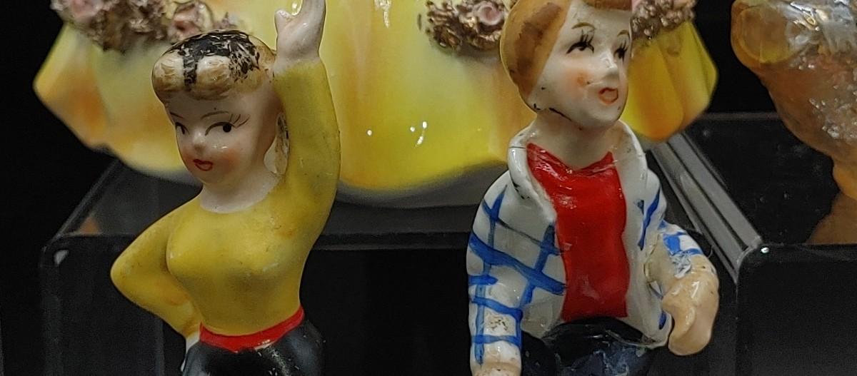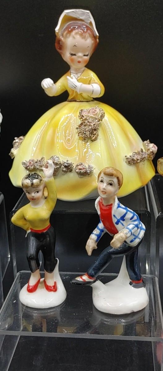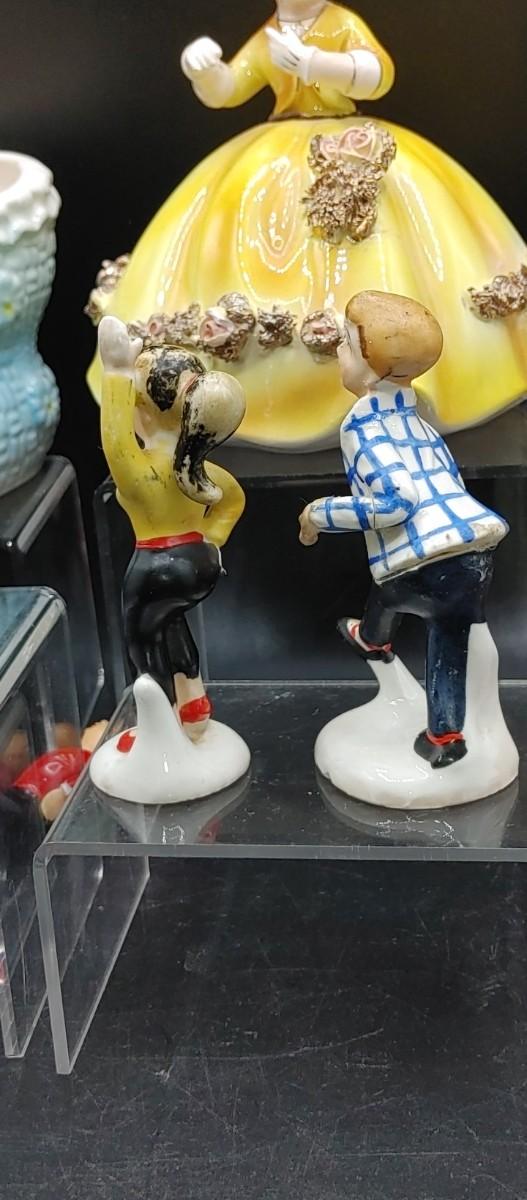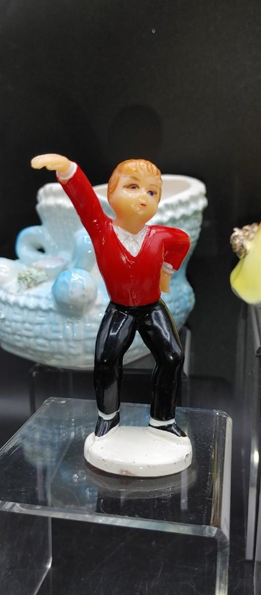 Not all the items in this lot are perfect...but too good through away. Two miniature porcelain vintage dancing teenagers the boy has been repaired. I figure with the red shirt is actually a vintage Wilton cake decoration. No flaws.