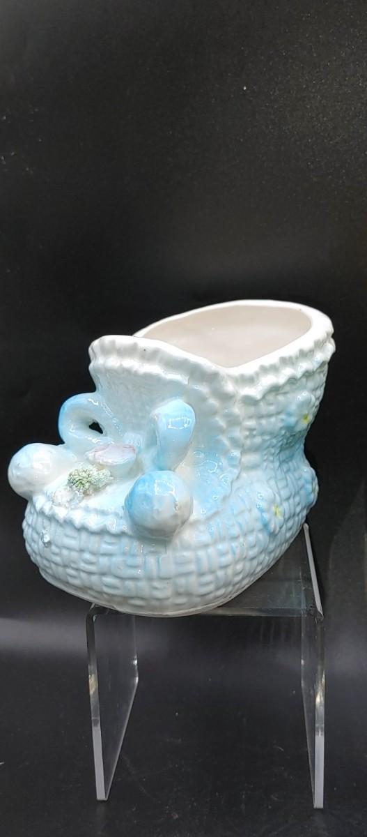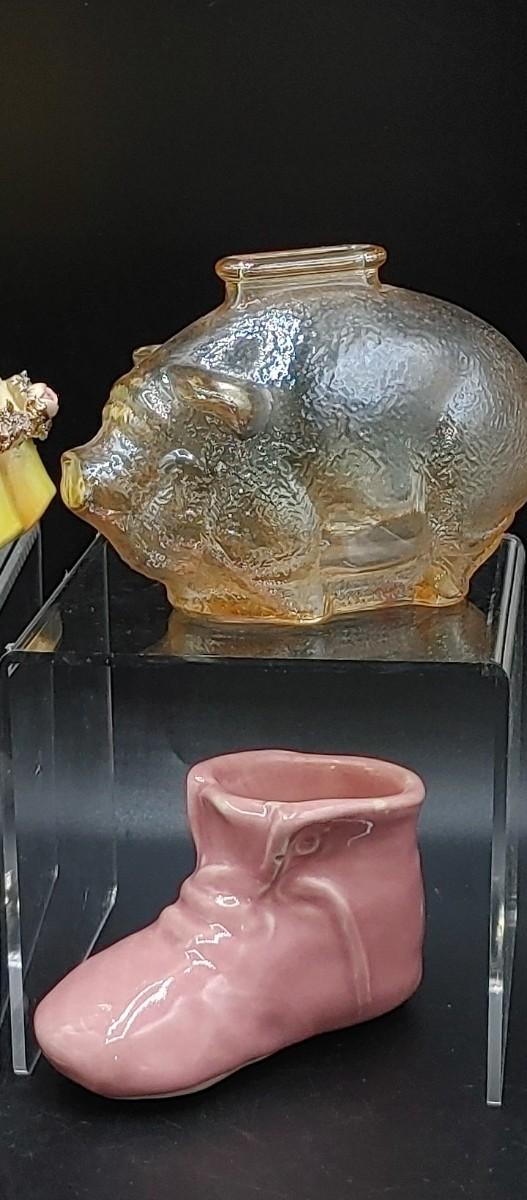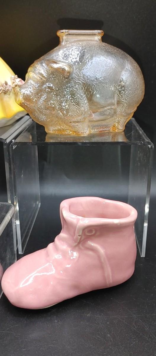 Iridescent vintage piggy bank is in great condition so is the blue ceramic planter & the pottery pink baby shoe.
