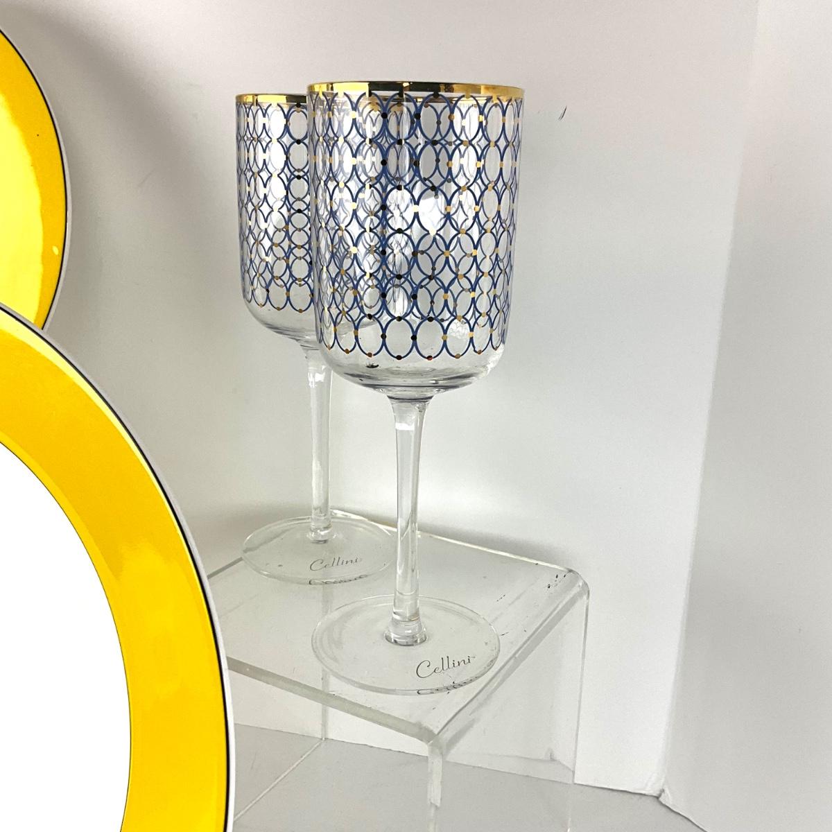 Set of 4 bowls measuring 6" diameter and two blue and gold wine goblets signed Cellini measuring 9" high