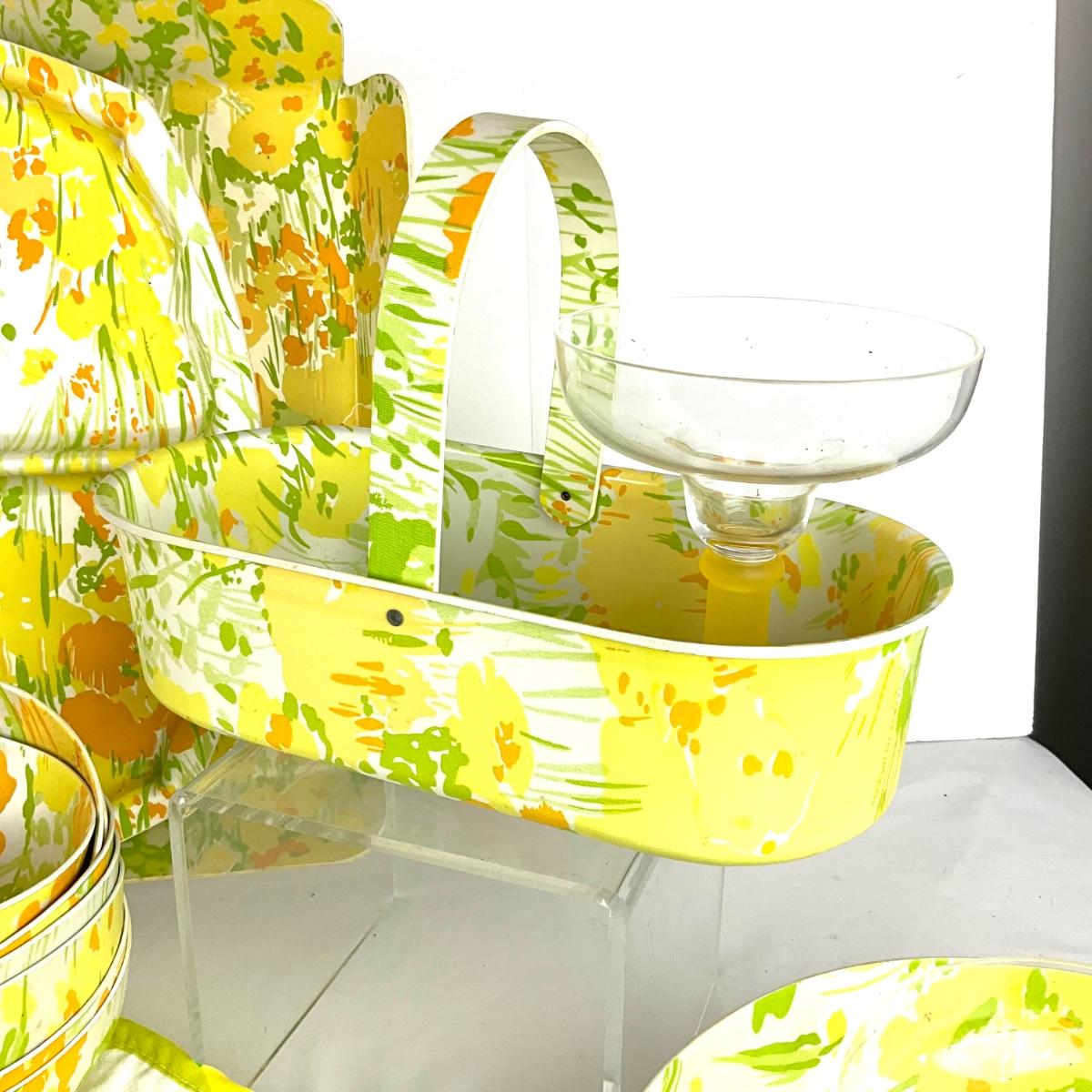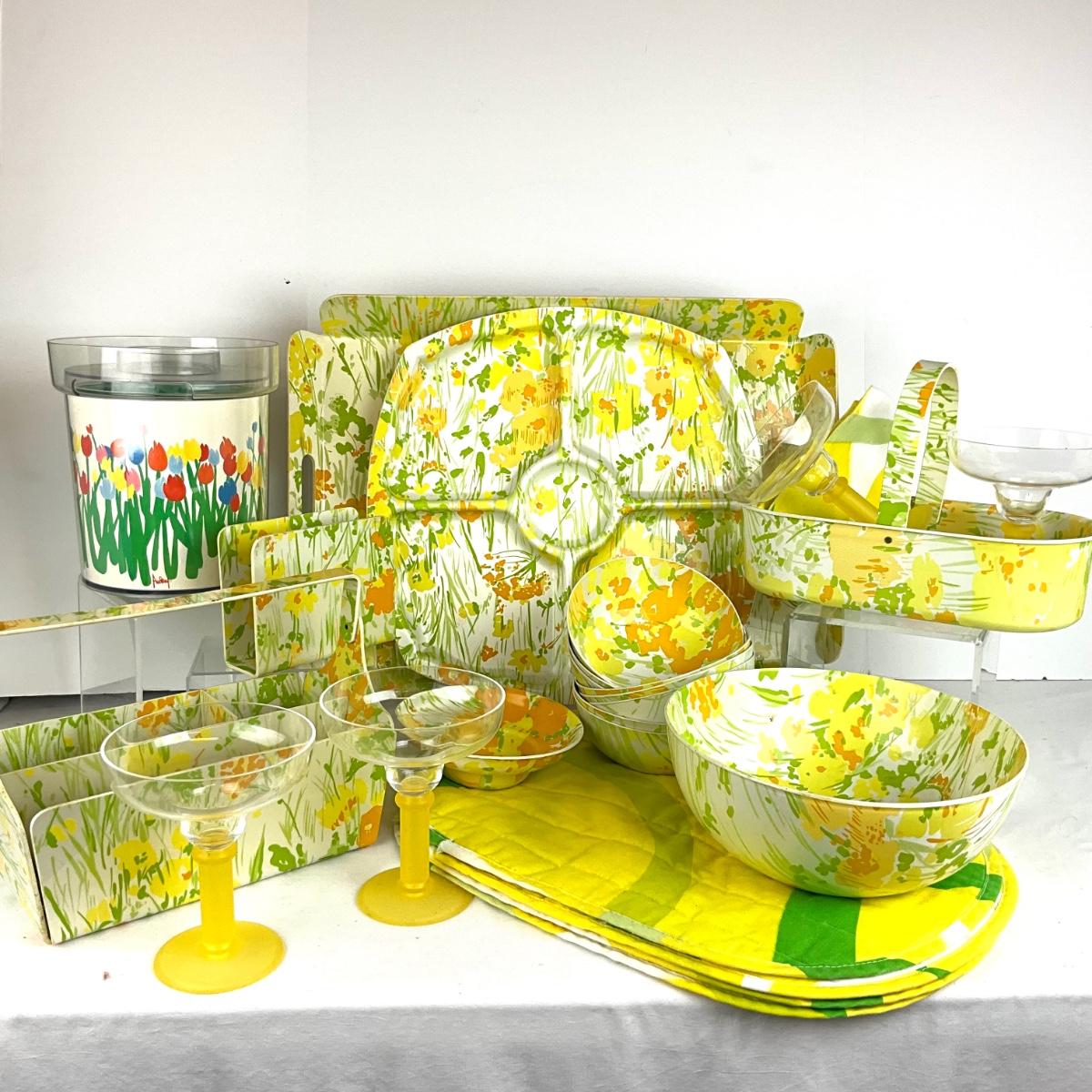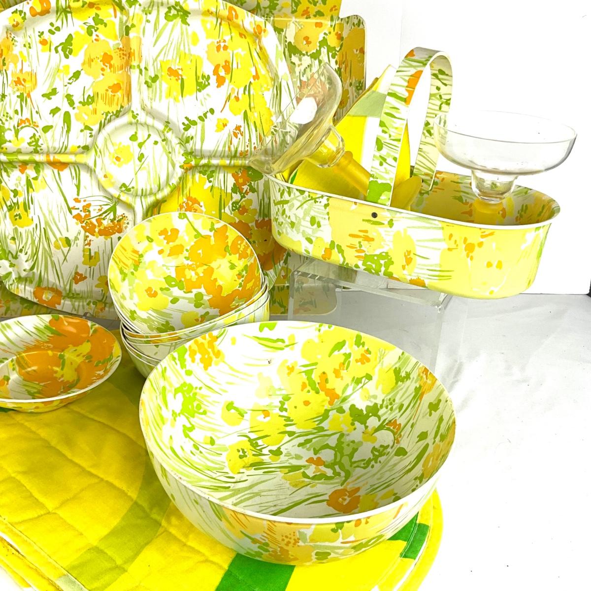 One icebucket by Audrey, One large tray measuring 21.5" x 16" , one square serving tray is 15.5" square, 4 plastic margarita glasses , napkin holder, handle utensil basket, 8- 6.25" diameter bowls, large 10.25" round serving bowl , 4 placemats and 6 napkins