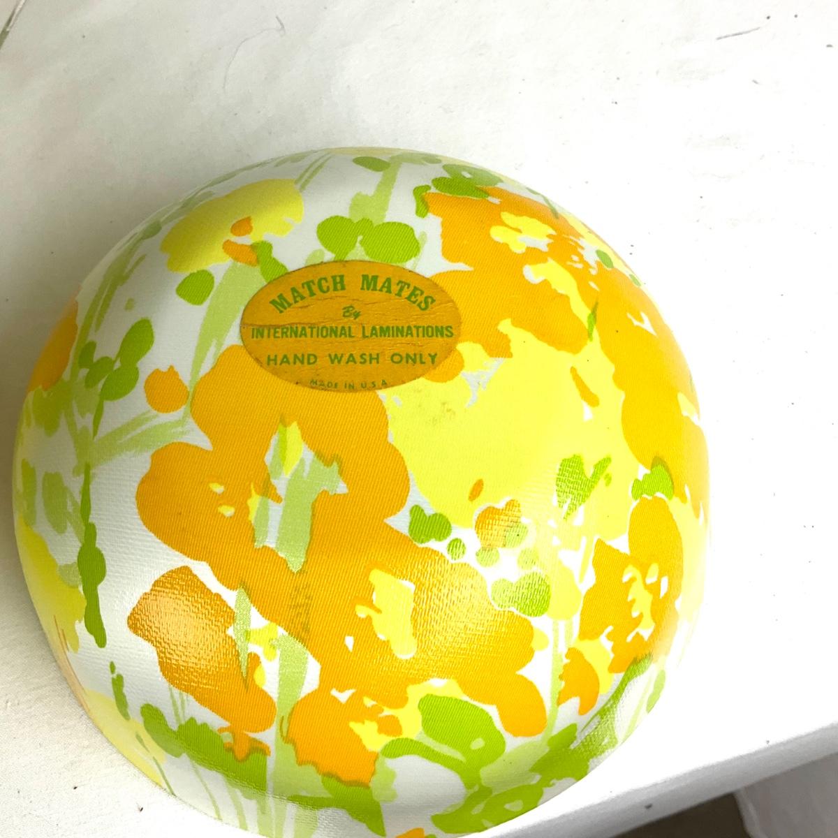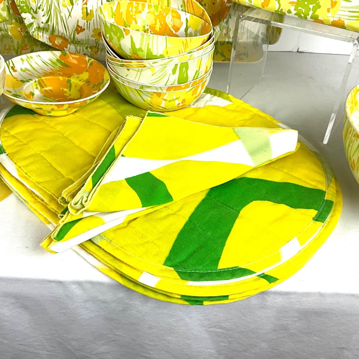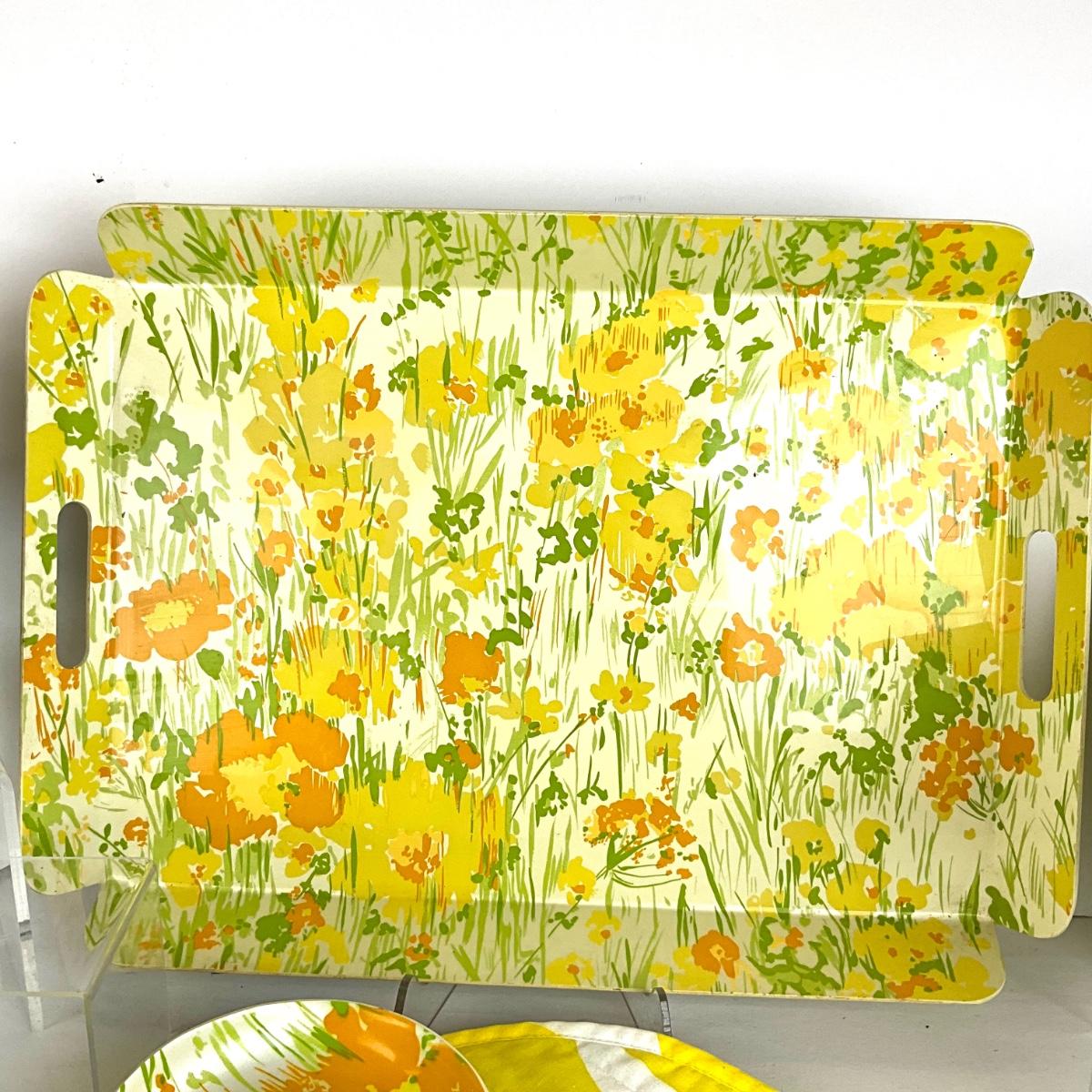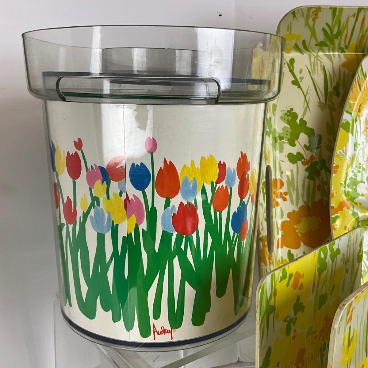 One icebucket by Audrey, One large tray measuring 21.5" x 16" , one square serving tray is 15.5" square, 4 plastic margarita glasses , napkin holder, handle utensil basket, 8- 6.25" diameter bowls, large 10.25" round serving bowl , 4 placemats and 6 napkins