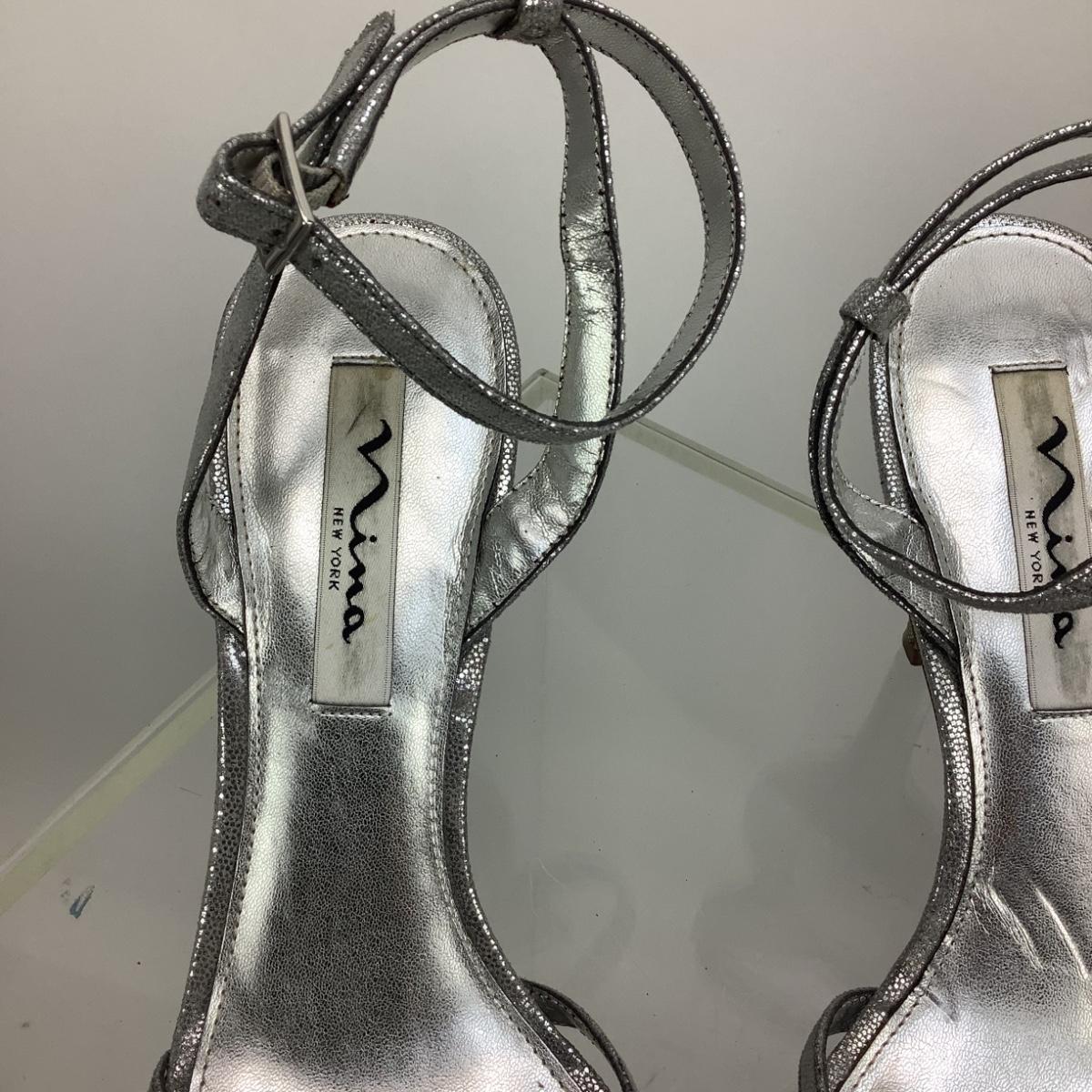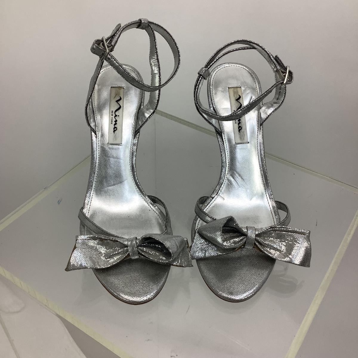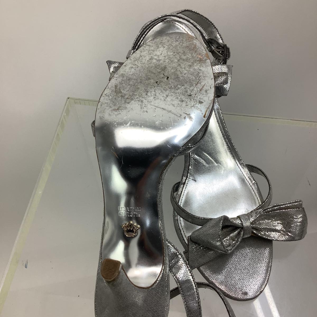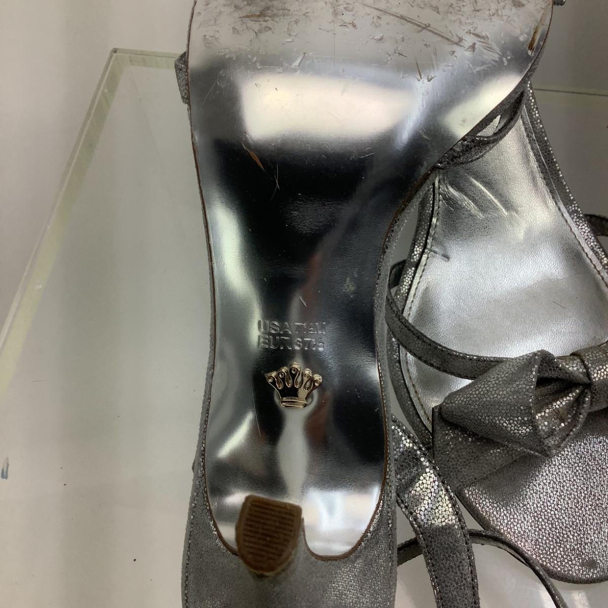 The heels have straps that go around the ankle, size 7.5, signs of use and wear.