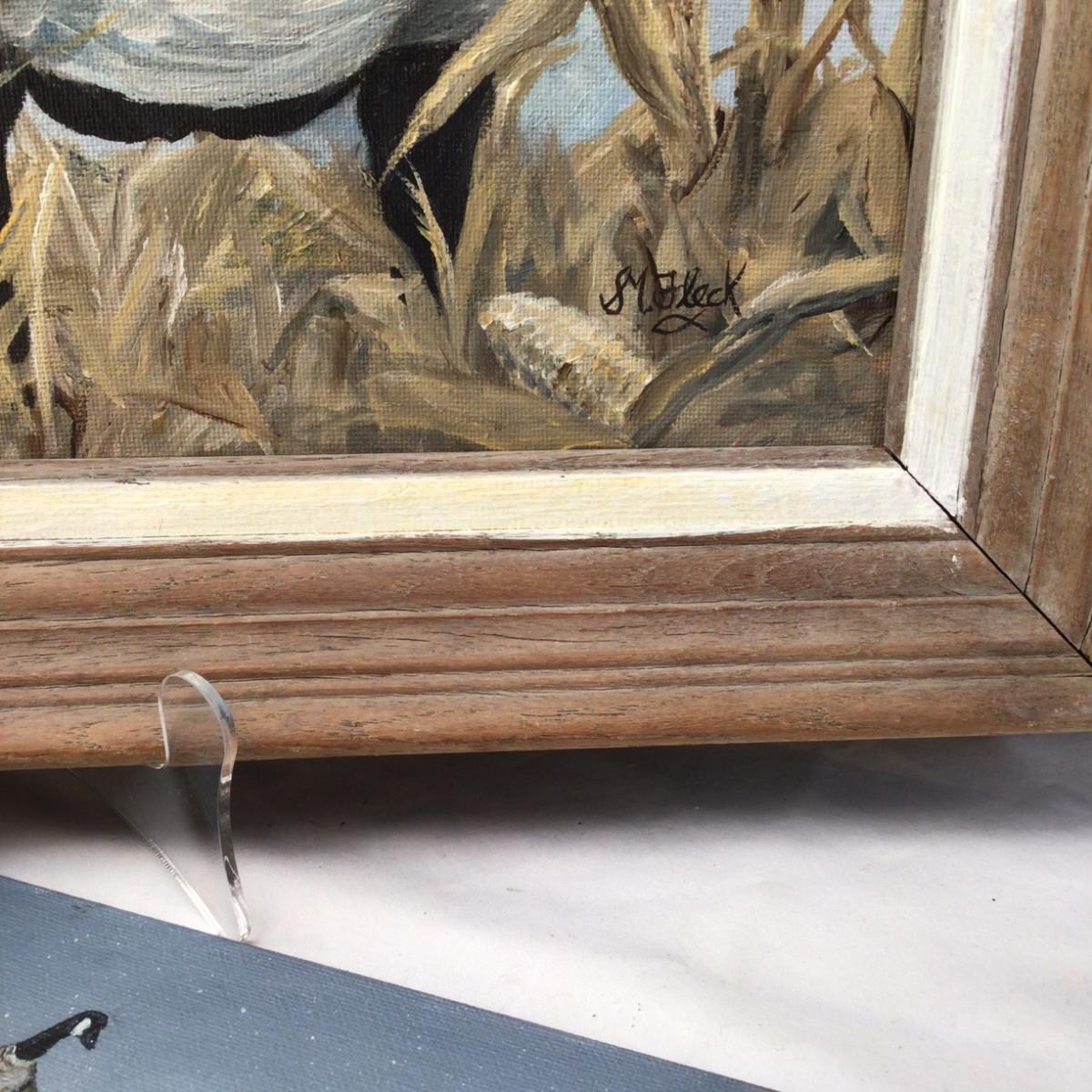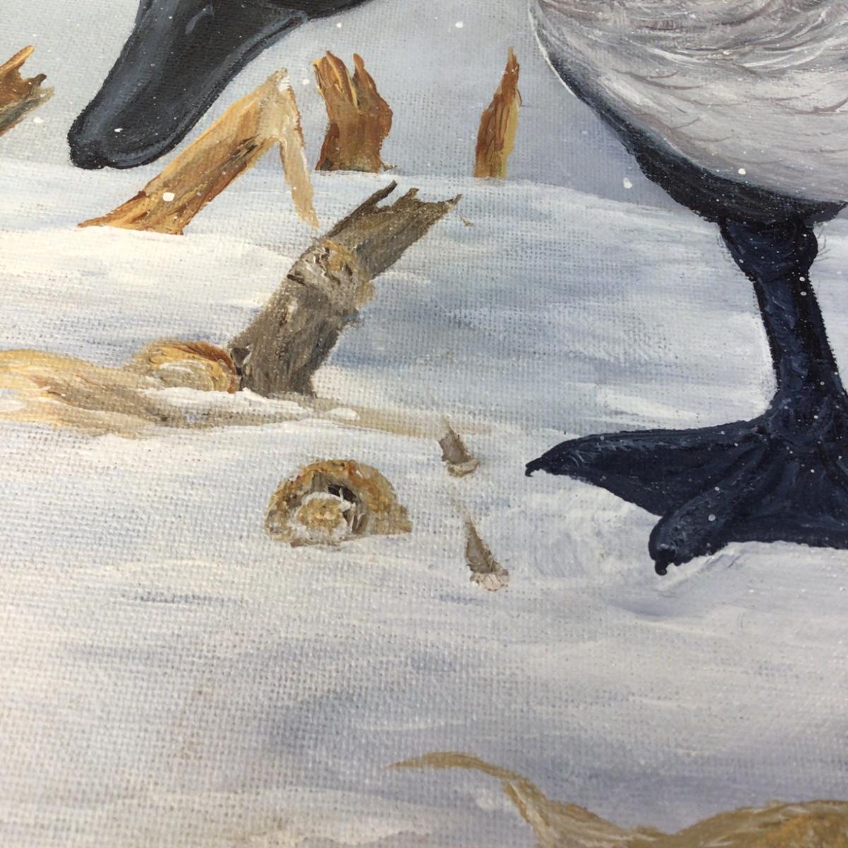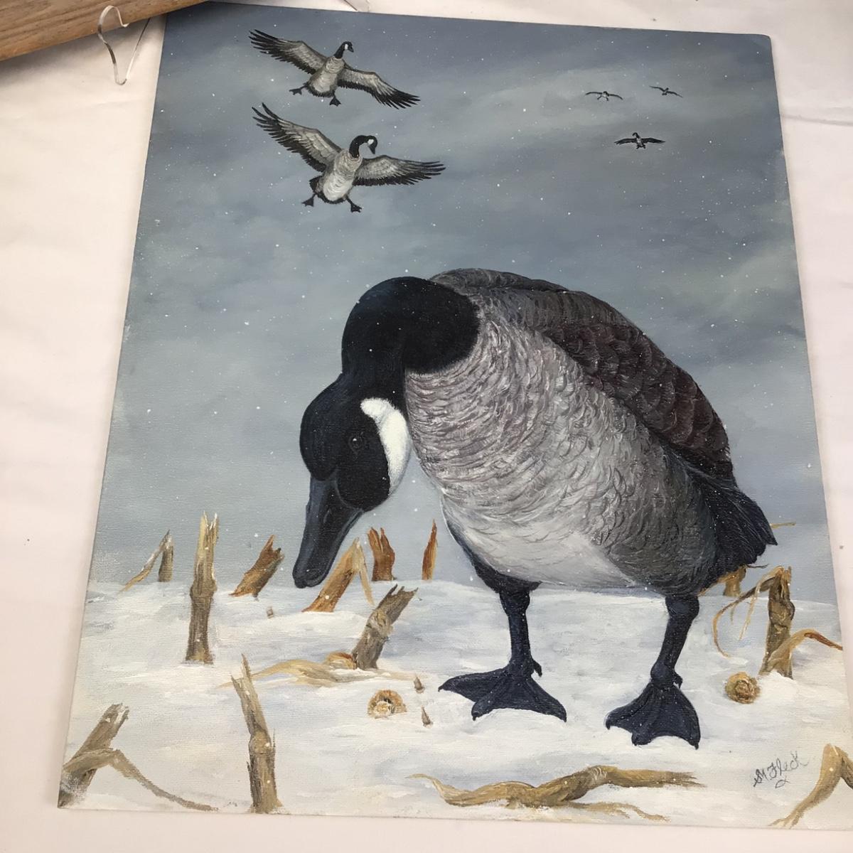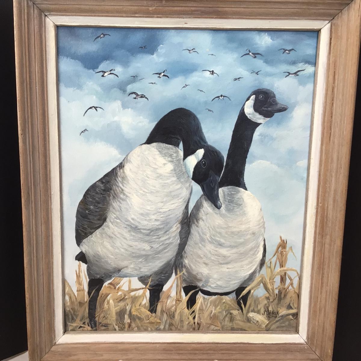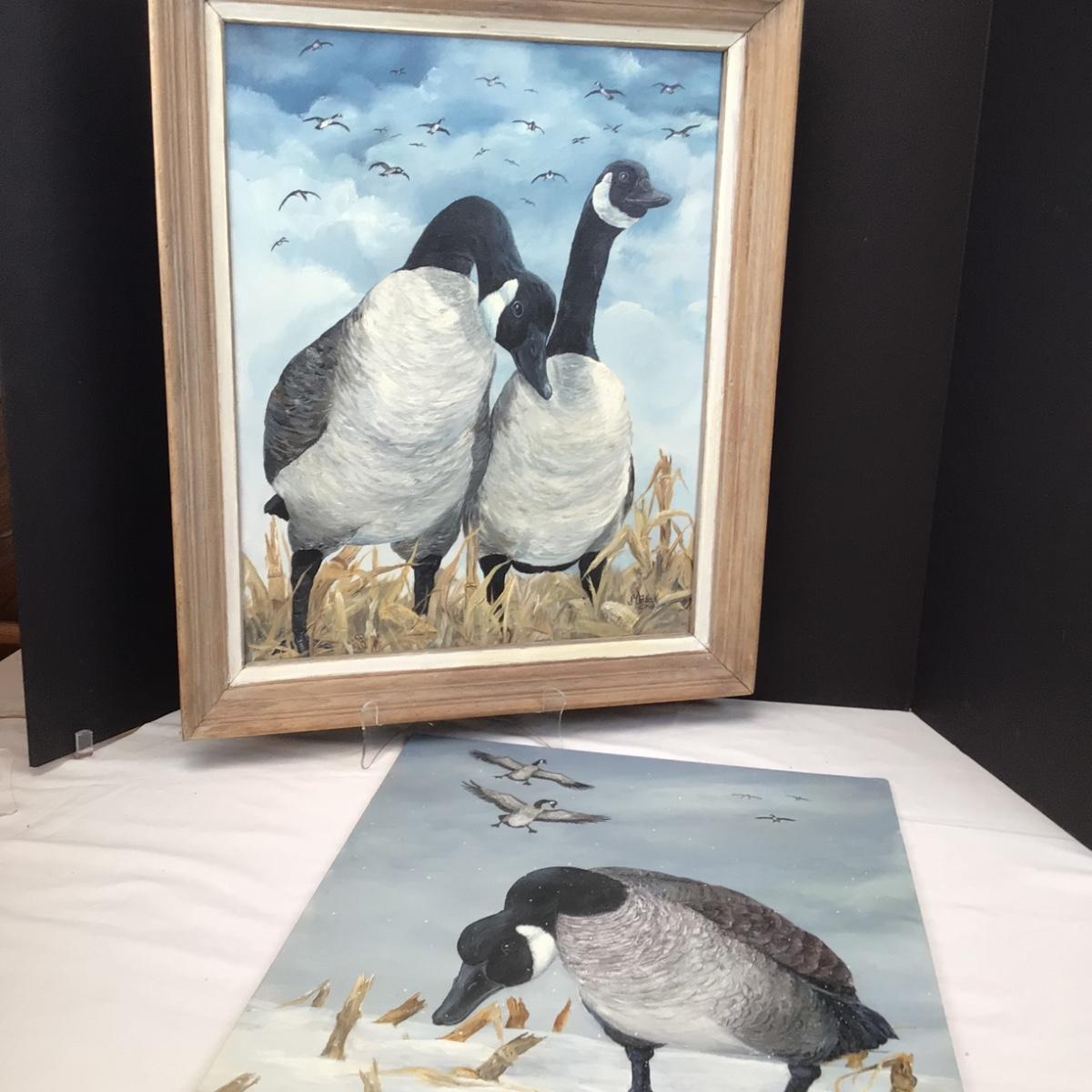 Th framed geese measure 24” x 20, the painting on board is 20” x 16” and there are a few small spots of damage.