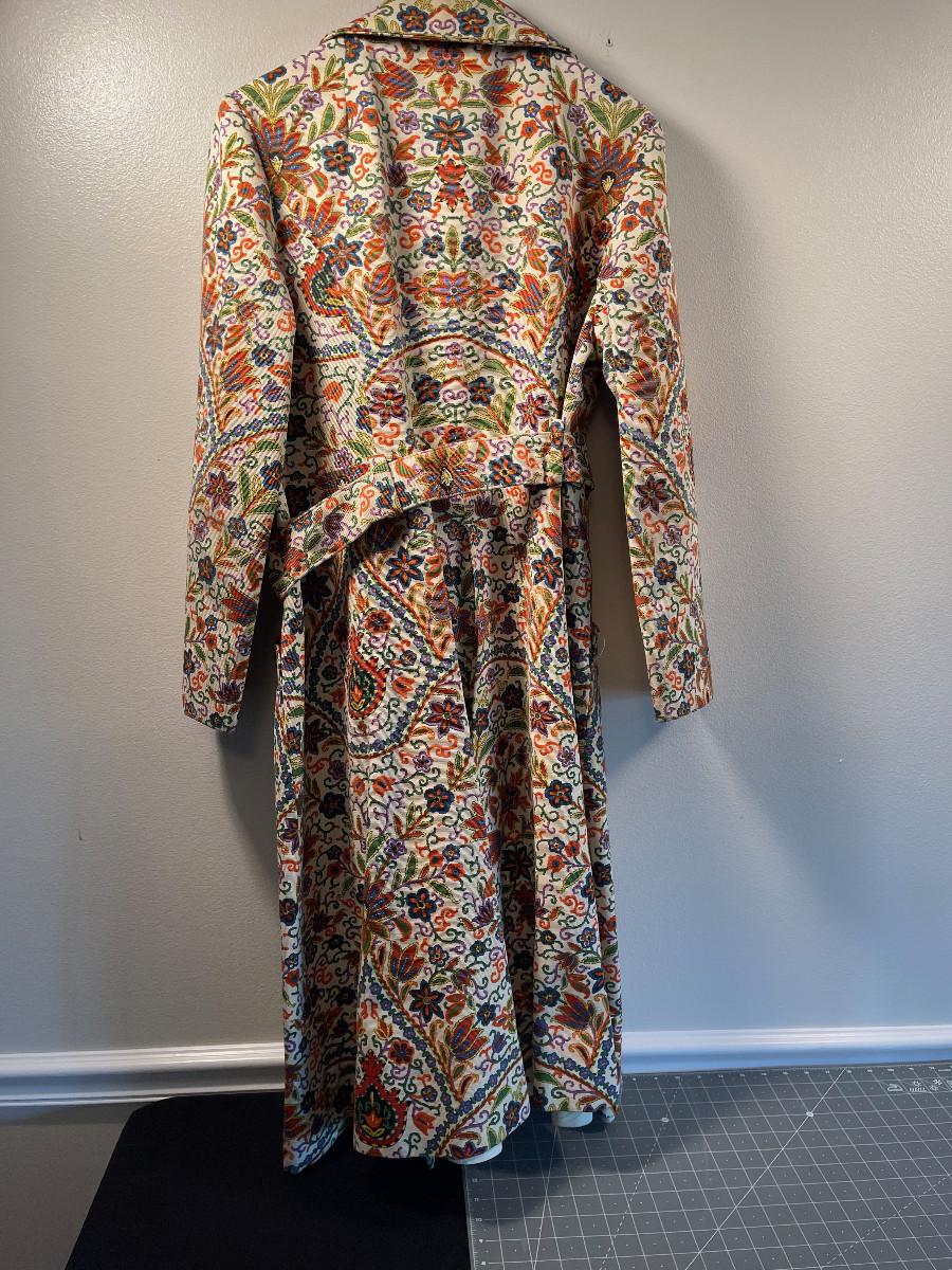 Hard to Find! Satin Lining and a Belt, Shows wear. With Matching Belt. 38" Chest 29" Waist, Shoulders 16", Sleeve 22" Collar to Hem 44"