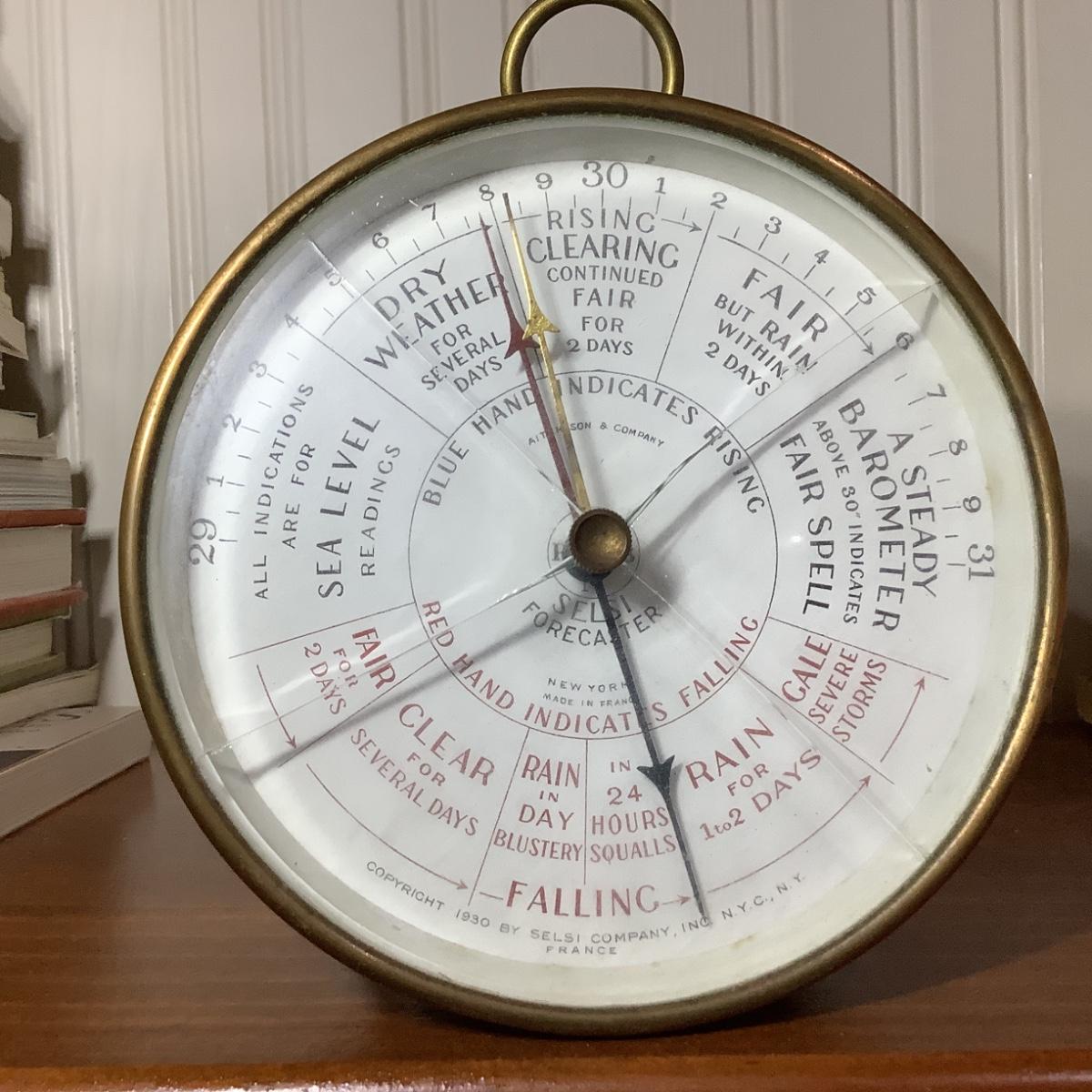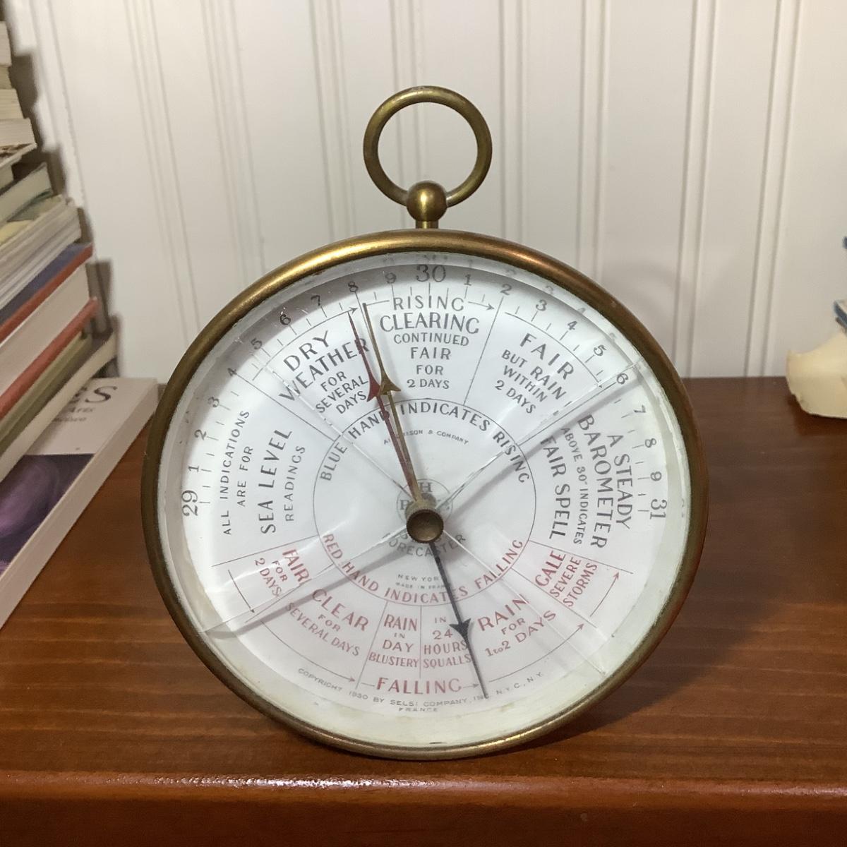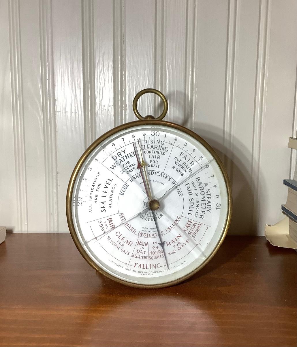 Made in France 1929 Back of barometer is marked PHNB. Barometer features weather forecasts printed on the dial, measures 5" diameter x 2" deep ( clear plastic front is cracked) can be repaired