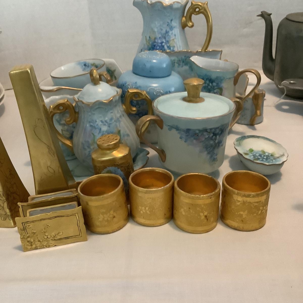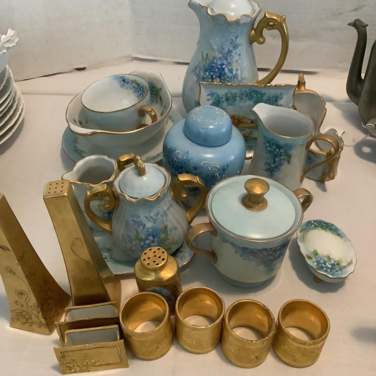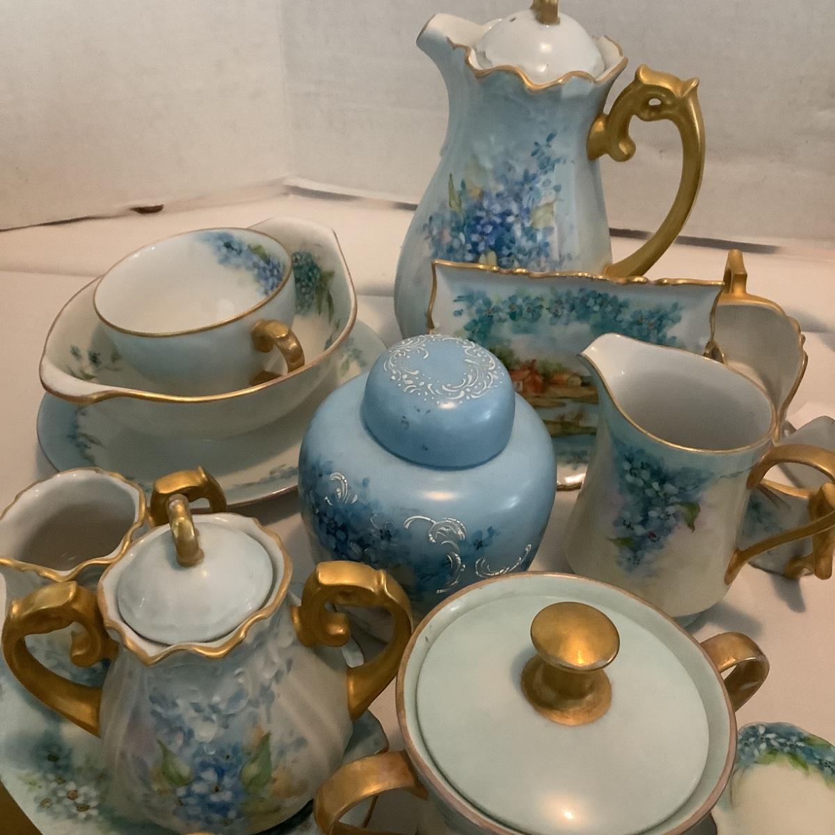 The lot contains porcelain dishes hand painted by Gladys Freeman. Assorted dishes including tea pot, ginger jar, gravy boat and more.