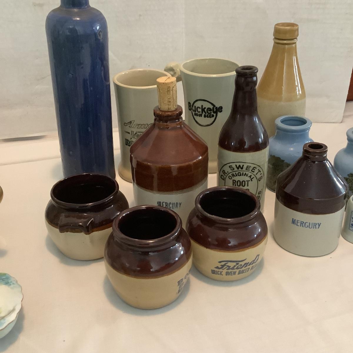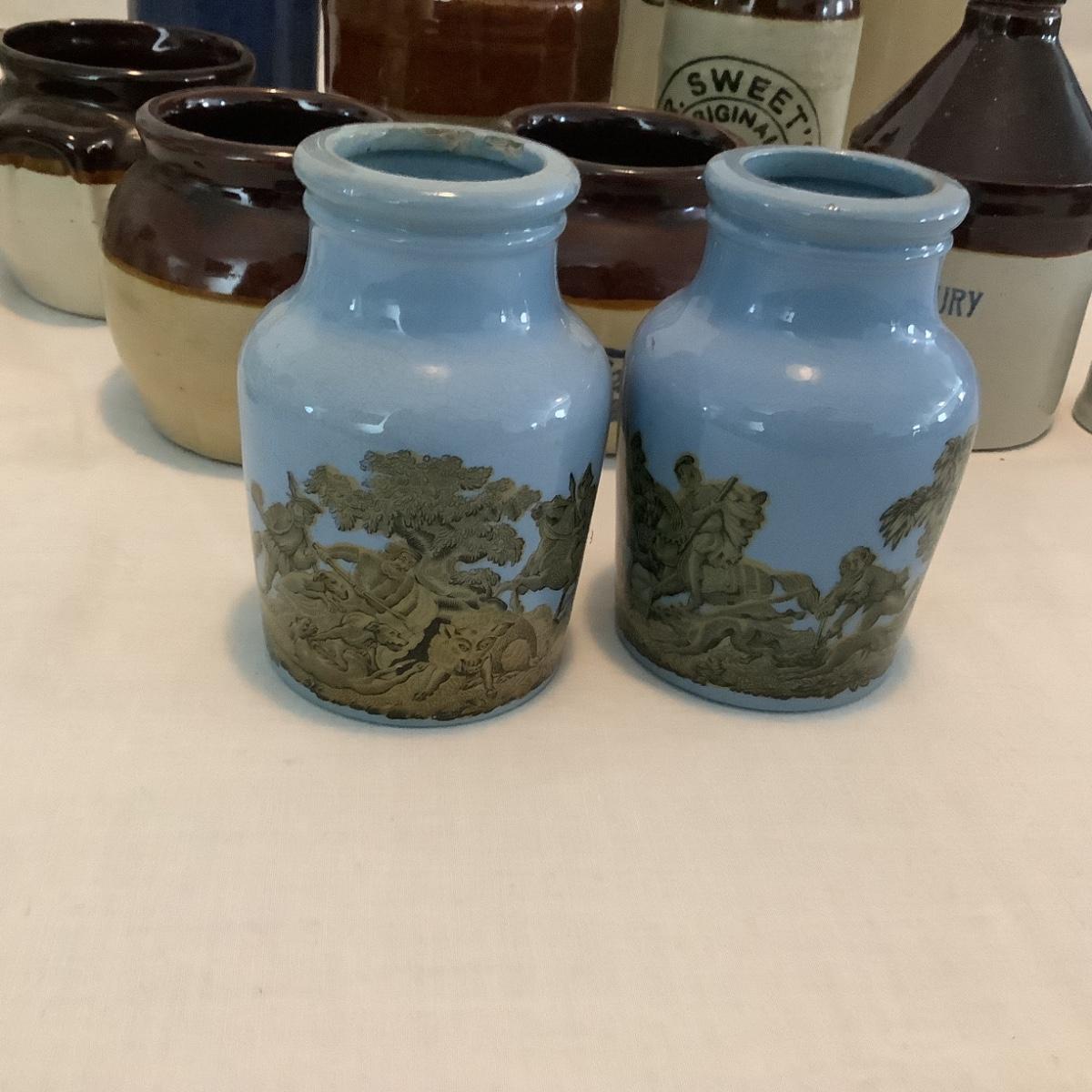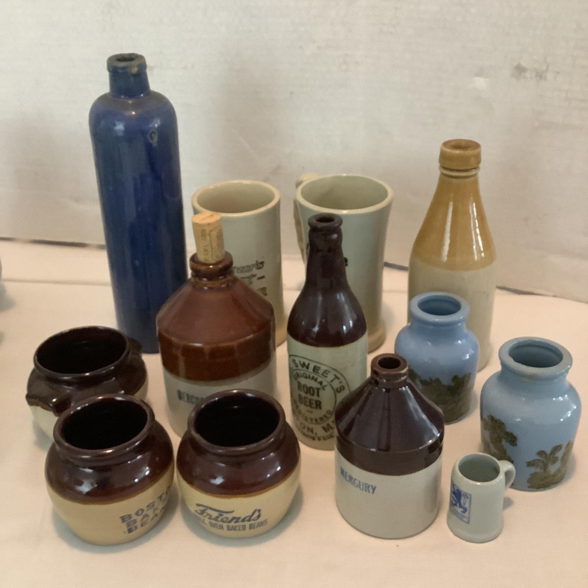 Assorted vintage crocks, most with advertising, there are also 2 antique Prattware mustard jars.