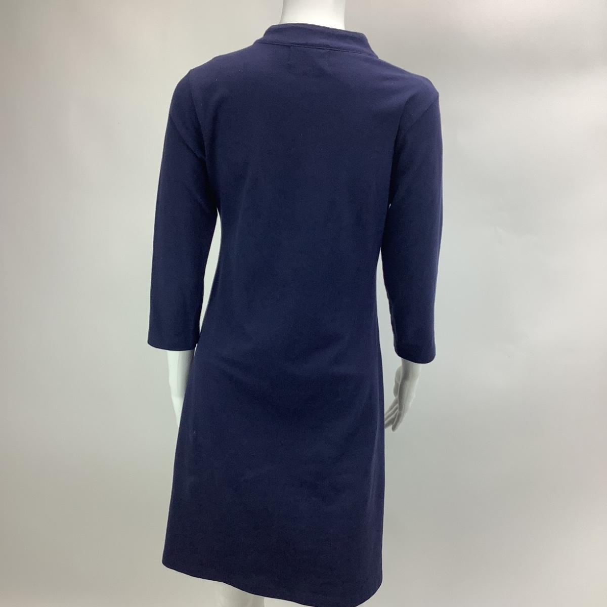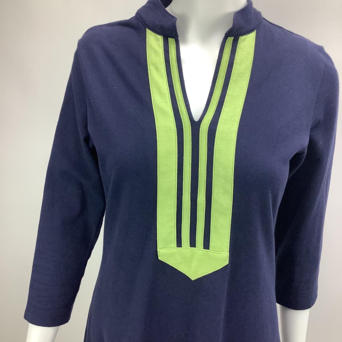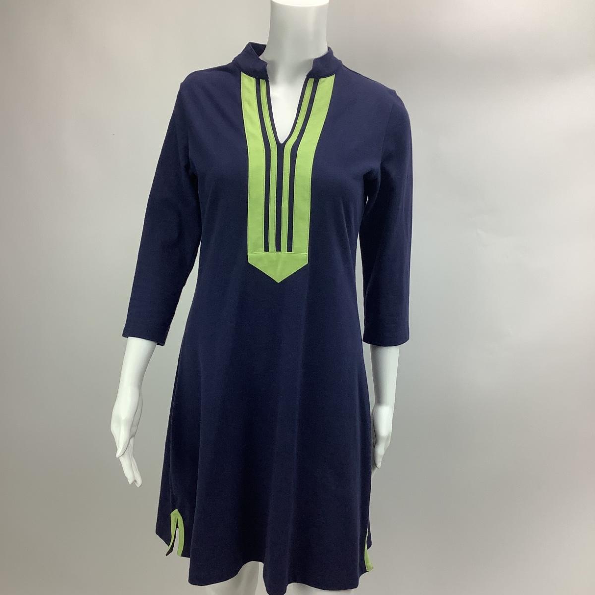 Navy blue dress with lime green details, 3/4 length sleeve, size small. Measures: