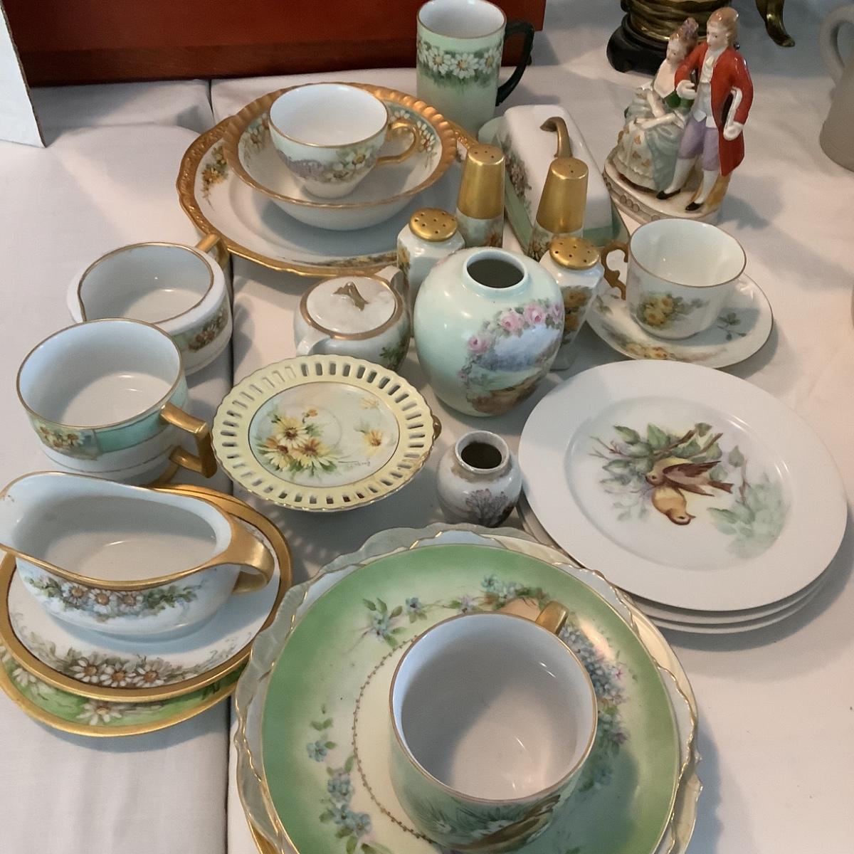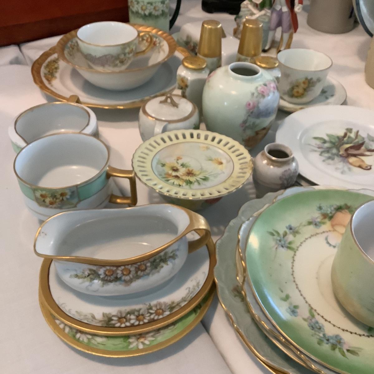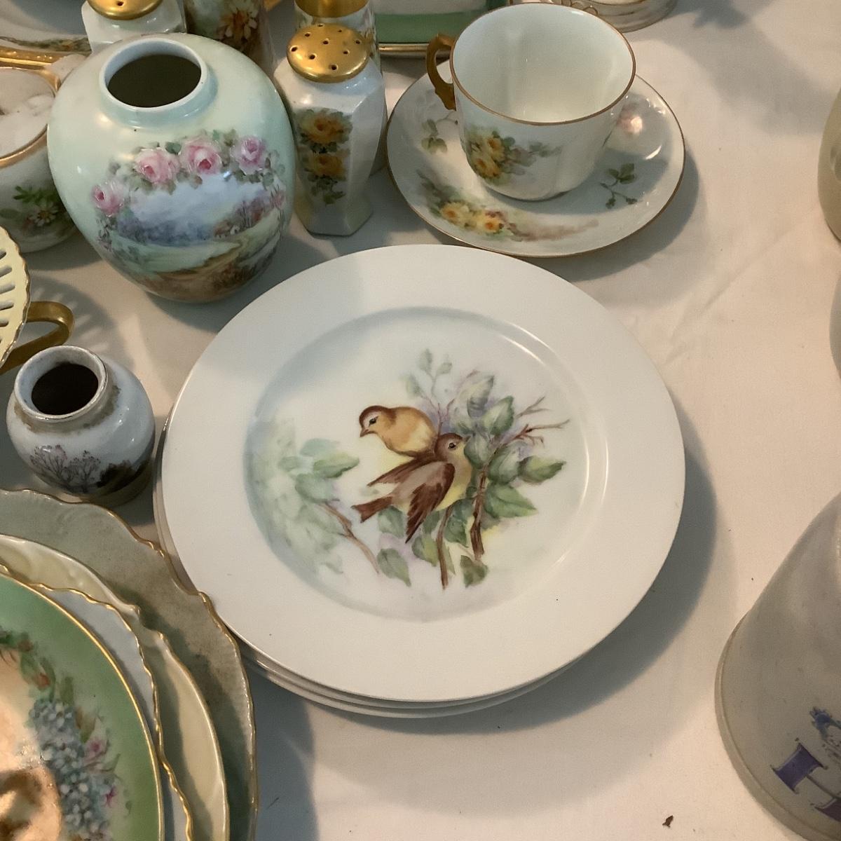 Assorted porcelain dishes, some are hand-painted by Gladys Freeman.