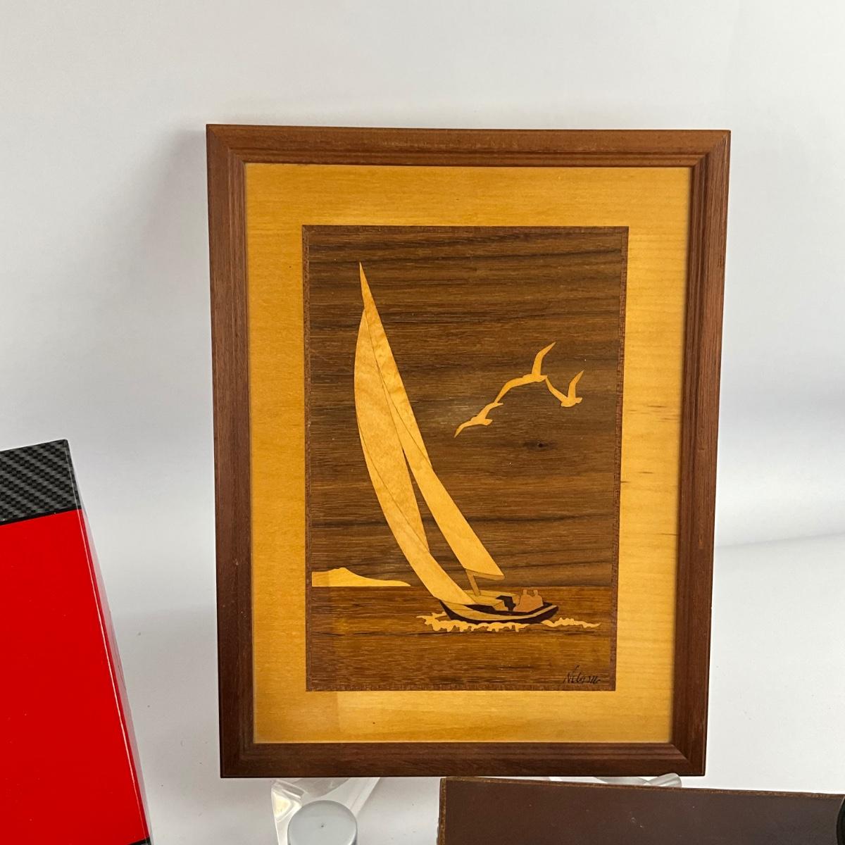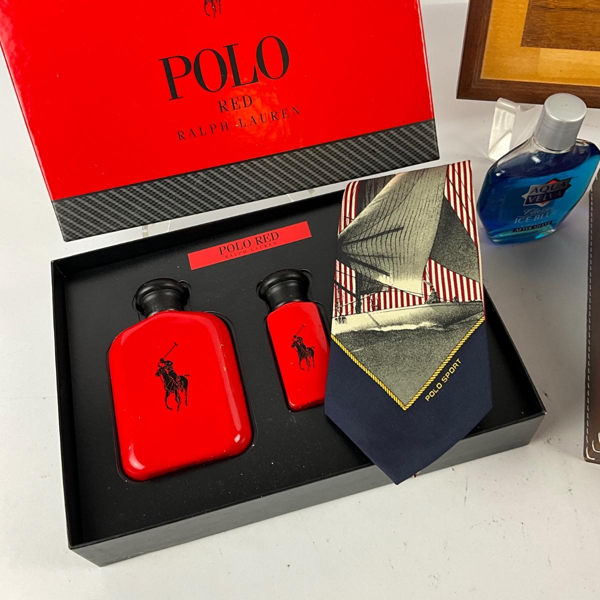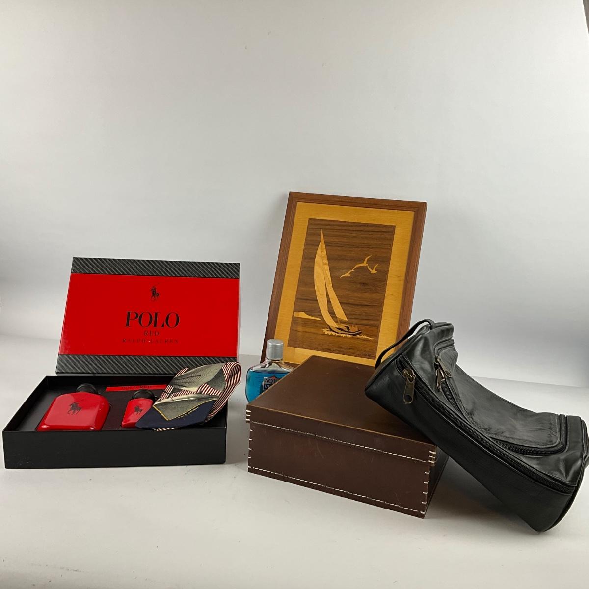 657 Ralph Lauren Polo Red with Leather Travel Bag , Marquetry Sailboat Art and Tie
