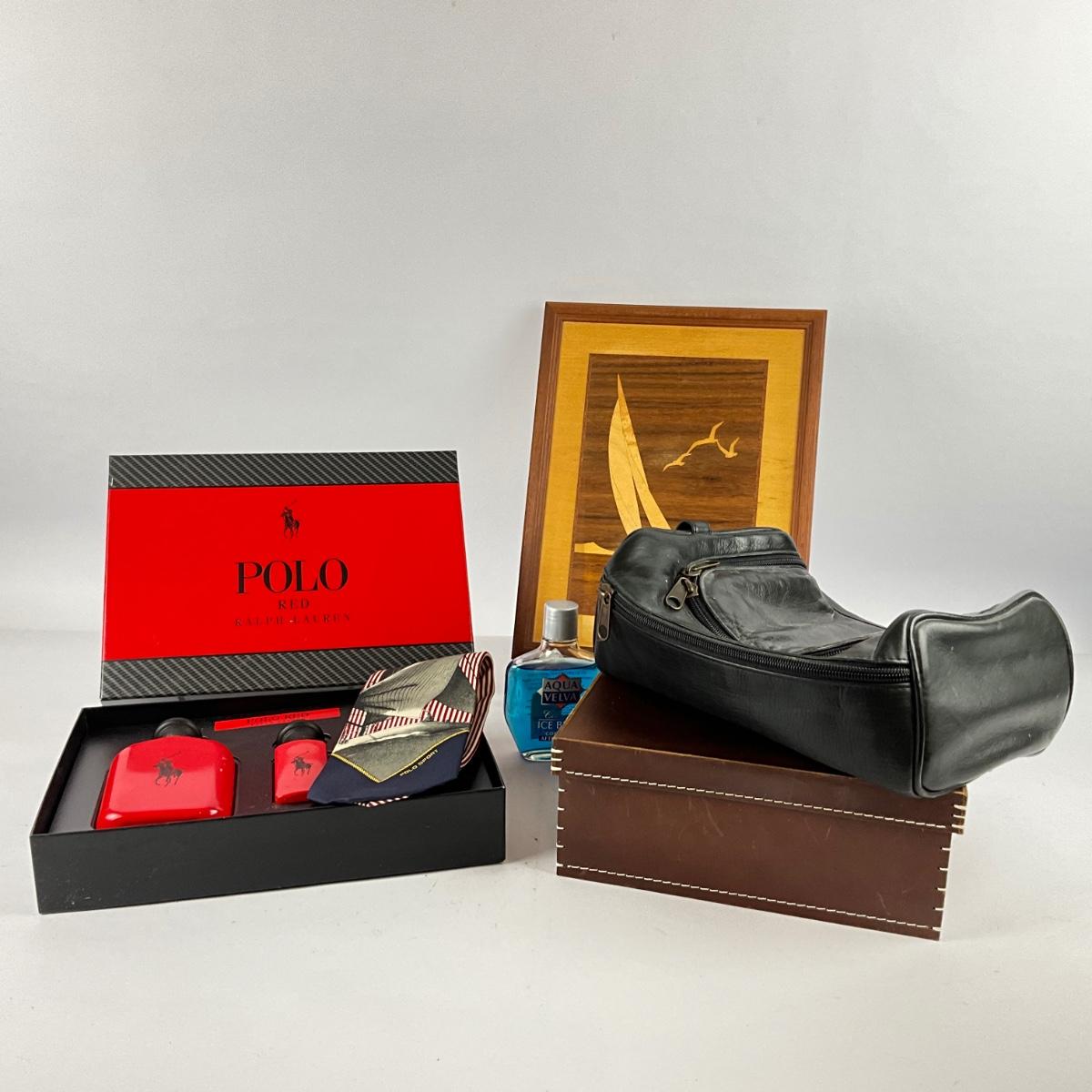 Ralph lauren sailing tie and leather box , leather travel bag with full bottle of Aqua Velvet